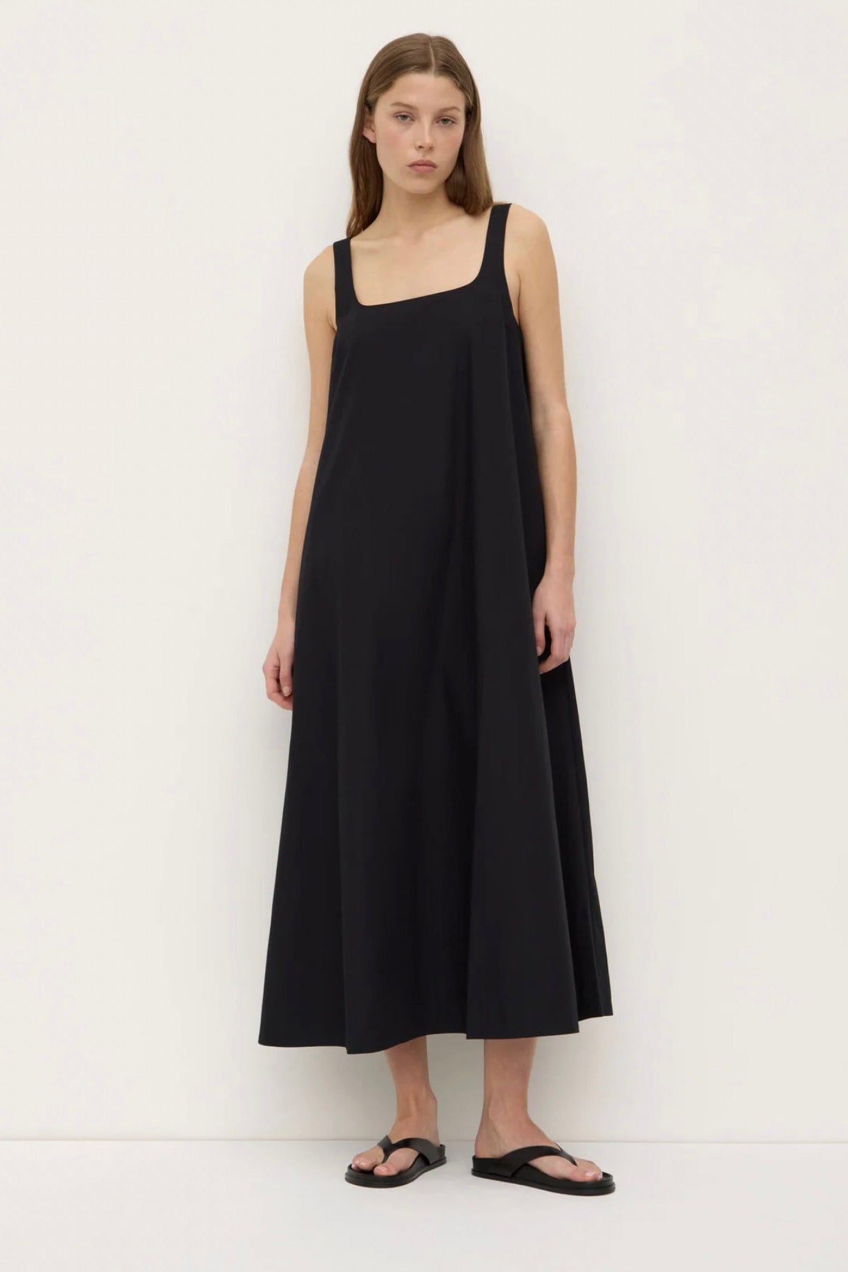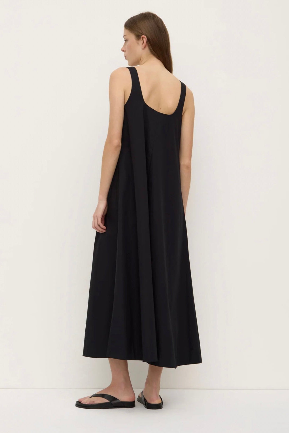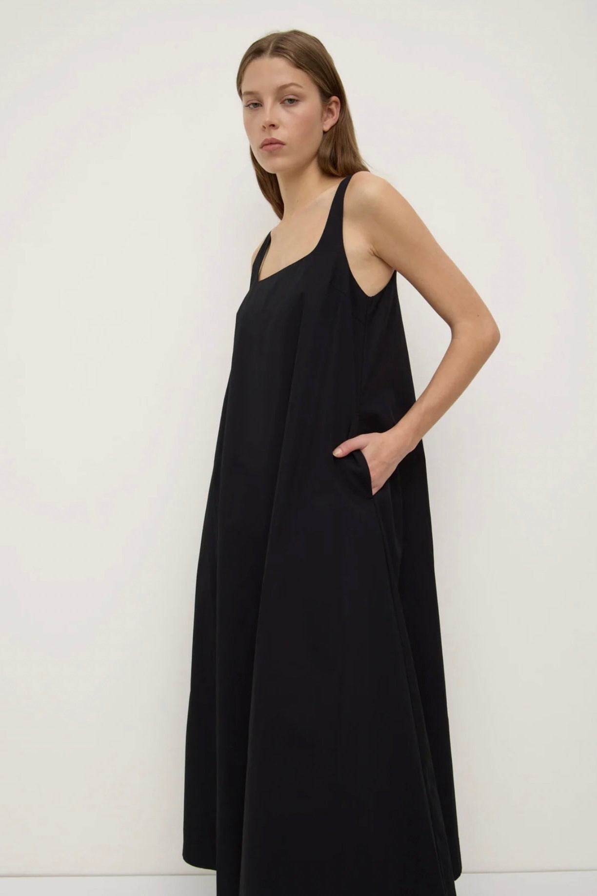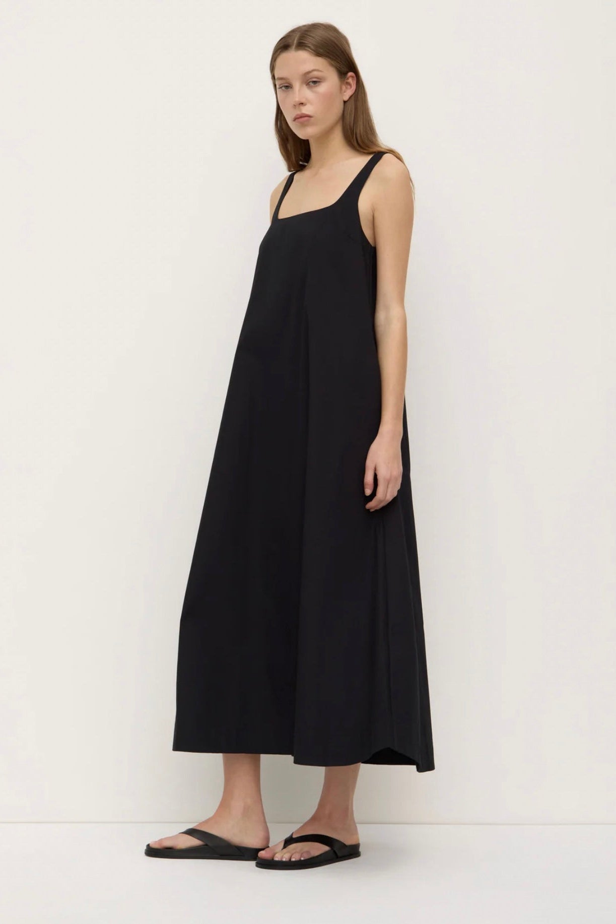 Elevated longline maxi dress crafted from a midweight cotton. Features a square scoop front and back neckline and side pockets for added utility.