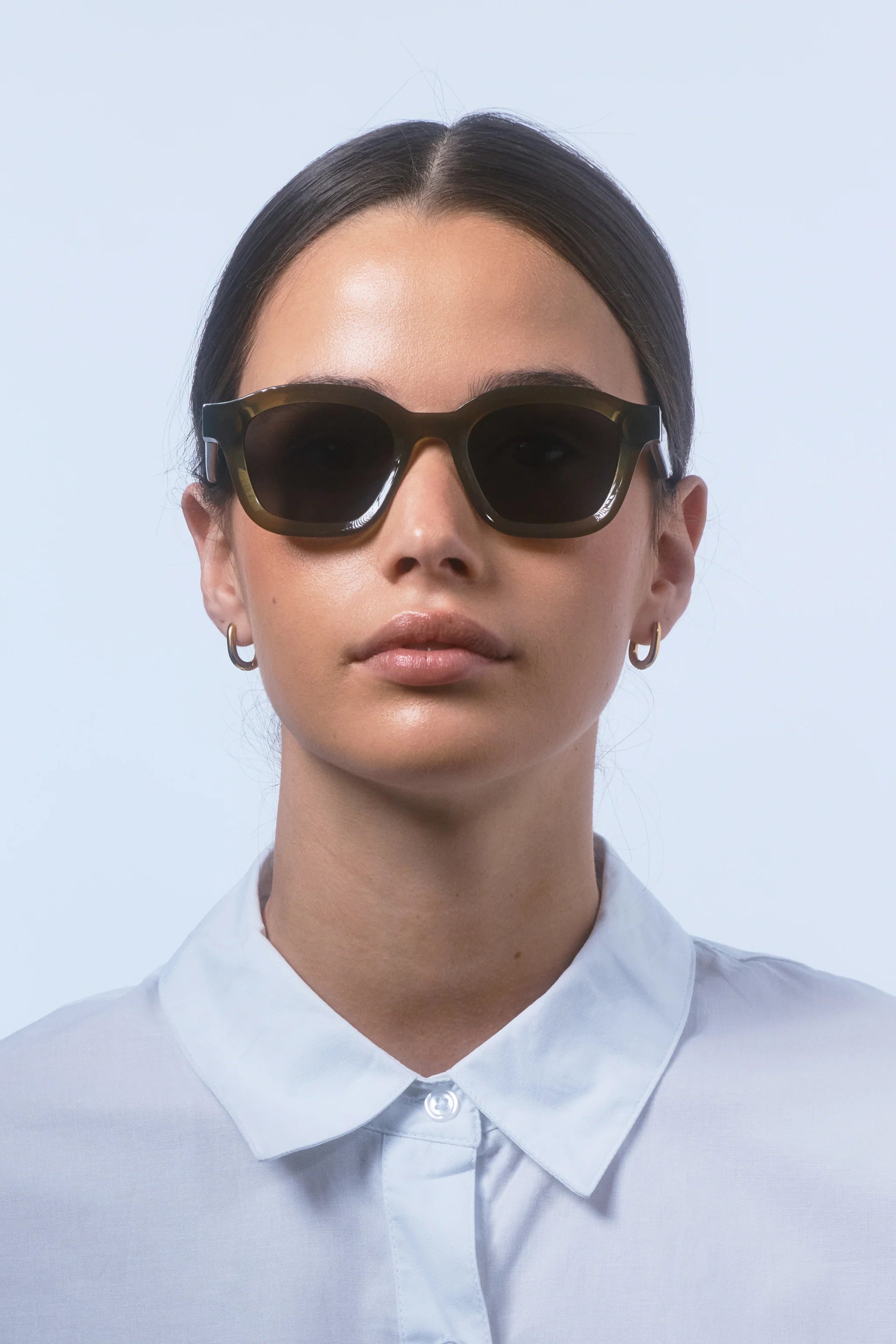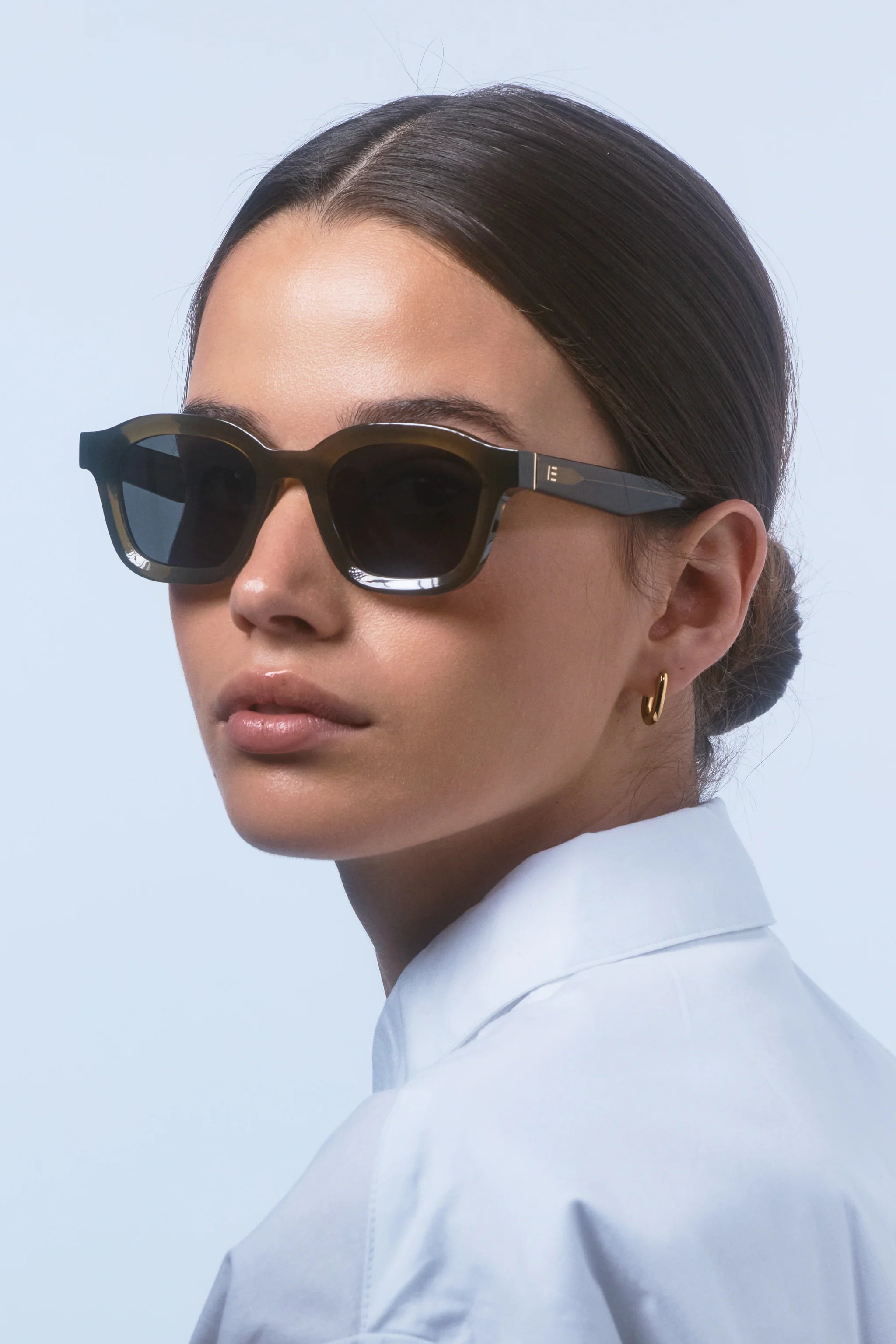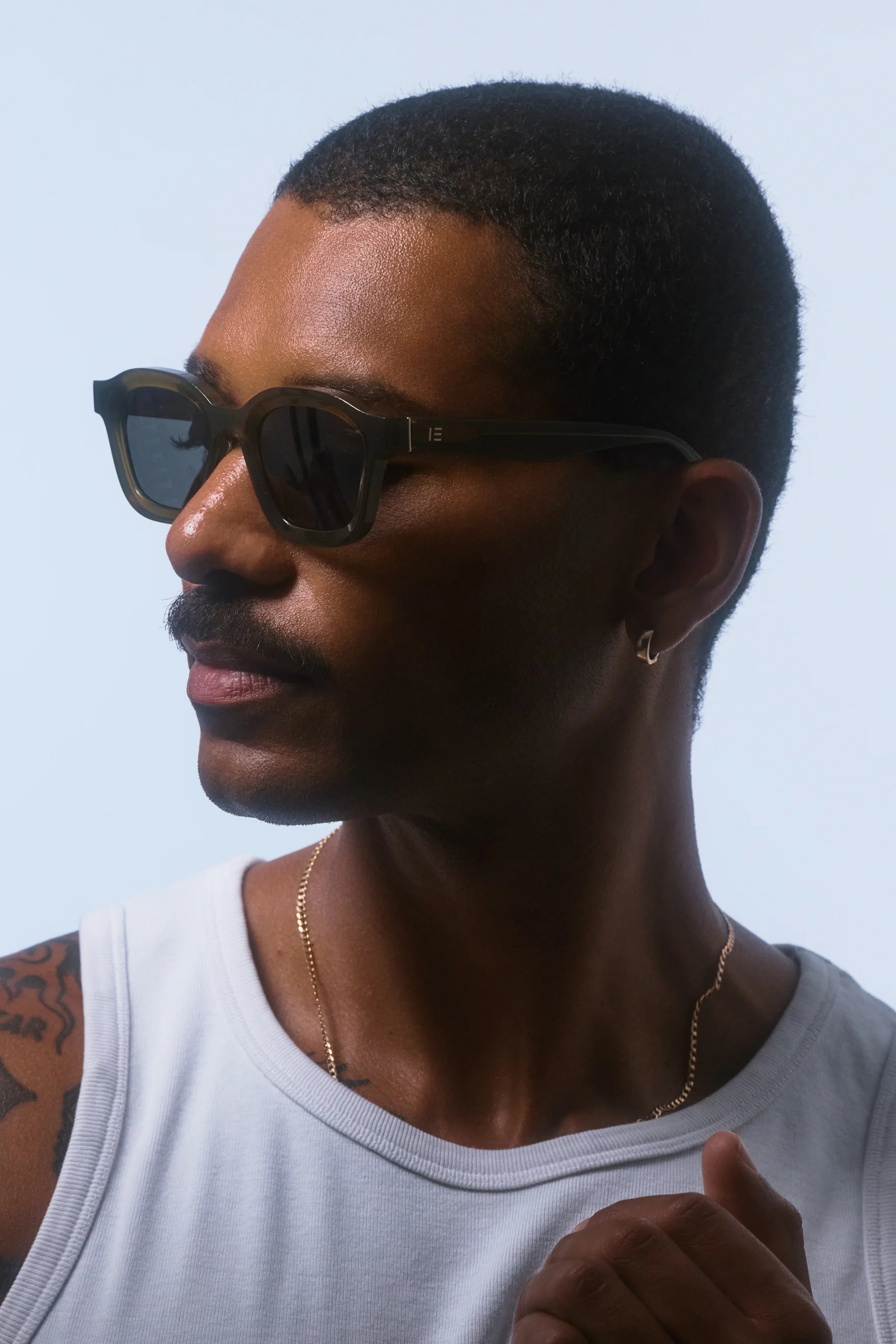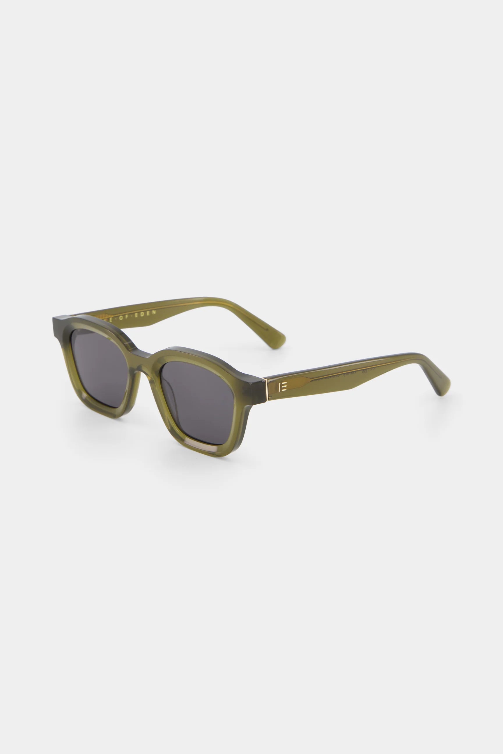 Isle of Eden Harley in Hazy Green is a timeless unisex silhouette brought into the present with a bolder frame, deep dish flat lenses, gold metal Isle of Eden temple trims and serrated temple ends.
