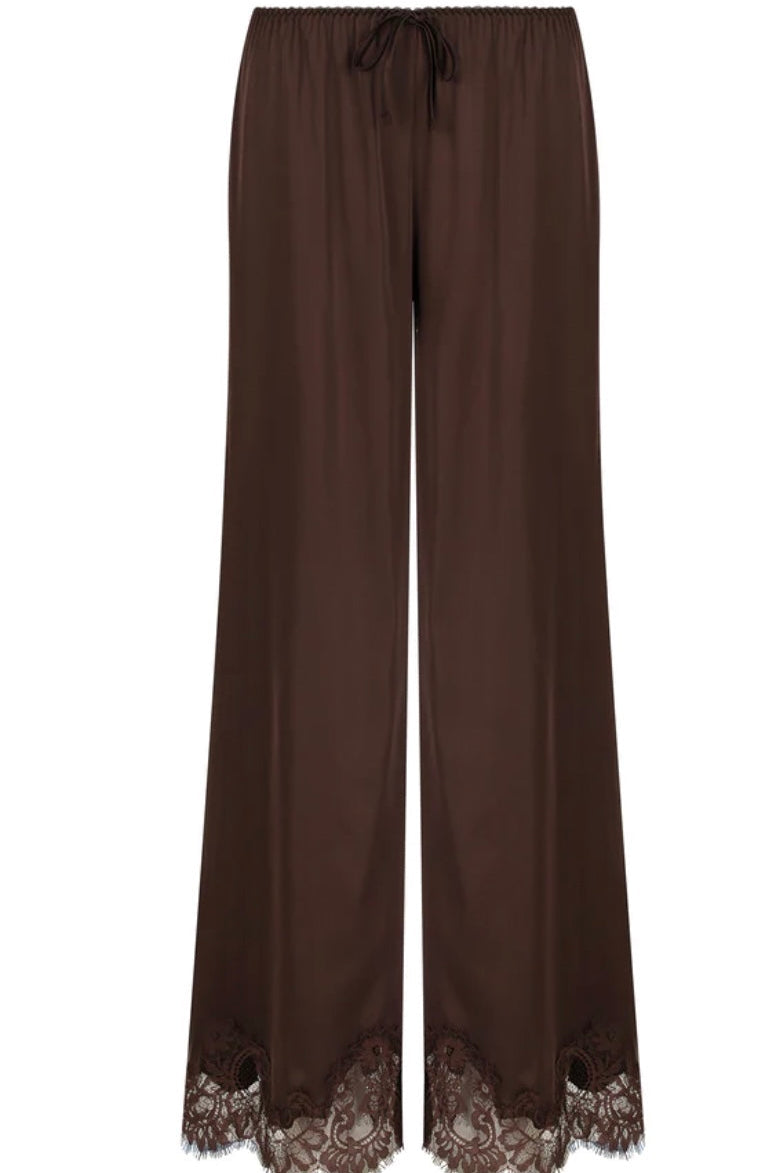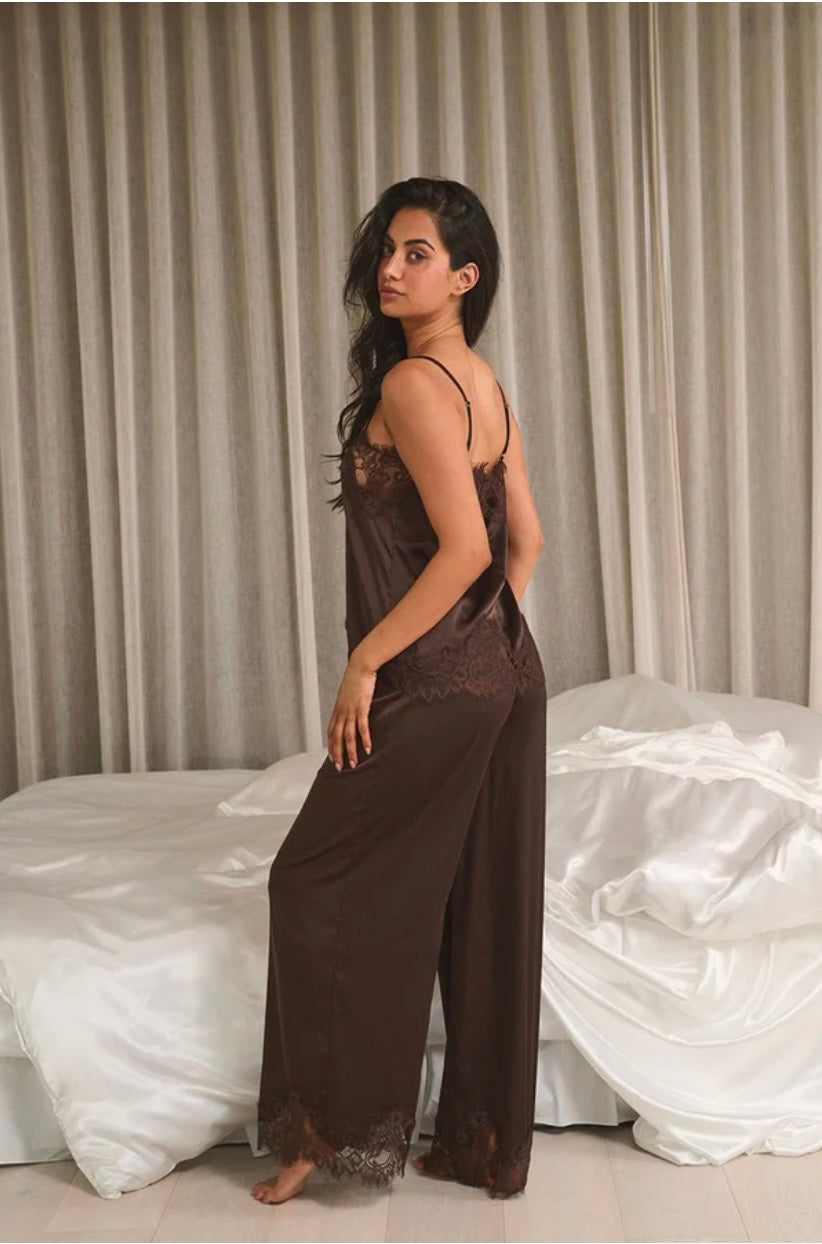 Effortlessly elegant, the Olivia Pant Set in Espresso features a stunning scalloped lace trim paired with our signature luxe satin. Perfect for bridal parties or to elevate your everyday.
