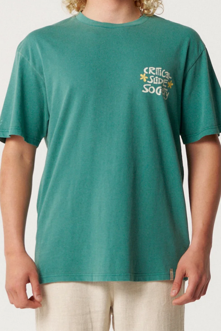 TCSS Very Nice Tee in a dark verde green runs on the regular side but with a touch of oversize for that laid-back drape. Cut from a 230gsm cotton that’s been garment-dyed and washed twice, it’s built to hold its shape and fit the way you want from day one. Very Nide Critical Slide Society graphics.