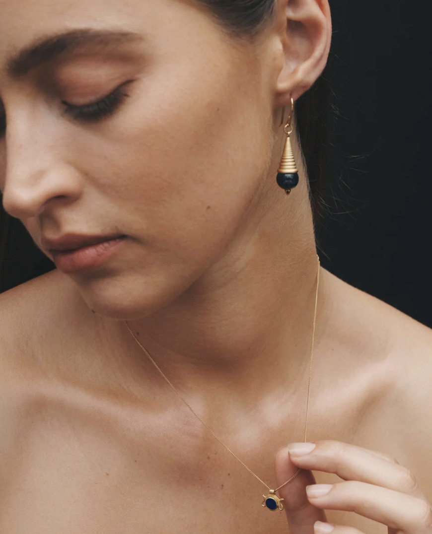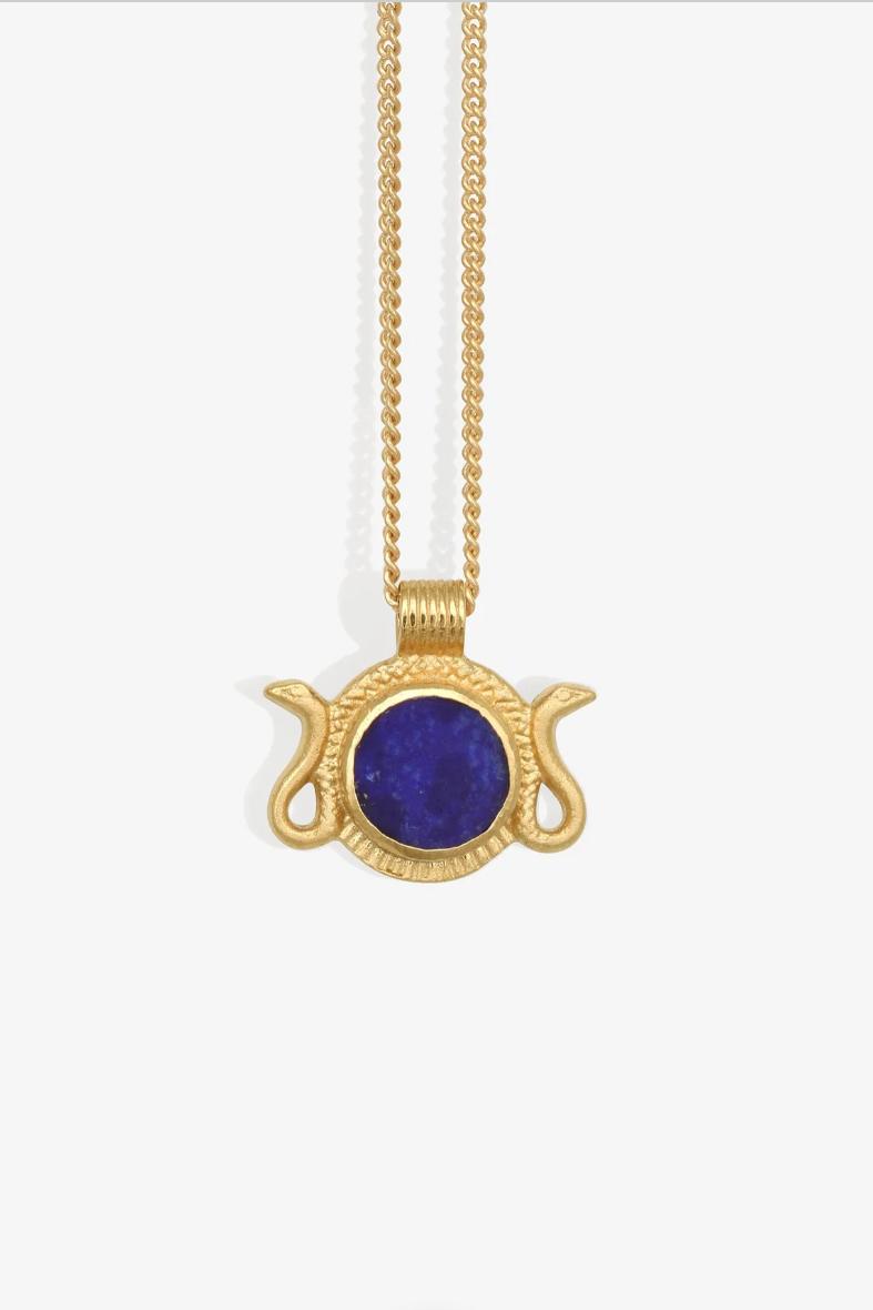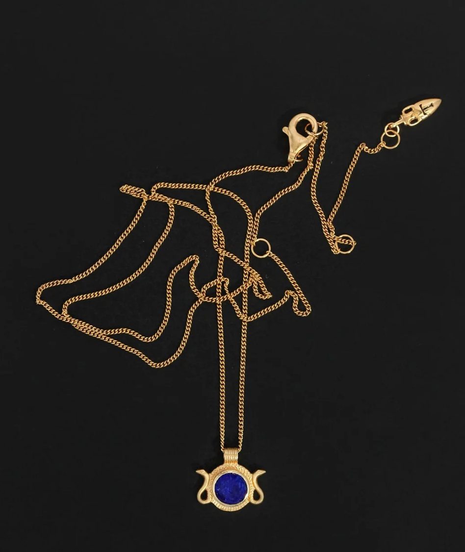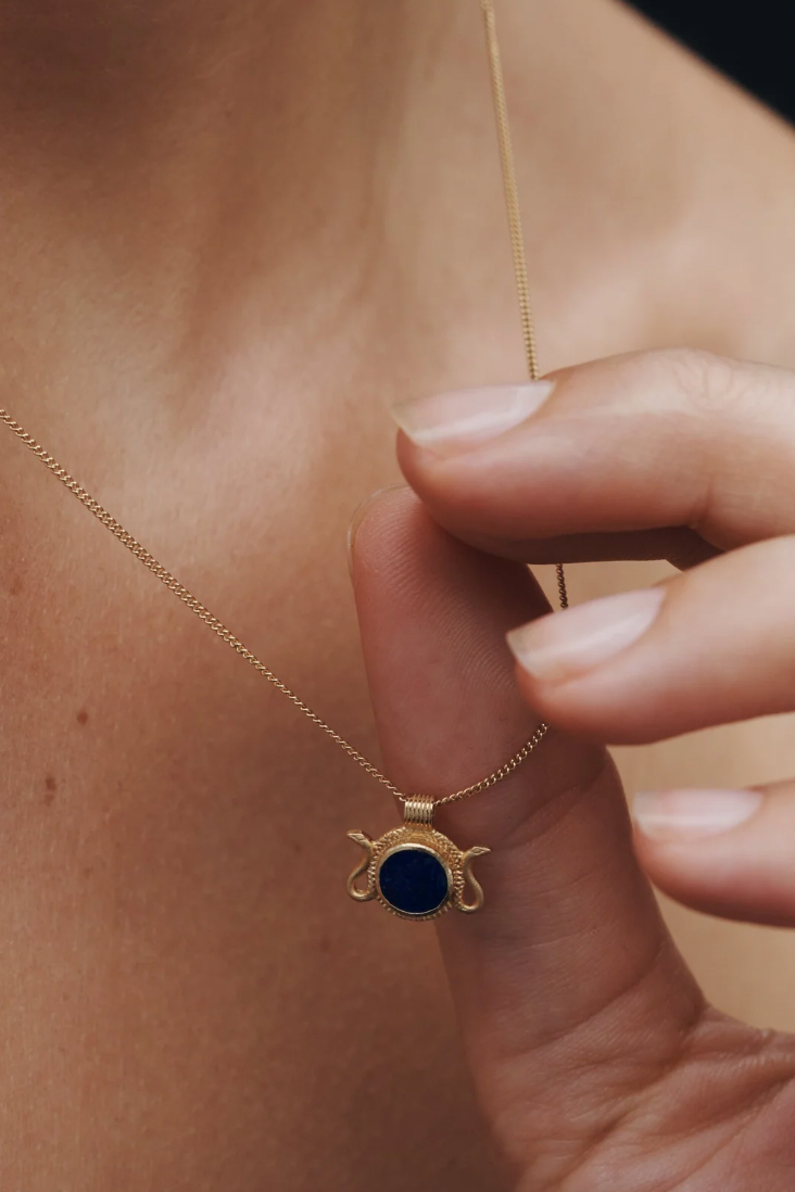 The Naja Necklace features a deep blue lapis lazuli framed by twin snakes in 18k gold vermeil. Echoing protective motifs found in ancient Egyptian jewellery, the serpent symbolises transformation, renewal, and strength. Refined for everyday wear, the pendant is suspended from a fine curb chain.