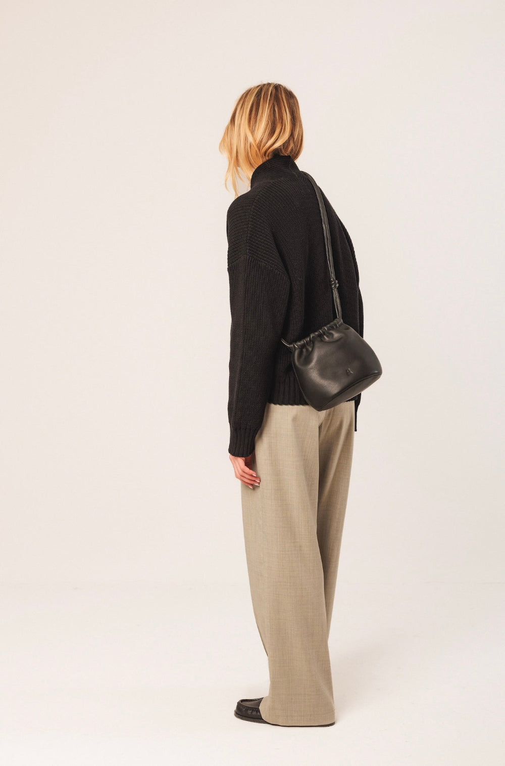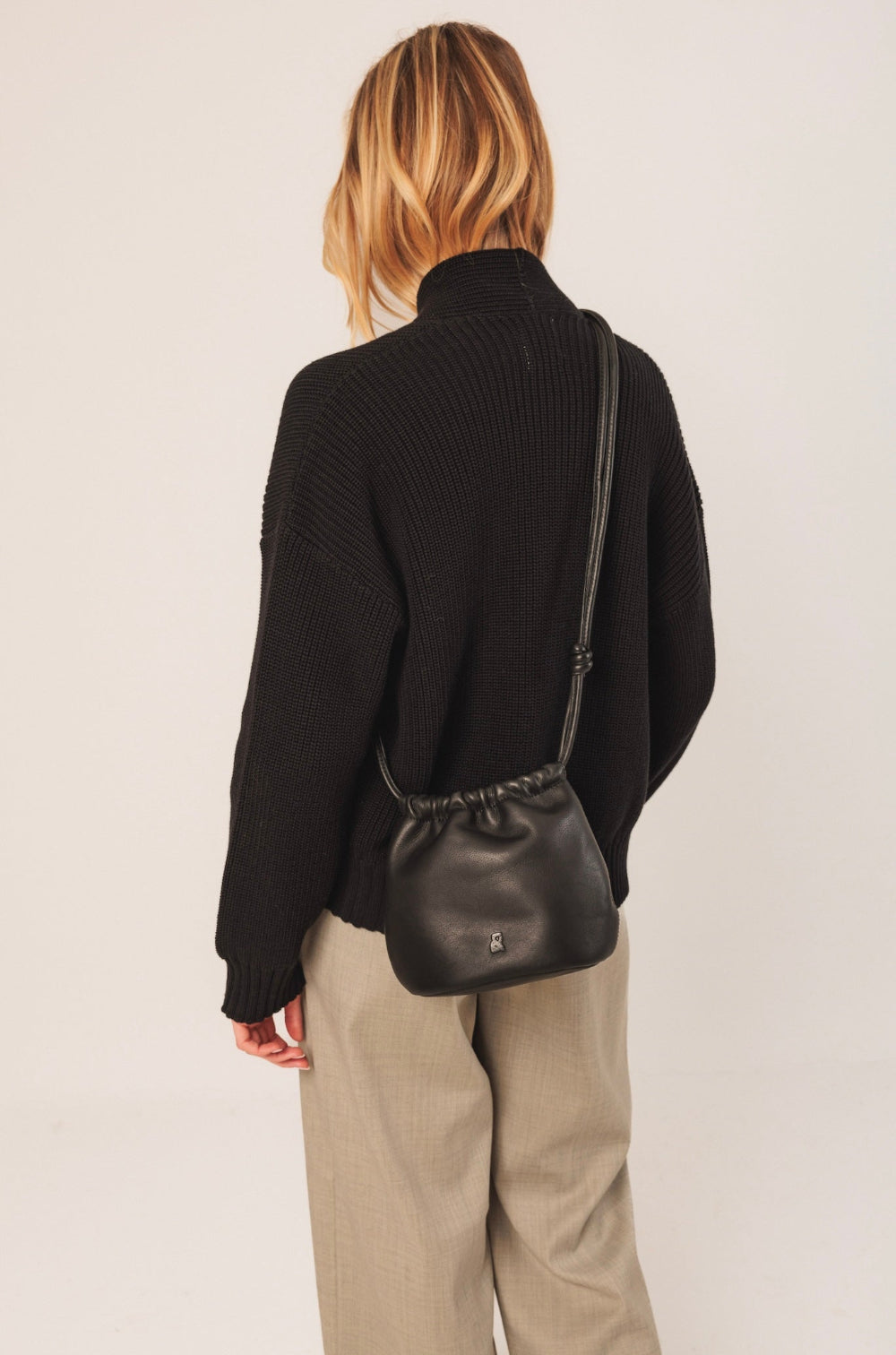 A bag for the daily life as well as special occasions. Its gathered structure and the knots on the handle give it a sophisticated touch.