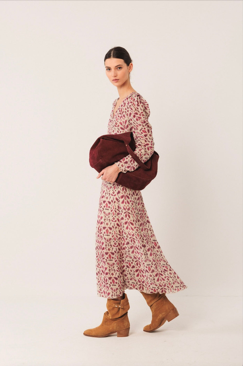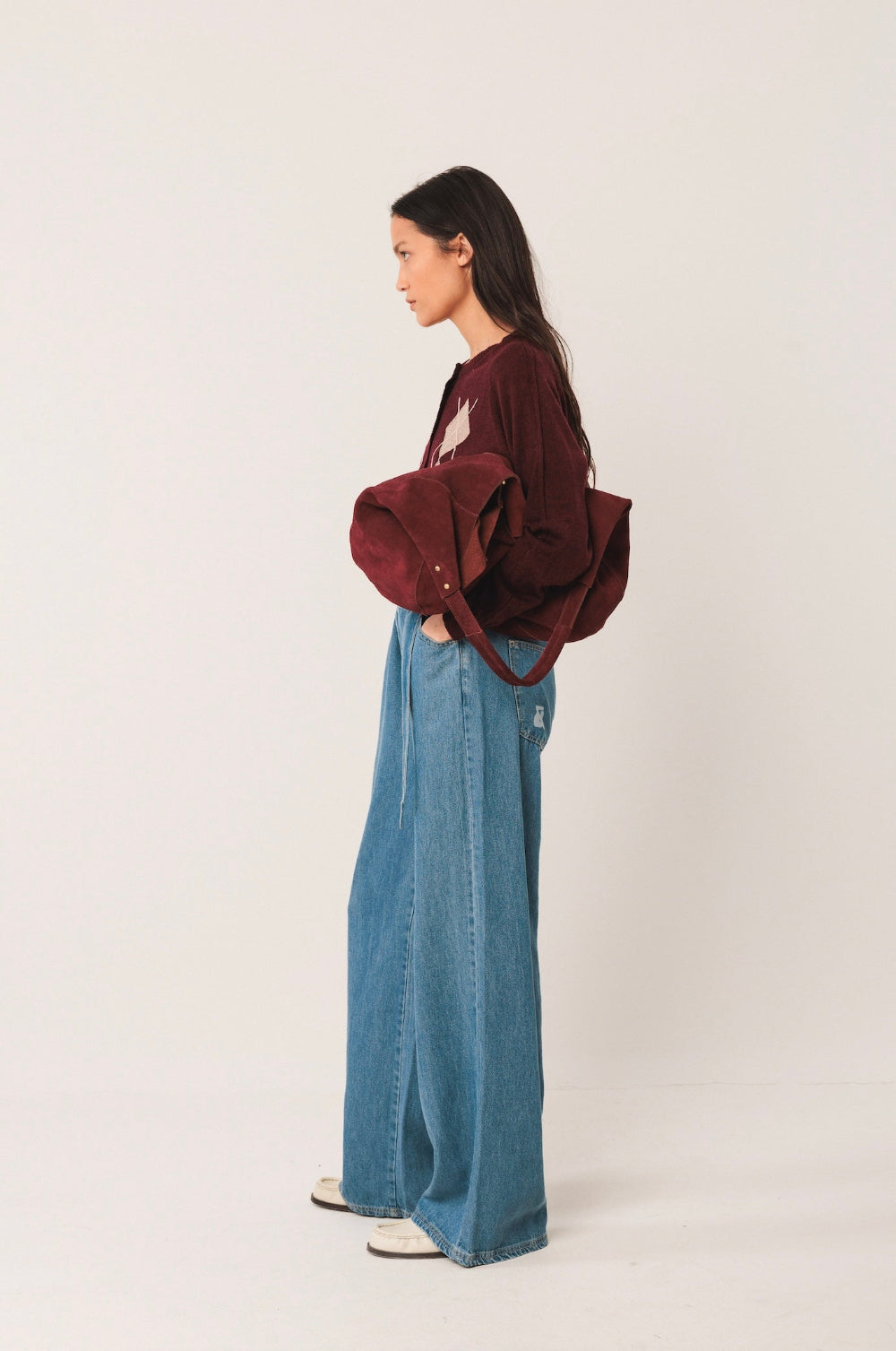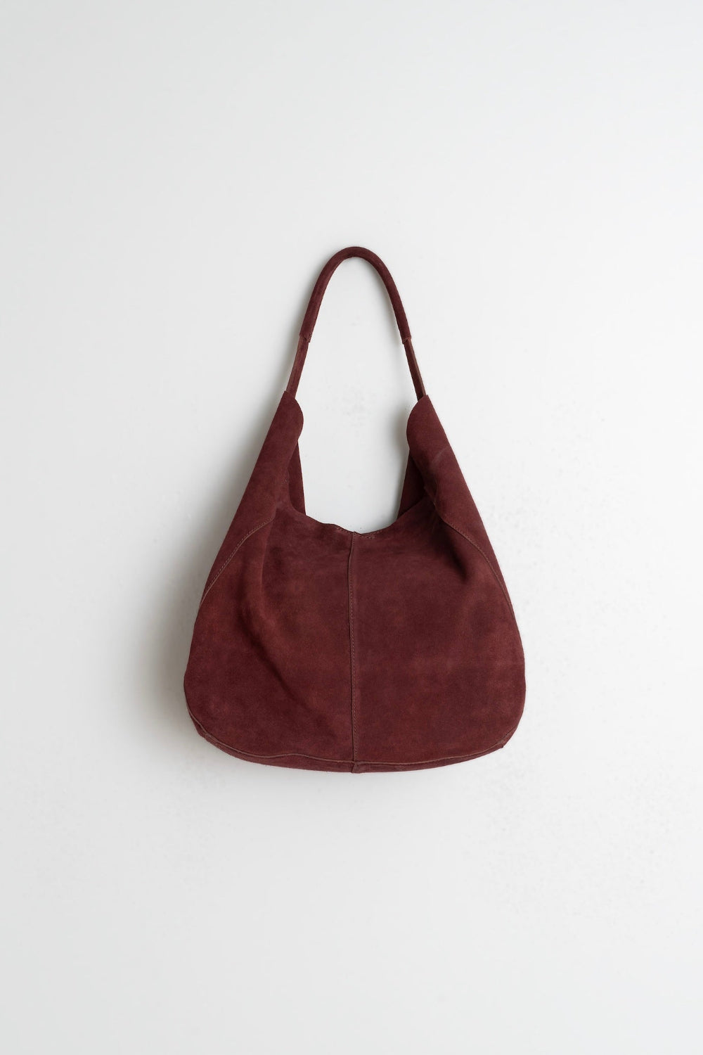 Split leather tote bag with hand/shoulder strap. Cotton lining, a patch pocket, and zipper closure that makes it softer and easier to use. Boho chic, soft, roomy but not huge, love this bag!
