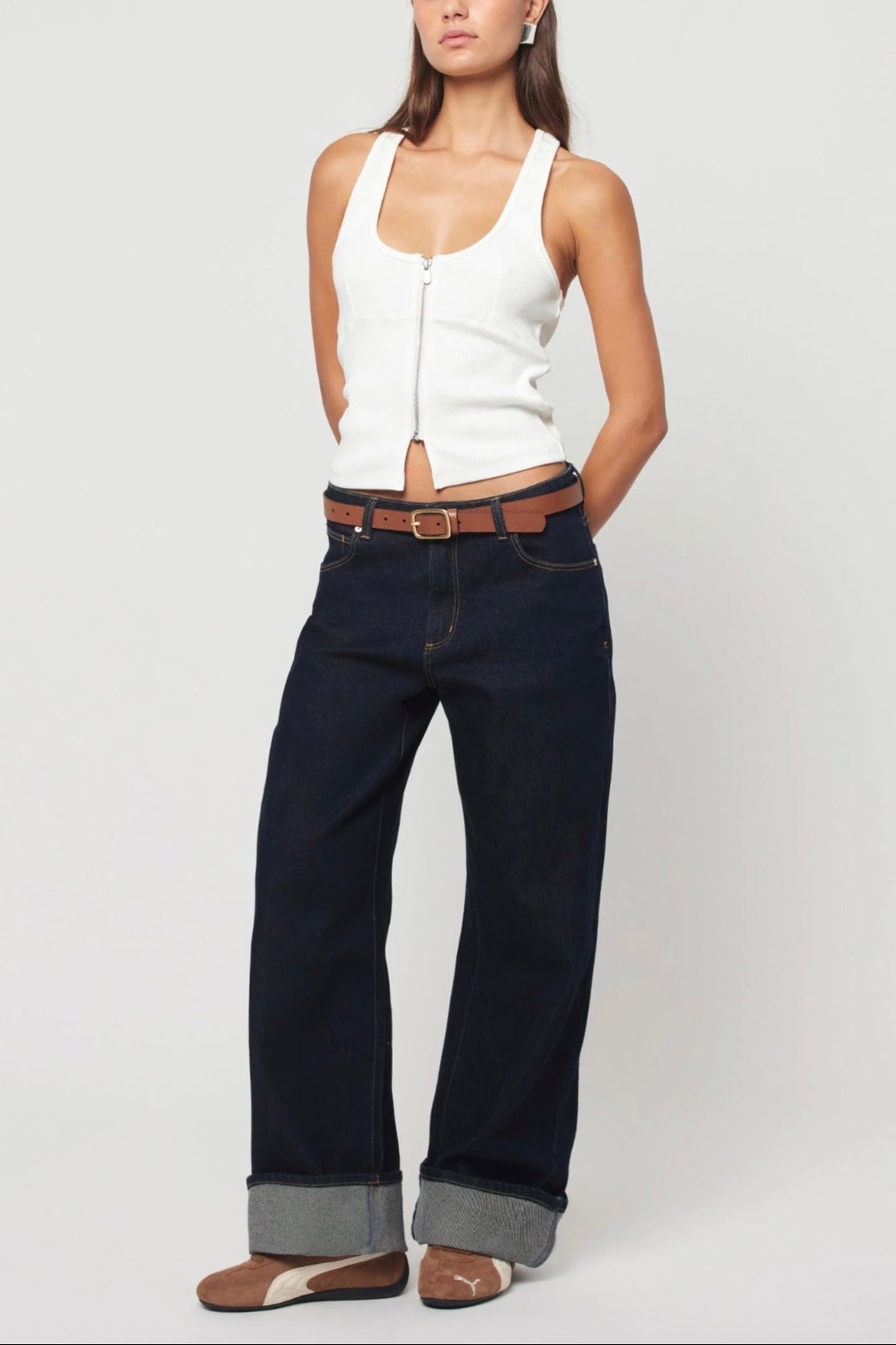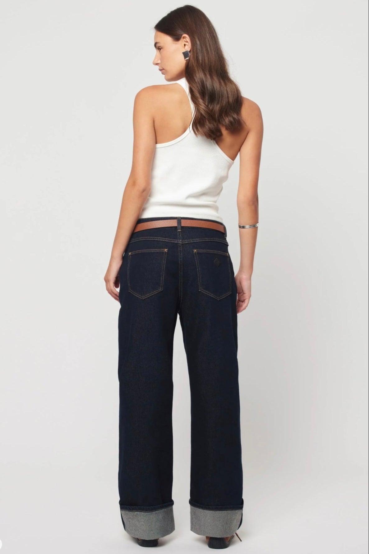 Richie is a dark rinse wash denim finished with a subtle turn-up at the hem. Finished with tobacco stitching, silver button, rose gold rivets & tan Abrand back patch. This indigo denim has the look of a rigid with the comfort of a stretch.