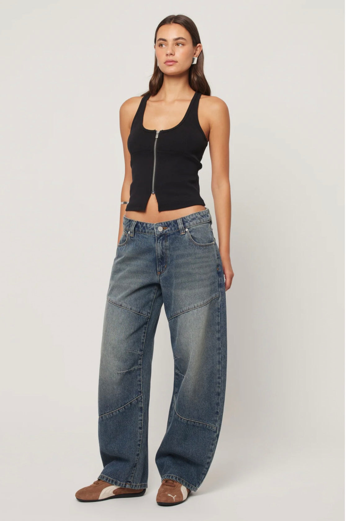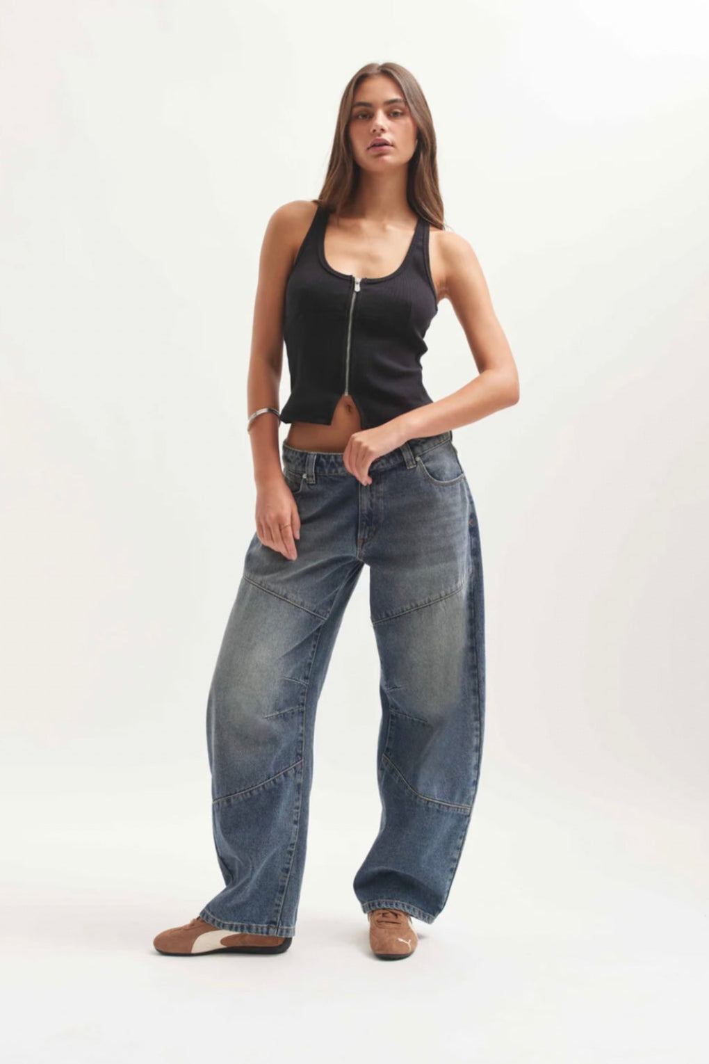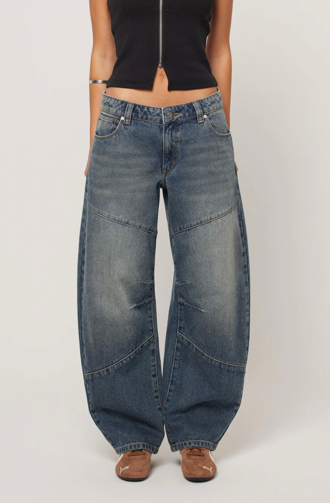 The 99 Low Barrel Jean is a low rise, relaxed seat and bowed leg shape. Finishing just below the ankle. With leg panels & dart details. A favourite fit instore.