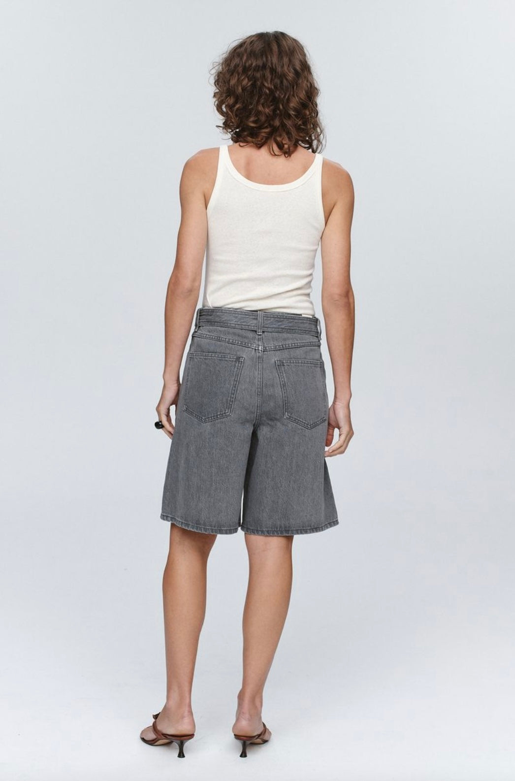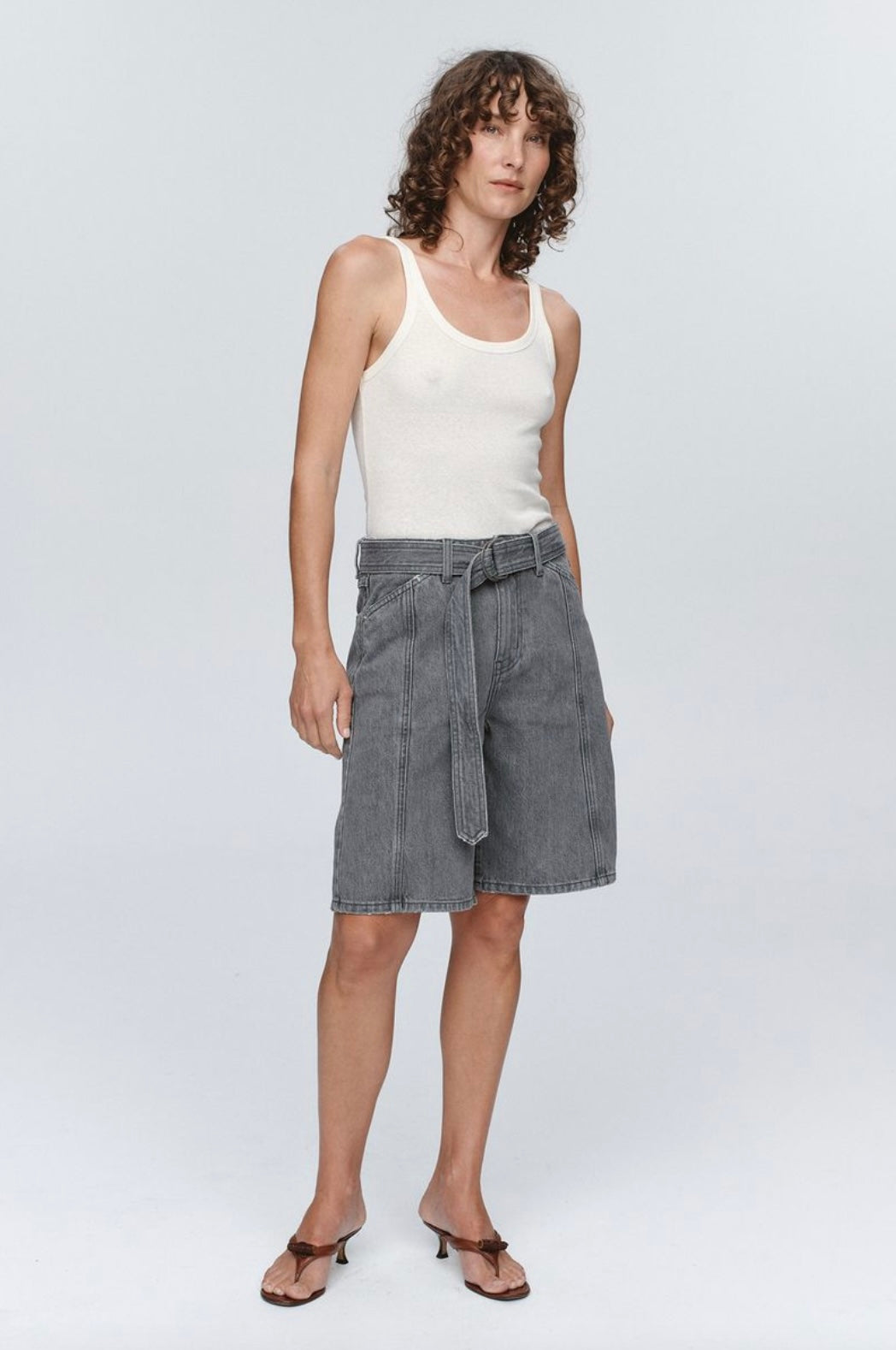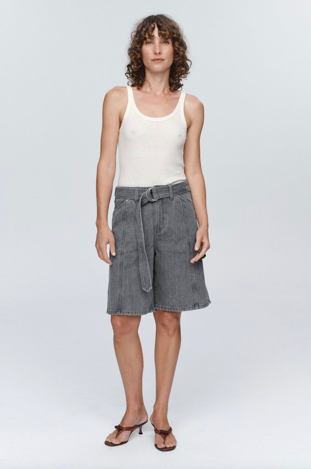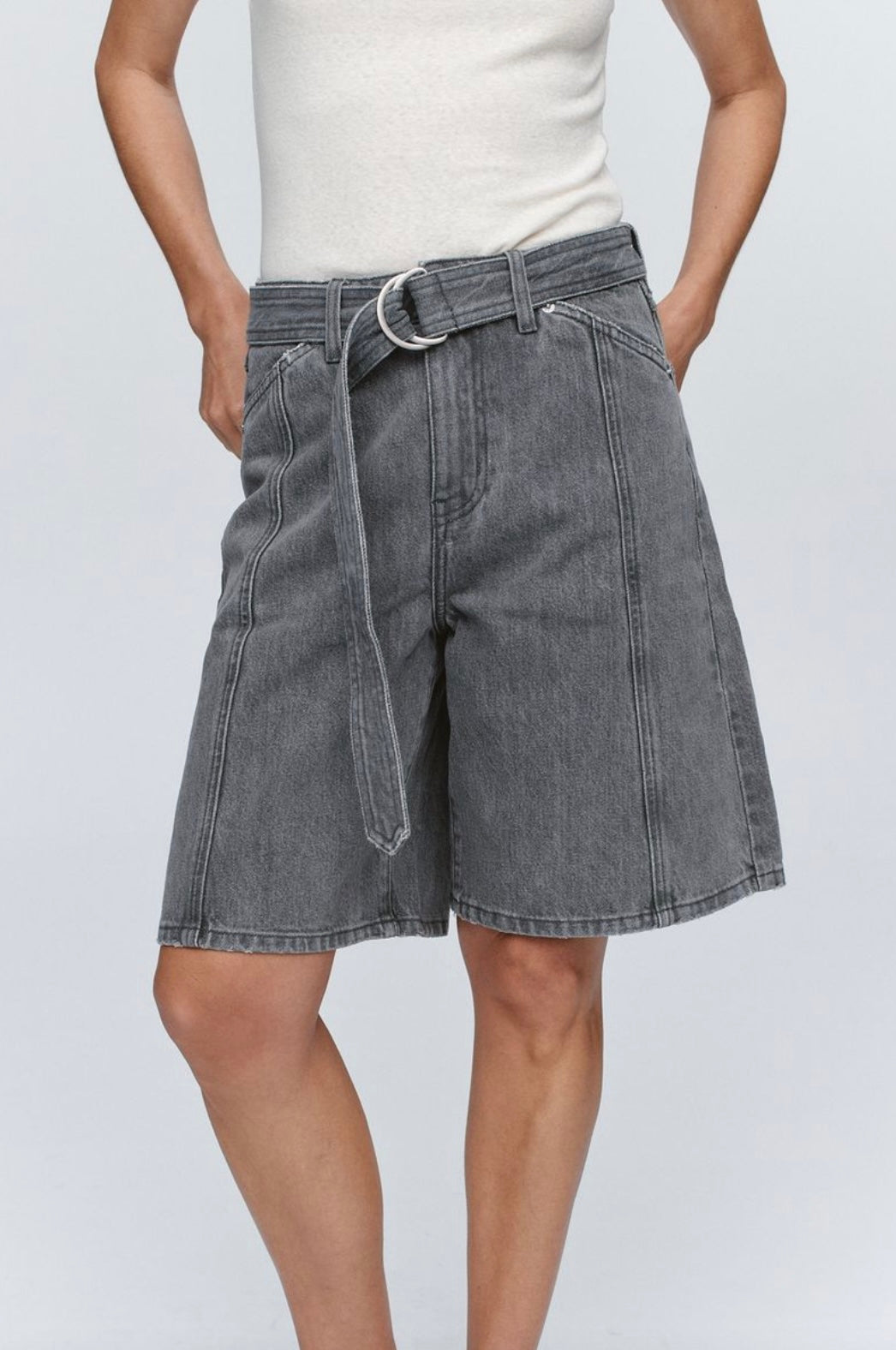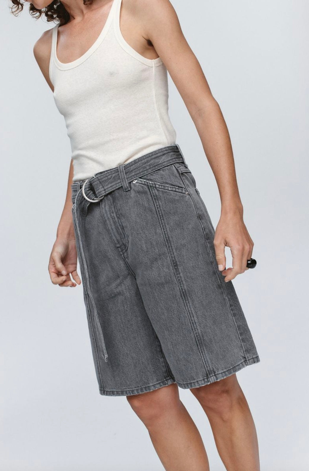 Knee-length shorts constructed from 100% organic cotton. Designed with a mid-rise waist and structured shape. Features include a zip fly with button closure, angled front pockets, patch pockets at the back and a self-fabric belt with silver-tone D-ring hardware. Finished with topstitching to reinforce the seams for durability.