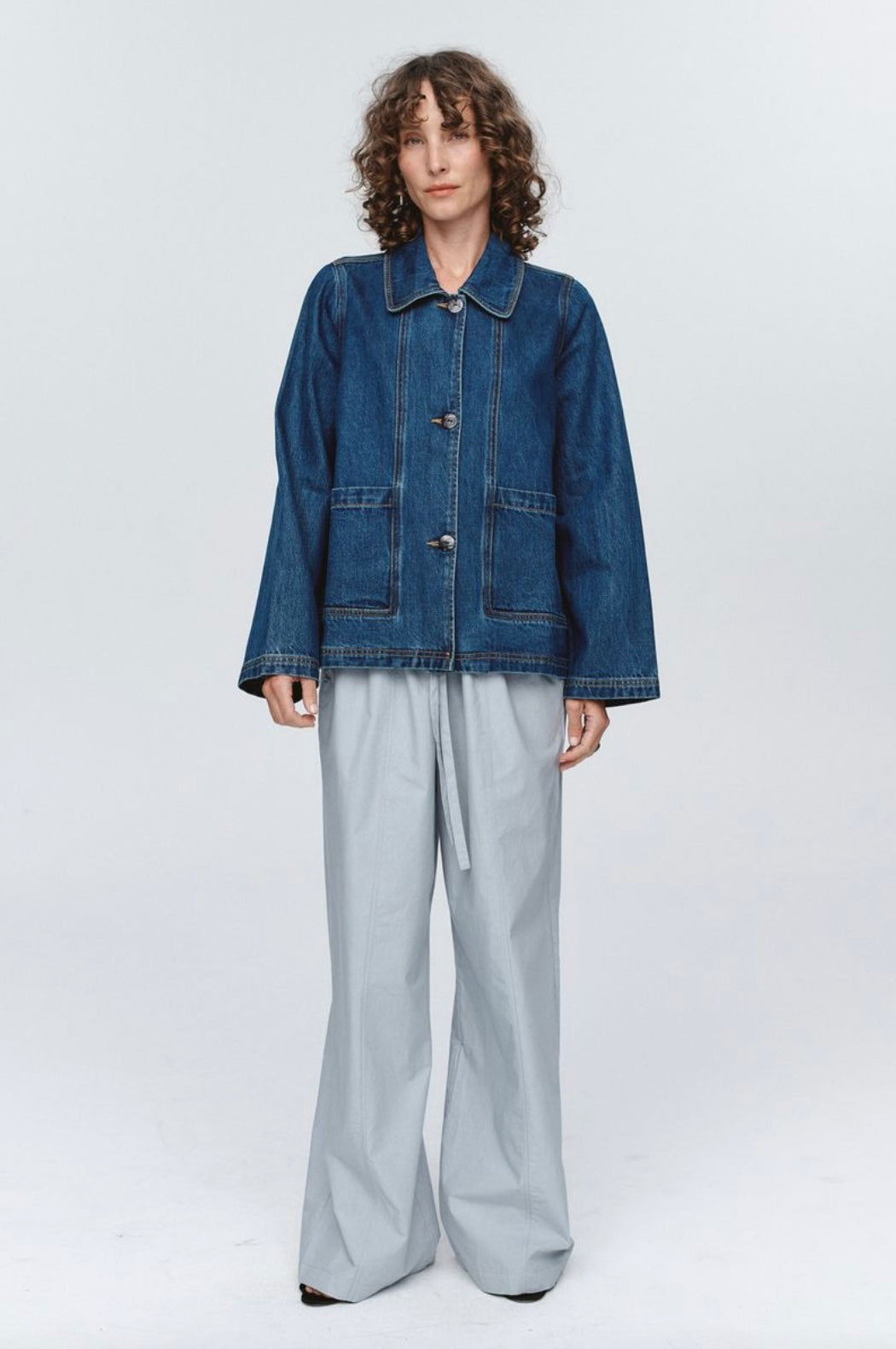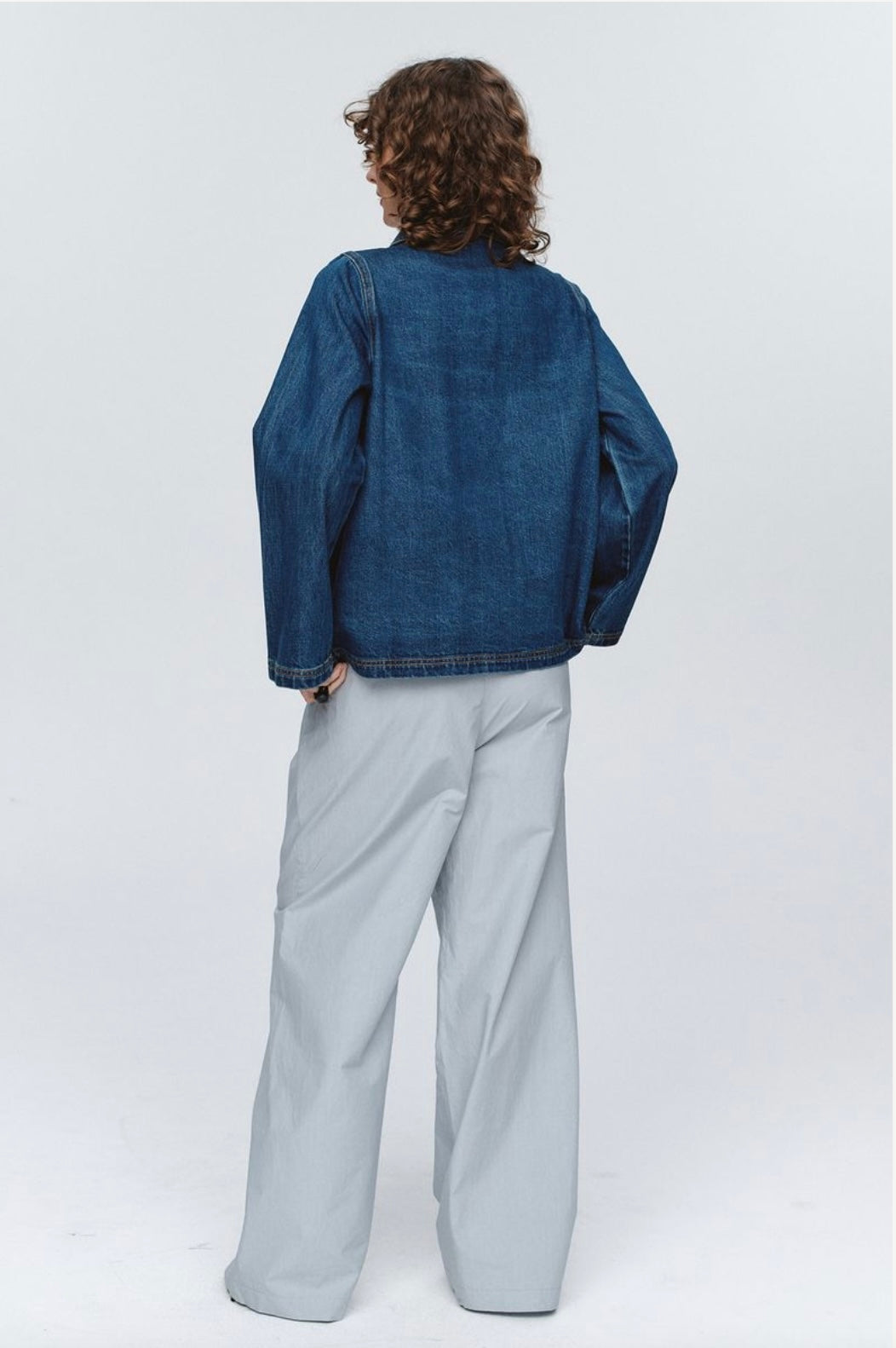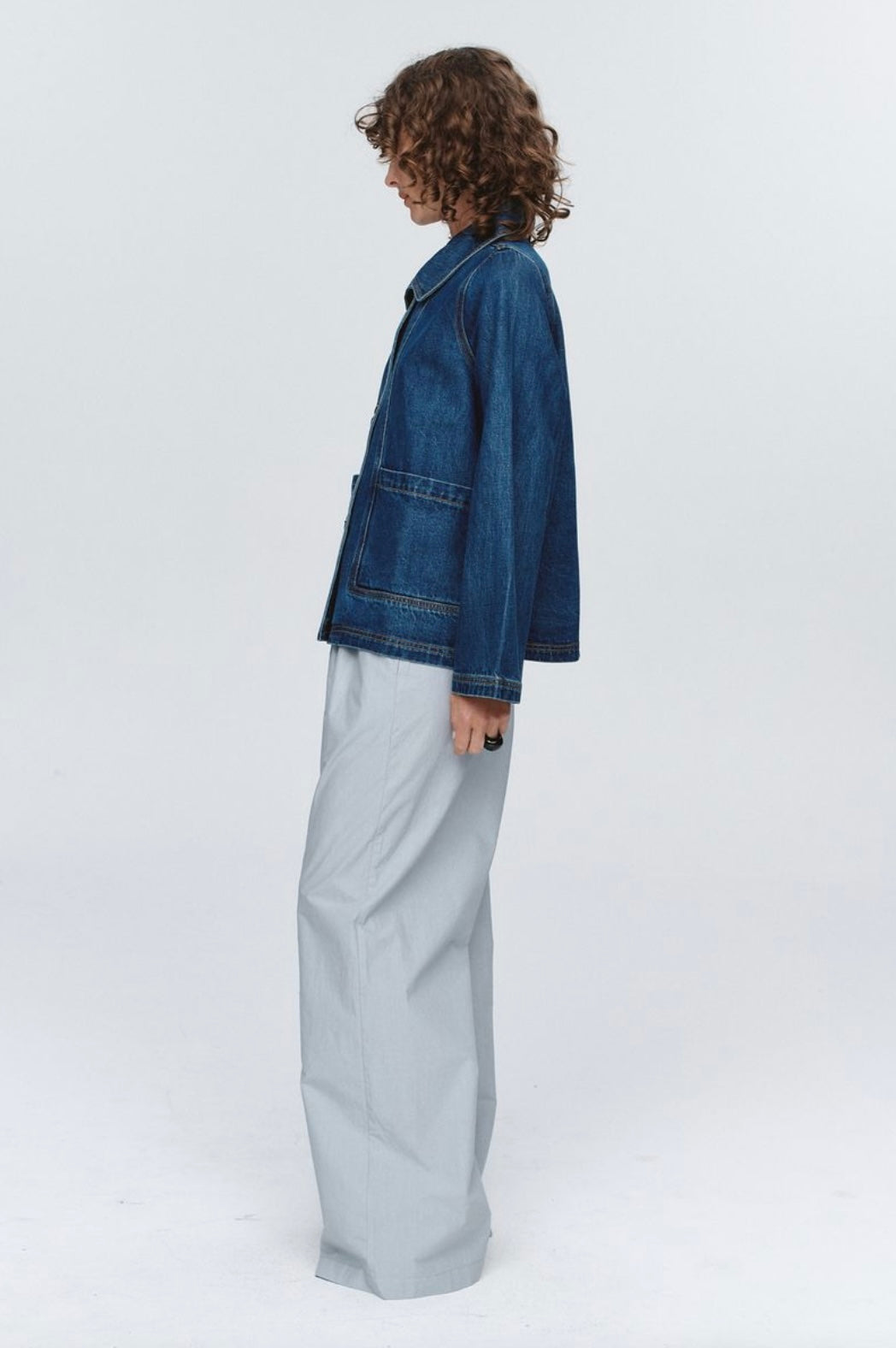 A boxy-fit jacket constructed from 100% organic cotton. Designed with a slightly cropped shape and relaxed proportions. Features include a pointed collar, three-button front placket and two oversized front patch pockets. Finished with topstitching along all major seams and hems for structural reinforcement and visual definition.