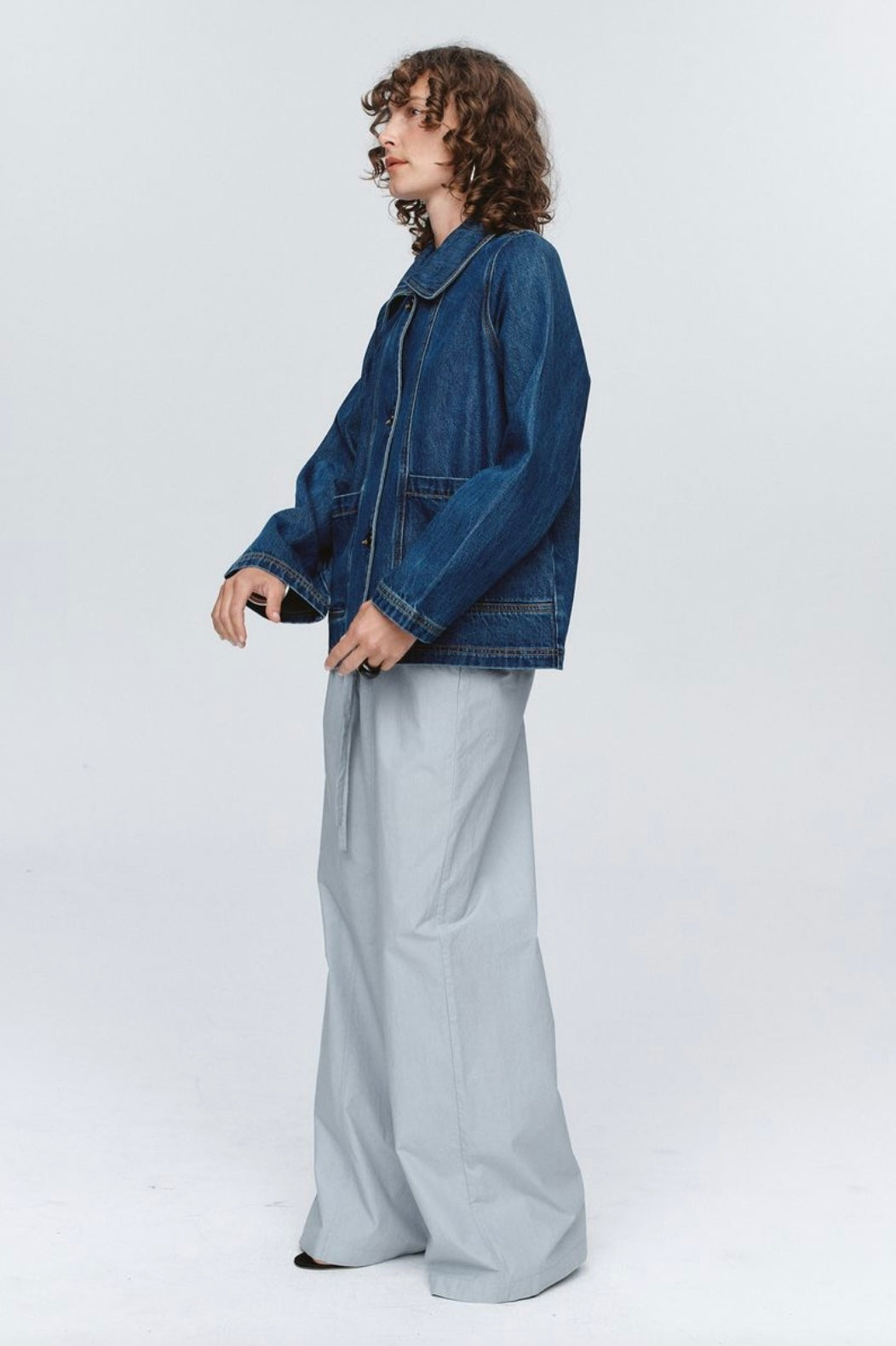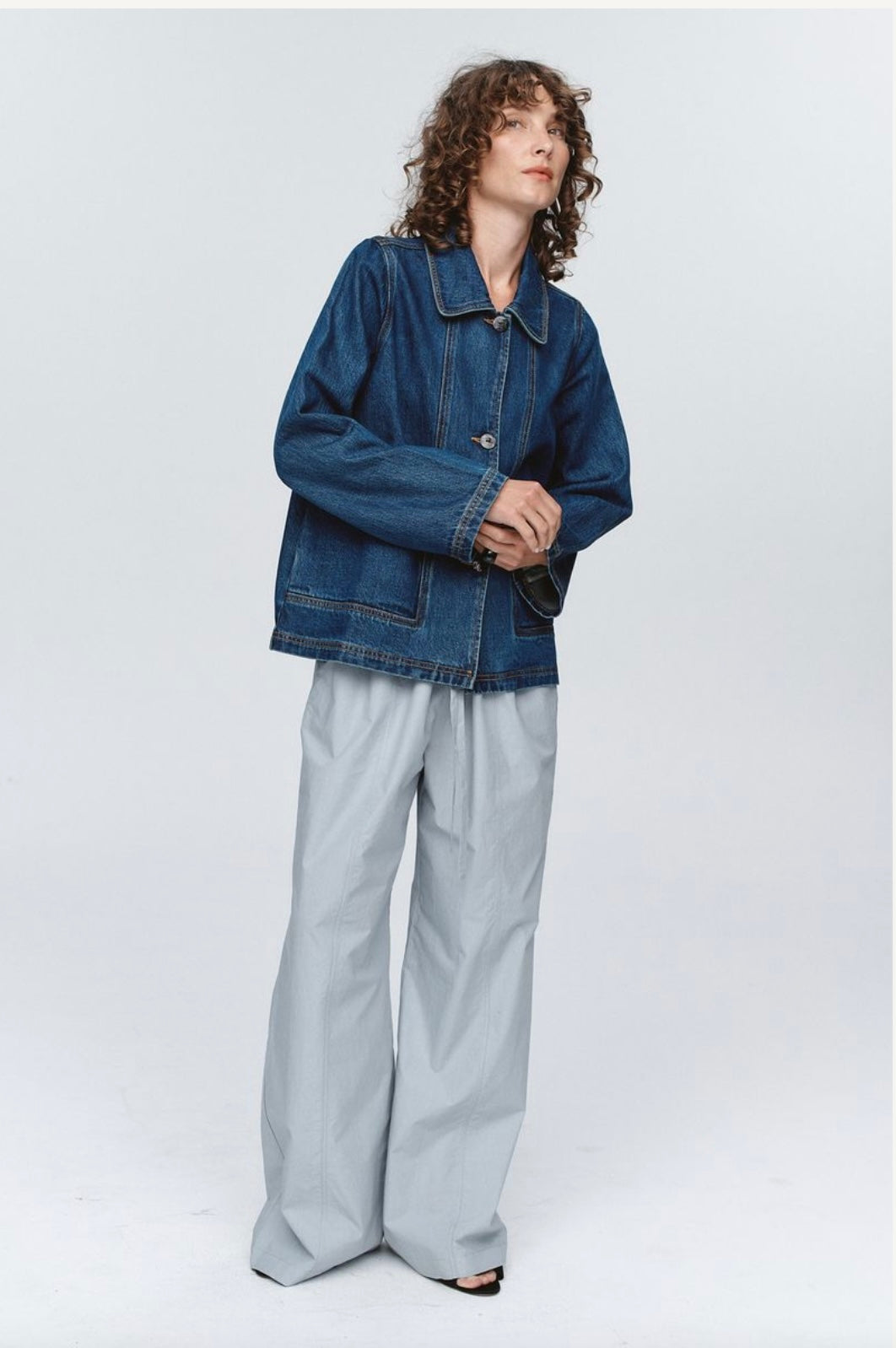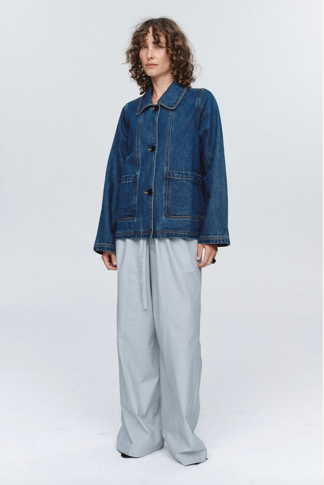 A boxy-fit jacket constructed from 100% organic cotton. Designed with a slightly cropped shape and relaxed proportions. Features include a pointed collar, three-button front placket and two oversized front patch pockets. Finished with topstitching along all major seams and hems for structural reinforcement and visual definition.