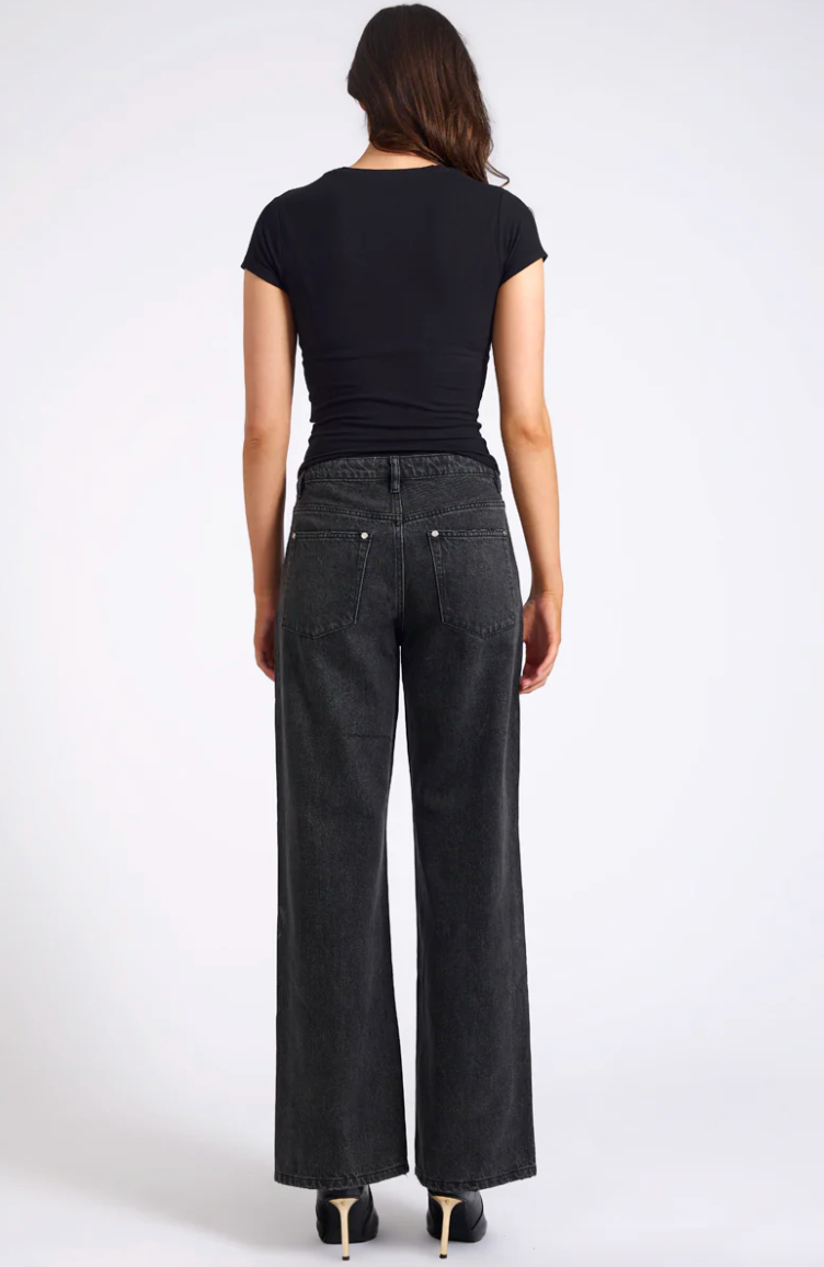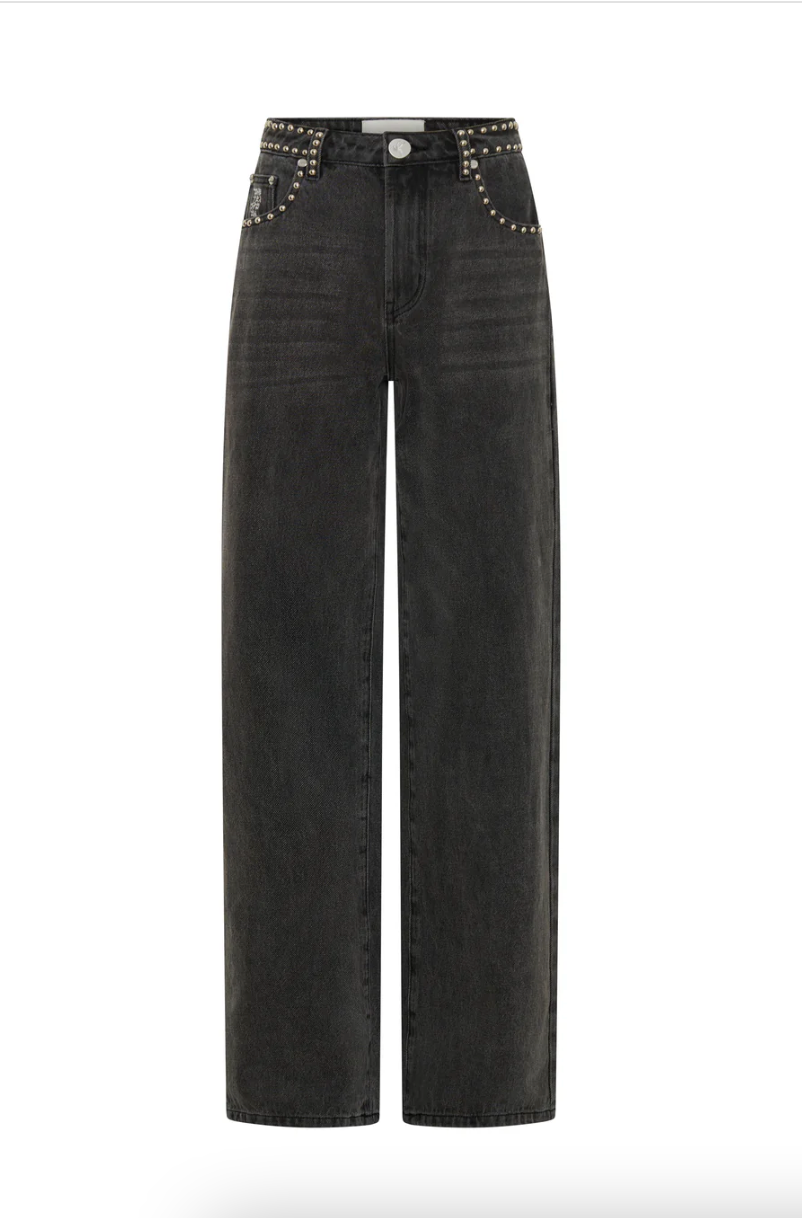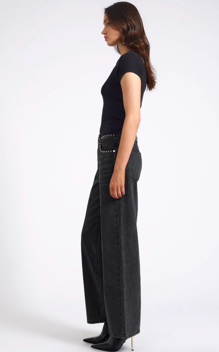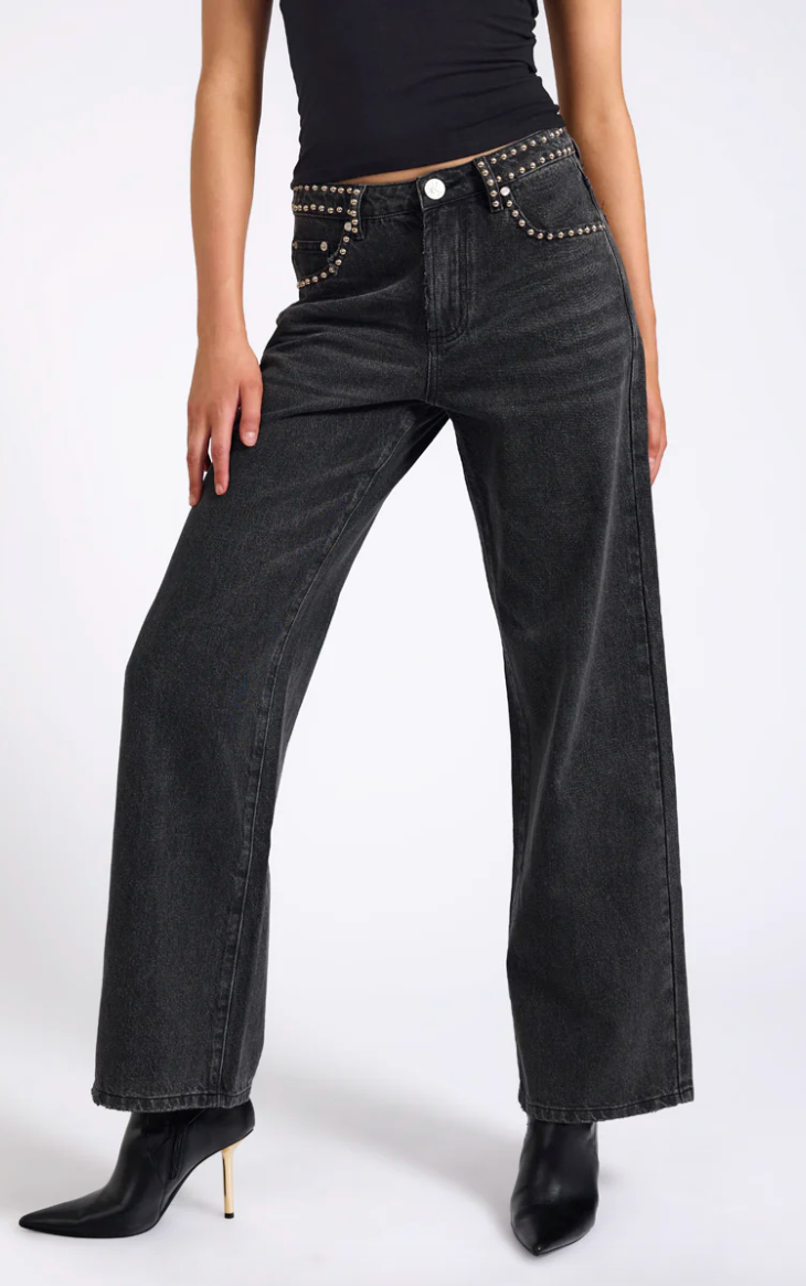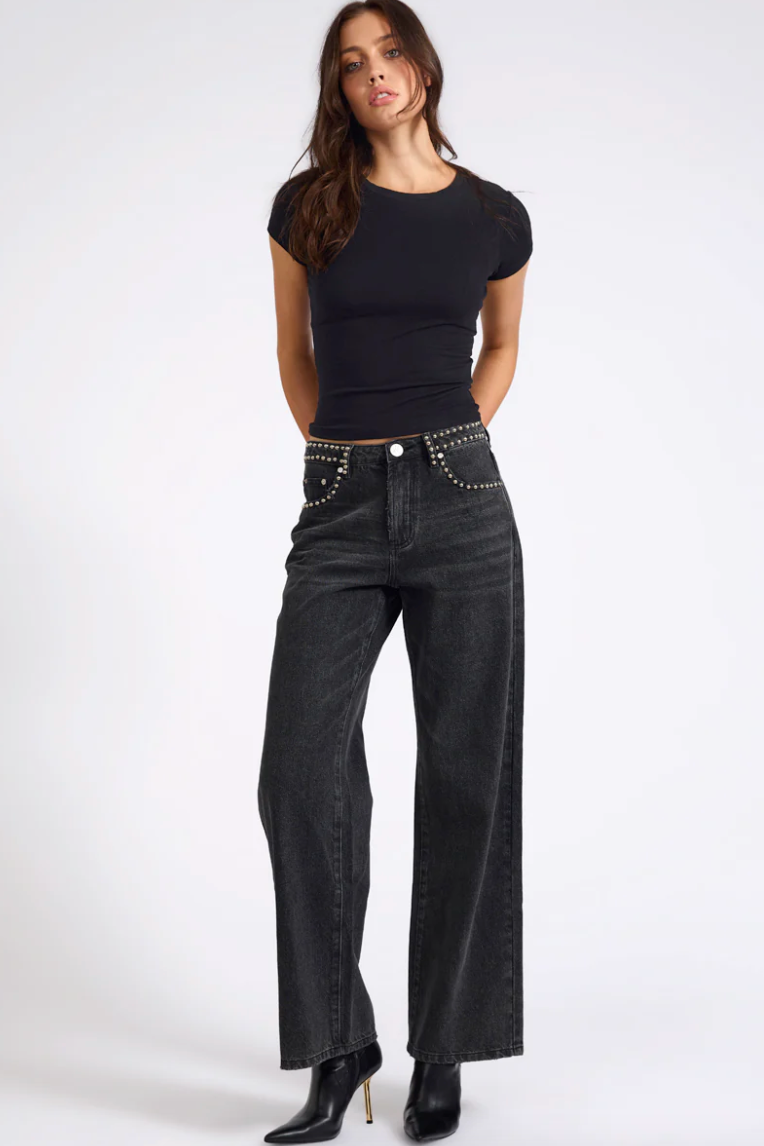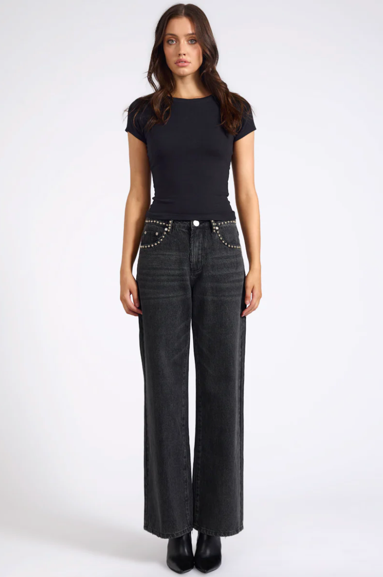 The BLACK JACKSON MID WAIST WIDE LEG STUDDED DENIM JEANS redefine classic cool. Our signature Jackson wide-leg silhouette meets sleek black denim, finished with stud detailing for that signature One Teaspoon edge.