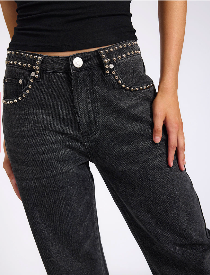 BLACK is a deep washed black denim finished with hand-applied stud detailing.