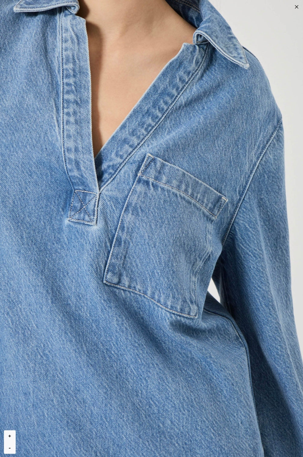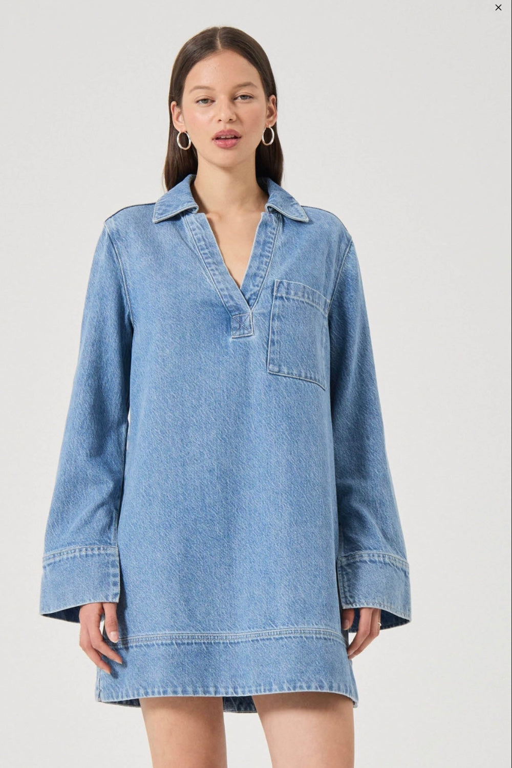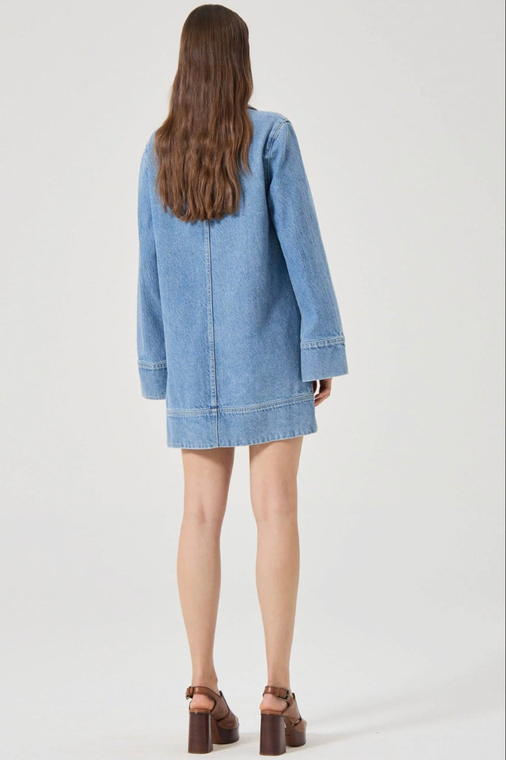 - Relaxed fit mini denim dress with a structured tailored collar and button front placket