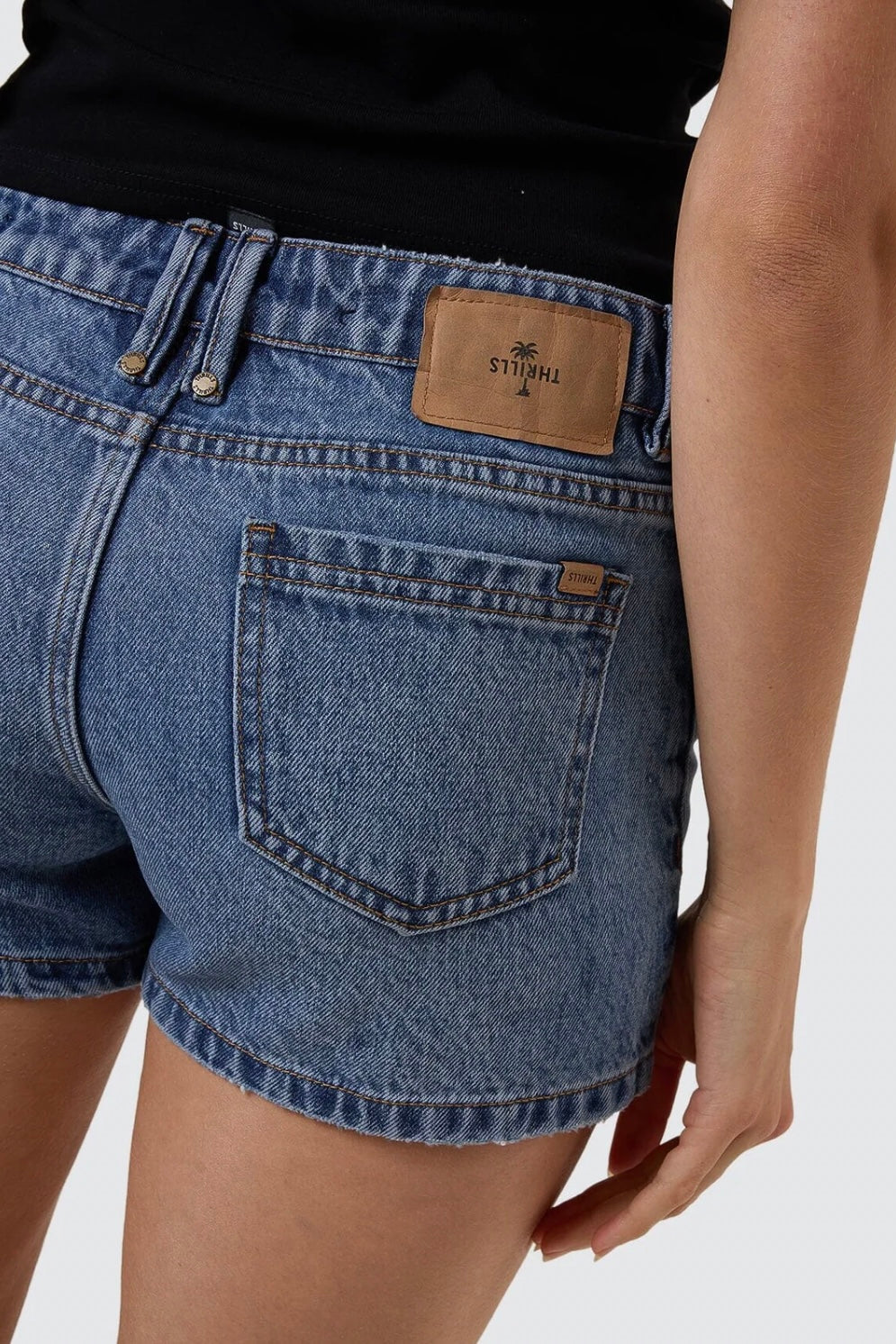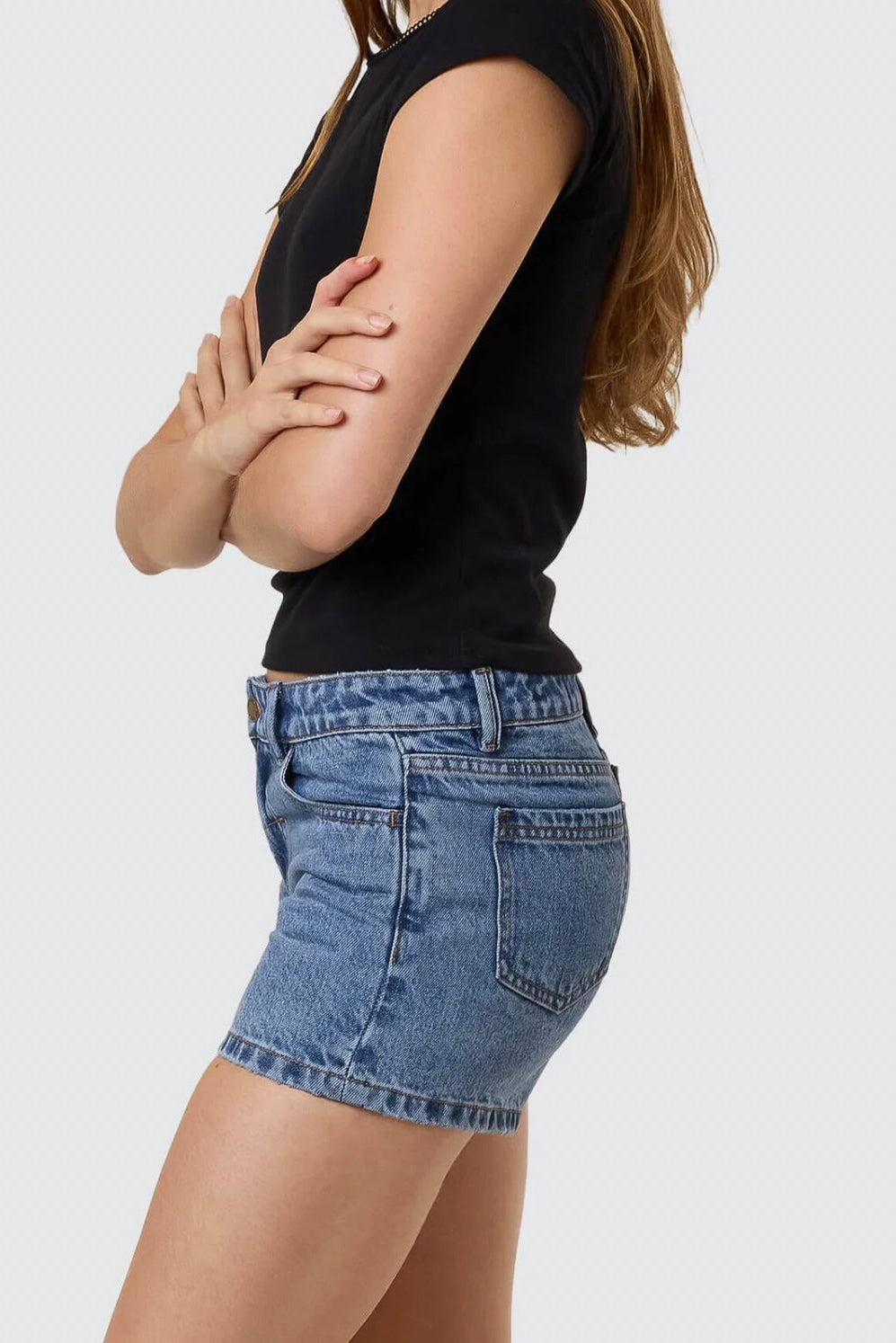 Laidback with street edge, the Daria Short in Stoned Blues is your go-to casual cotton shorts for warmer days. Cut from a sturdy blend of midweight denim and cotton, these high-waisted shorts bring retro vibes with a modern fit. The low-rise waist and light fade nod to classic vintage denim shorts, made to wear on repeat, featuring a classic 5-pocket styling, belt loops, and a handy zip fly. Part of our Thrills shorts women's lineup, this one's built for sun, sweat, and street in summer shorts, Australia style.