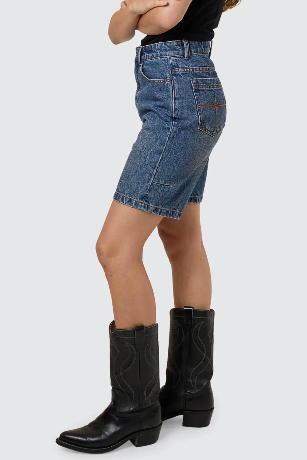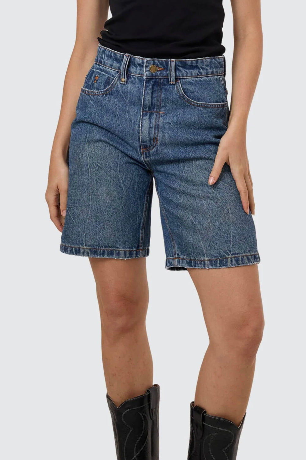 Bold shape meets vintage wash in the Dopamine Reagan Slouch Short in Vanish Mid Blue. Made from heavy-wearing cotton denim, these casual cotton shorts feature a roomy cut, wide leg, longer leg and a mid-rise fit for that effortless, street look. Designed with a classic 5-pocket styling, these vintage denim shorts are a spring and summer must-have. Style it with boots, tanks or cute graphic tees for women. A staple in our Thrills shorts women's collection, this one can be styled with tanks or cute graphic tees for women, finished off with black boots for a put-together ensemble.