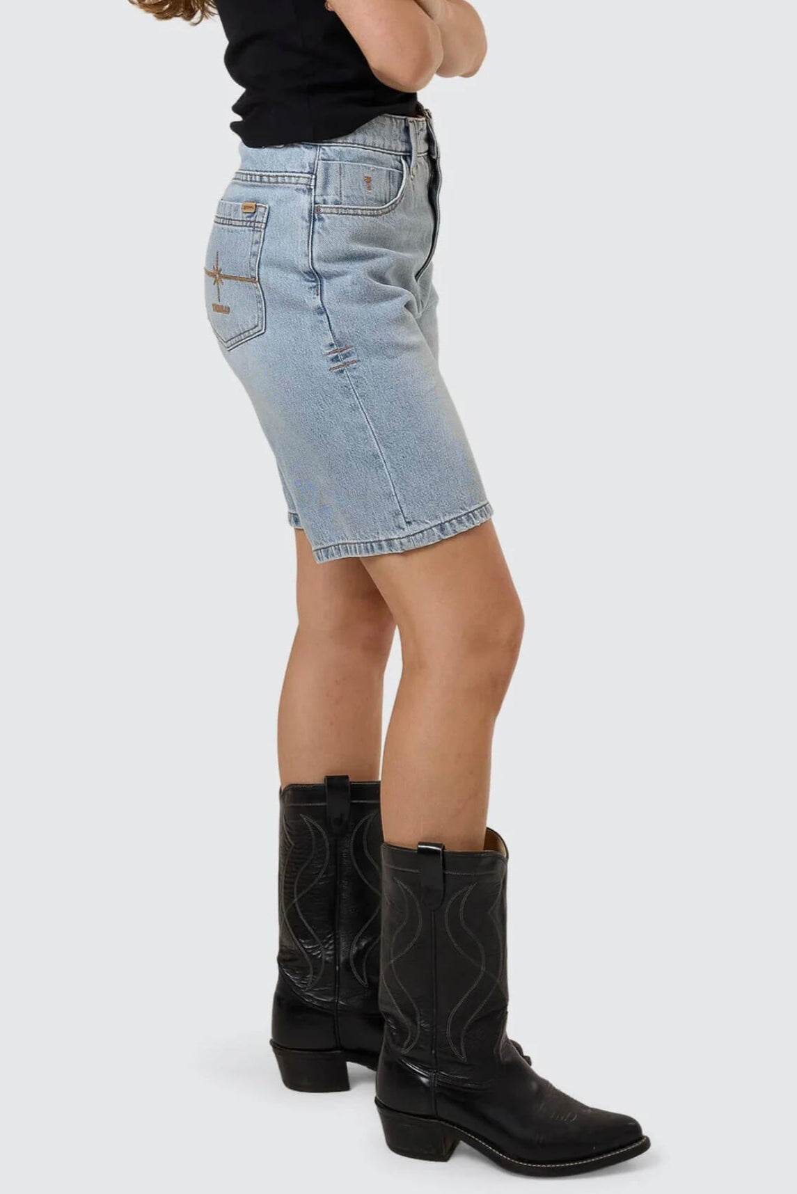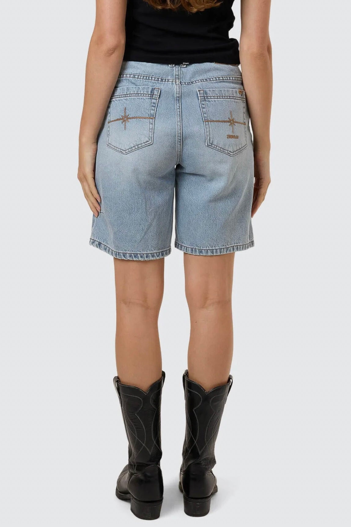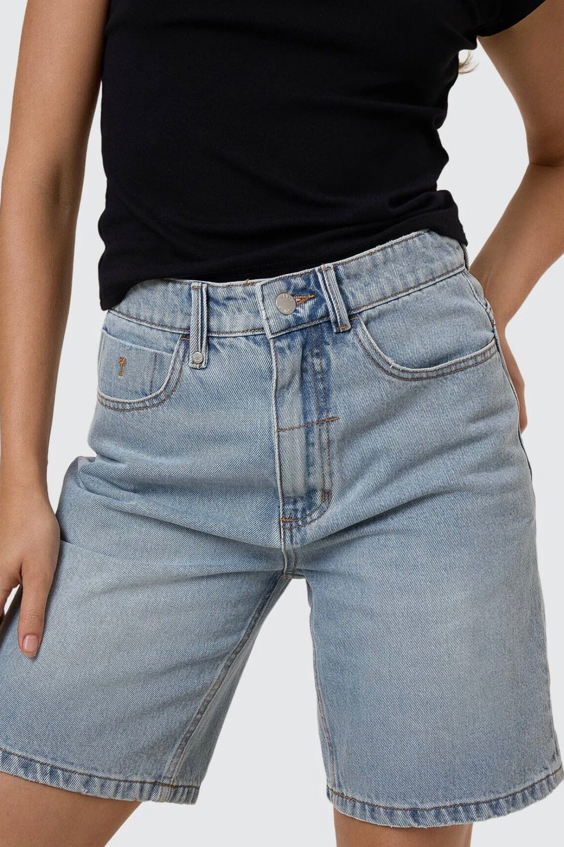 Relaxed 90s inspired, the Dopamine Reagan Slouch Short in Dusk made from heavyweight cotton denim, these casual cotton shorts feature a mid-rise waist, wide leg opening, in a faded wash for an effortlessly worn-in feel. Made to be lived in.