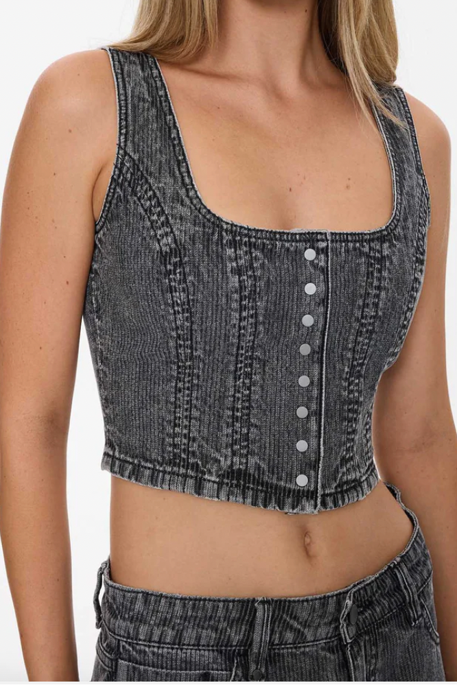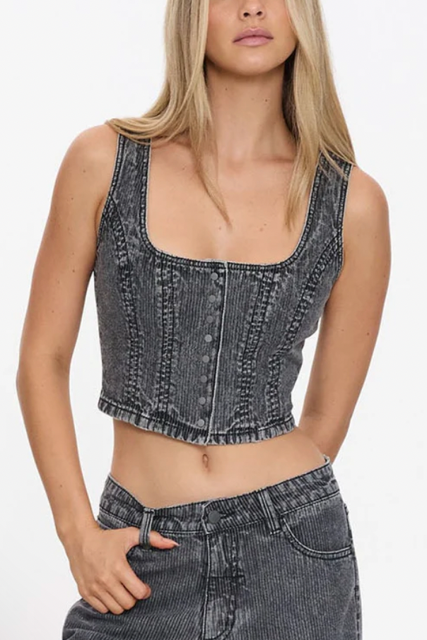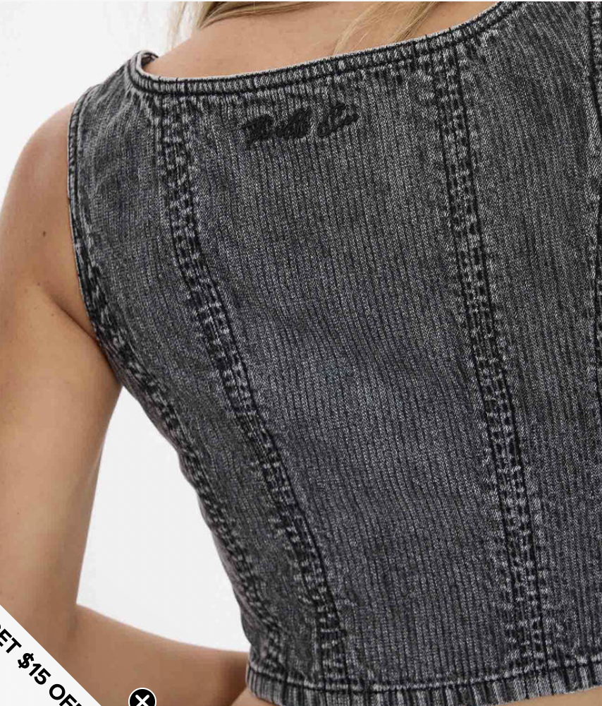 The Good Intentions Denim Top in Smoked Rib has you covered. Crafted from lightweight, non-stretch cotton denim, this iconic piece from our women's top au drop delivers a fitted, flattering silhouette with wide straps, a scooped neckline and a cropped cut that nails edgy femininity. The smoky washed finish adds that worn-in, vintage Thrills vibe while keeping it versatile for summer styling