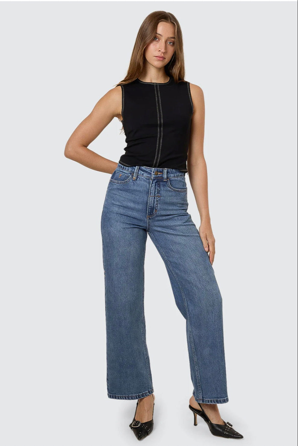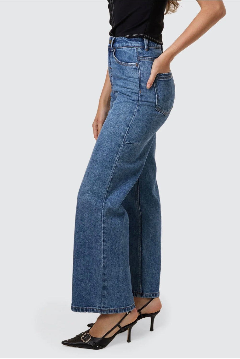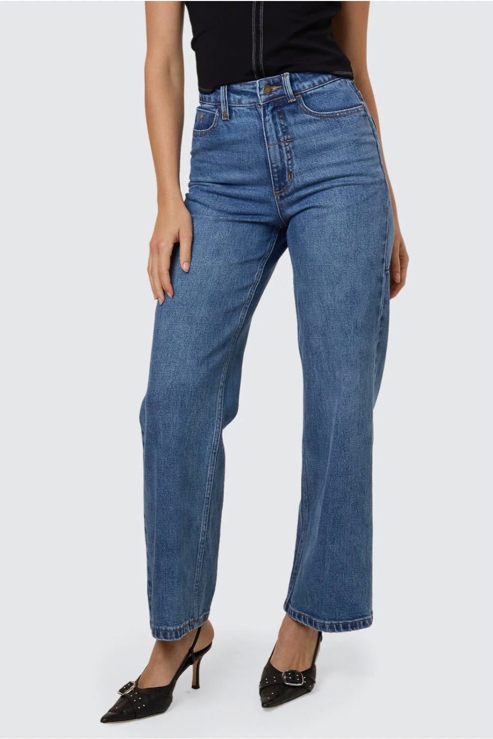 Thrills Holly Stretch Jean in Stoned Blues a favourite flattering high-rise waist and subtle flare, these relaxed-fit pants hug through the hips before opening into a soft, wide leg. Made from premium cotton denim with a touch of stretch, these Thrills pants are comfy, structured, and ready for everyday wear. Finished in a classic vintage wash with a 5-pocket styling. Timeless denim fit and wash.