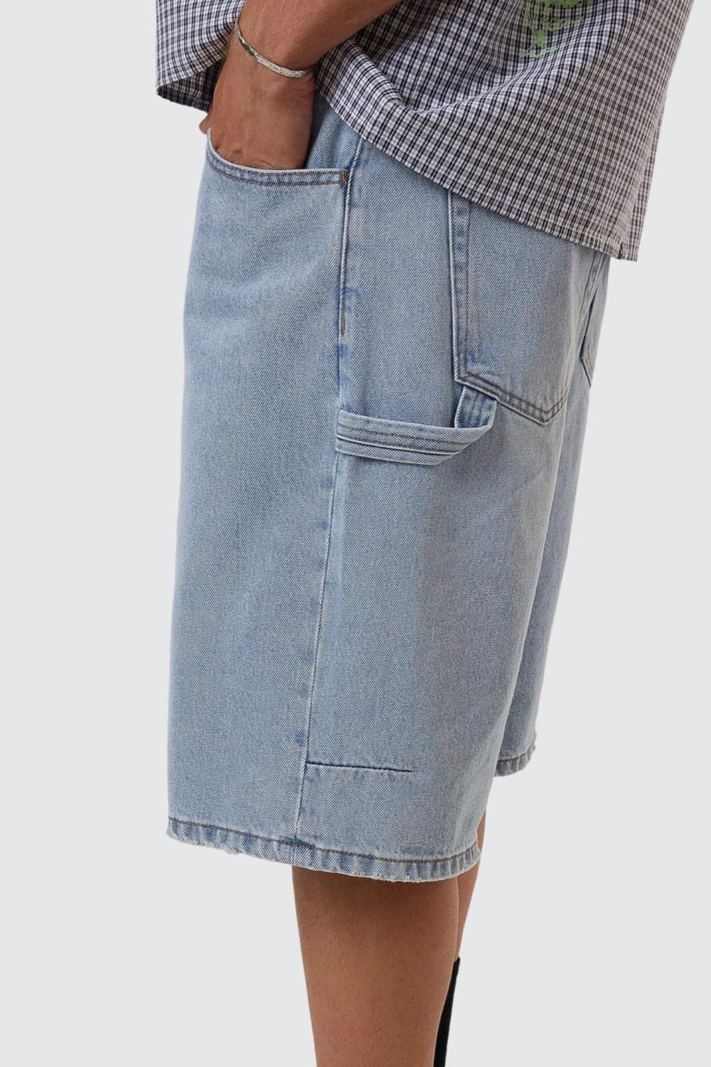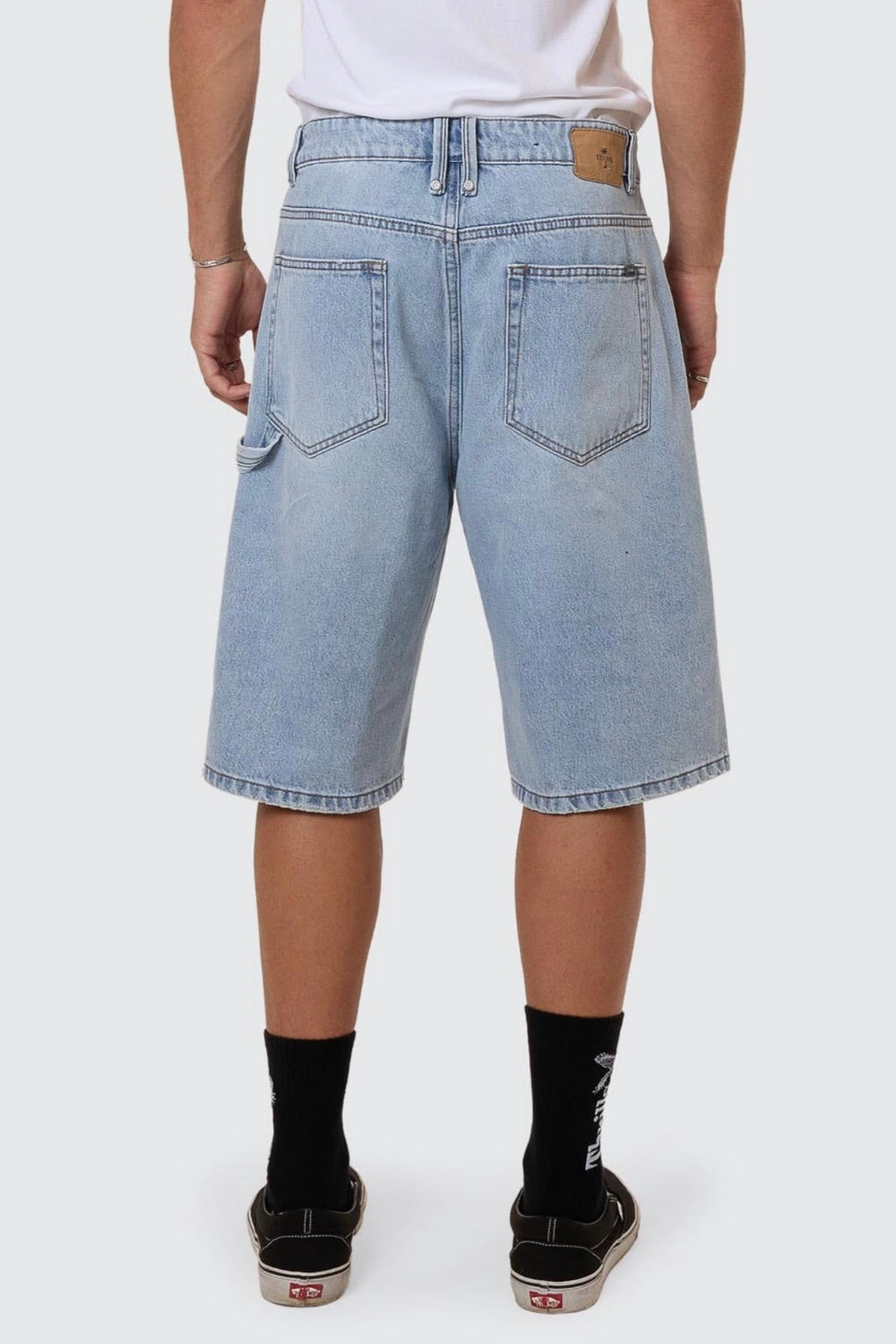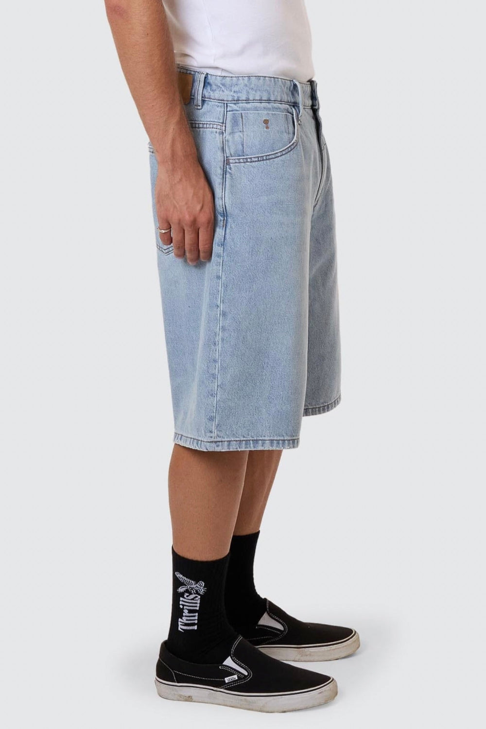 he Slacker Denim Short in Dusk is your vintage denim shorts made for slow days and fast nights. Cut from heavyweight cotton denim and washed down to a perfect faded hue, the Thrills shorts bring in rugged ease with attitude. Featuring a wide leg, relaxed fit, and a classic 5-pocket styling, these are your no-fuss casual cotton shorts made for repeat wear. Whether you're chasing summer shorts Australia style or everyday fits with edge, this pair earns a permanent place in your men's streetwear rotation. They pair great with vintage muscle tees for an effortless, warm-weather look.