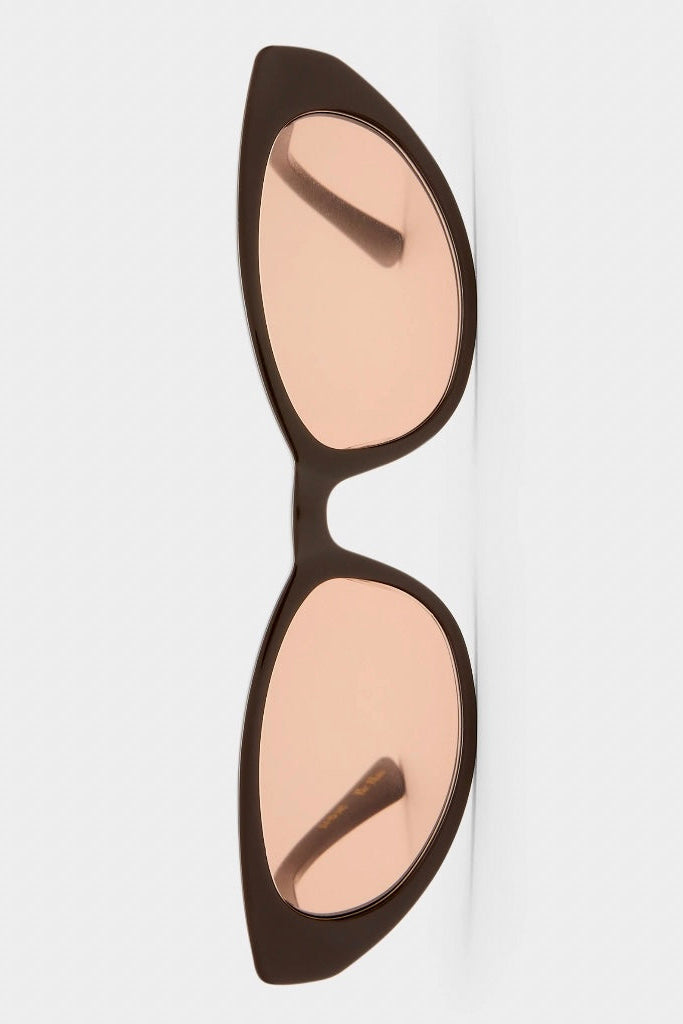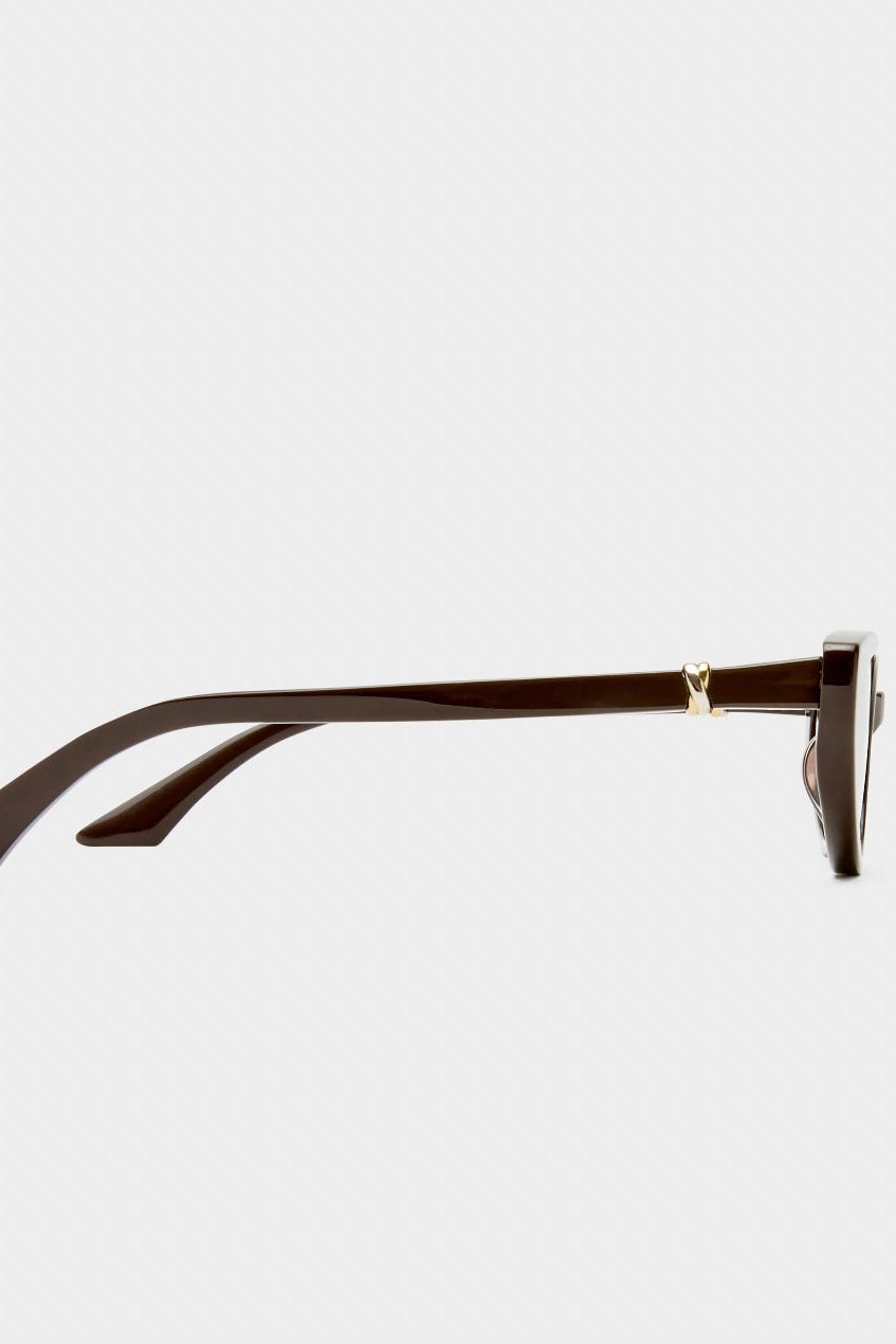 • Finished in a premium dark chocolate frame with gold mono lenses.
