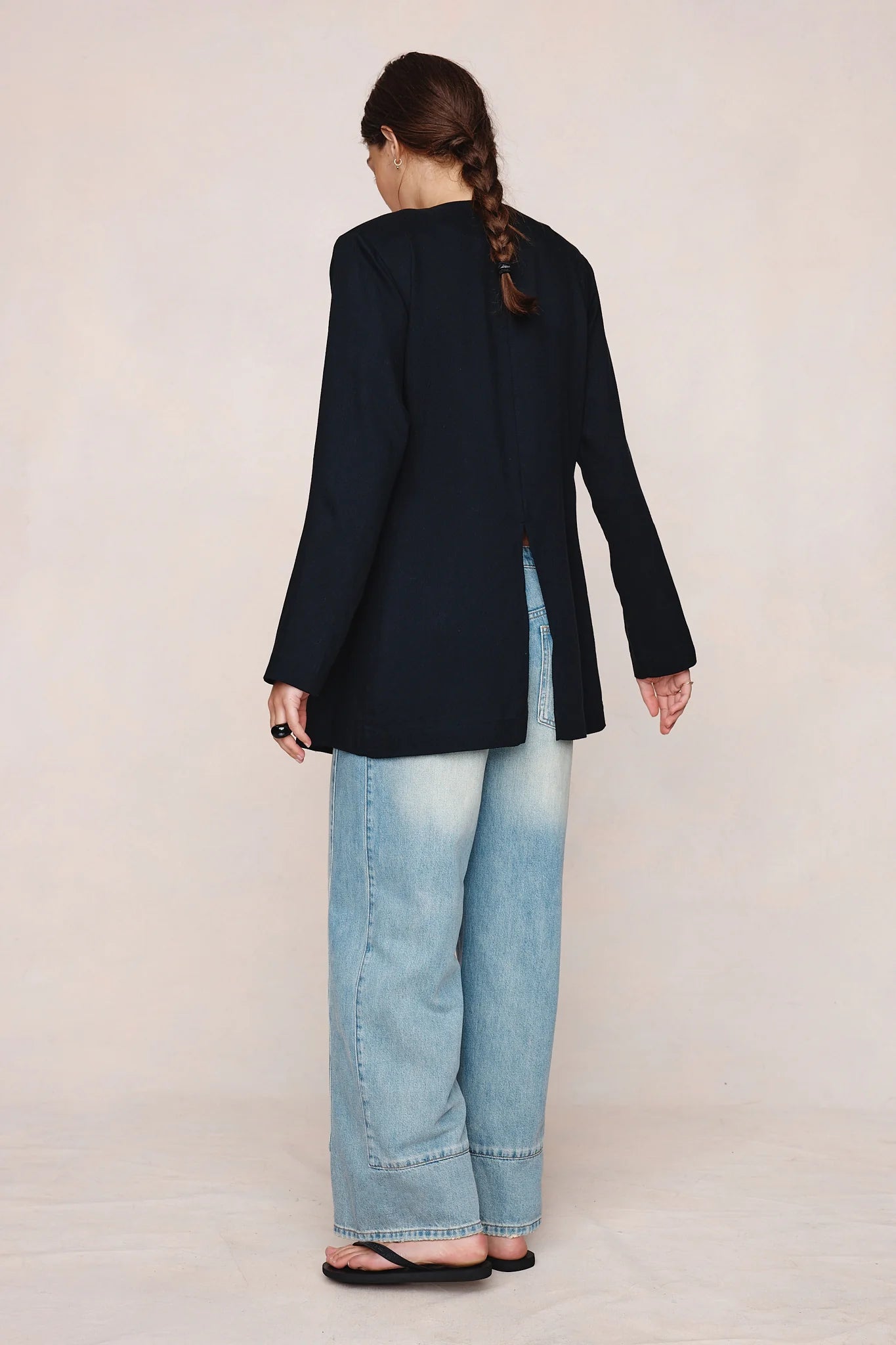 Longline jacket in textured tencel–wool twill with a collarless neckline, fully lined with subtle padded shoulders, covered button fastening, open front, long sleeves, and a centre-back vent. Stunning jacket, elegant refined yet easily worn casual too.