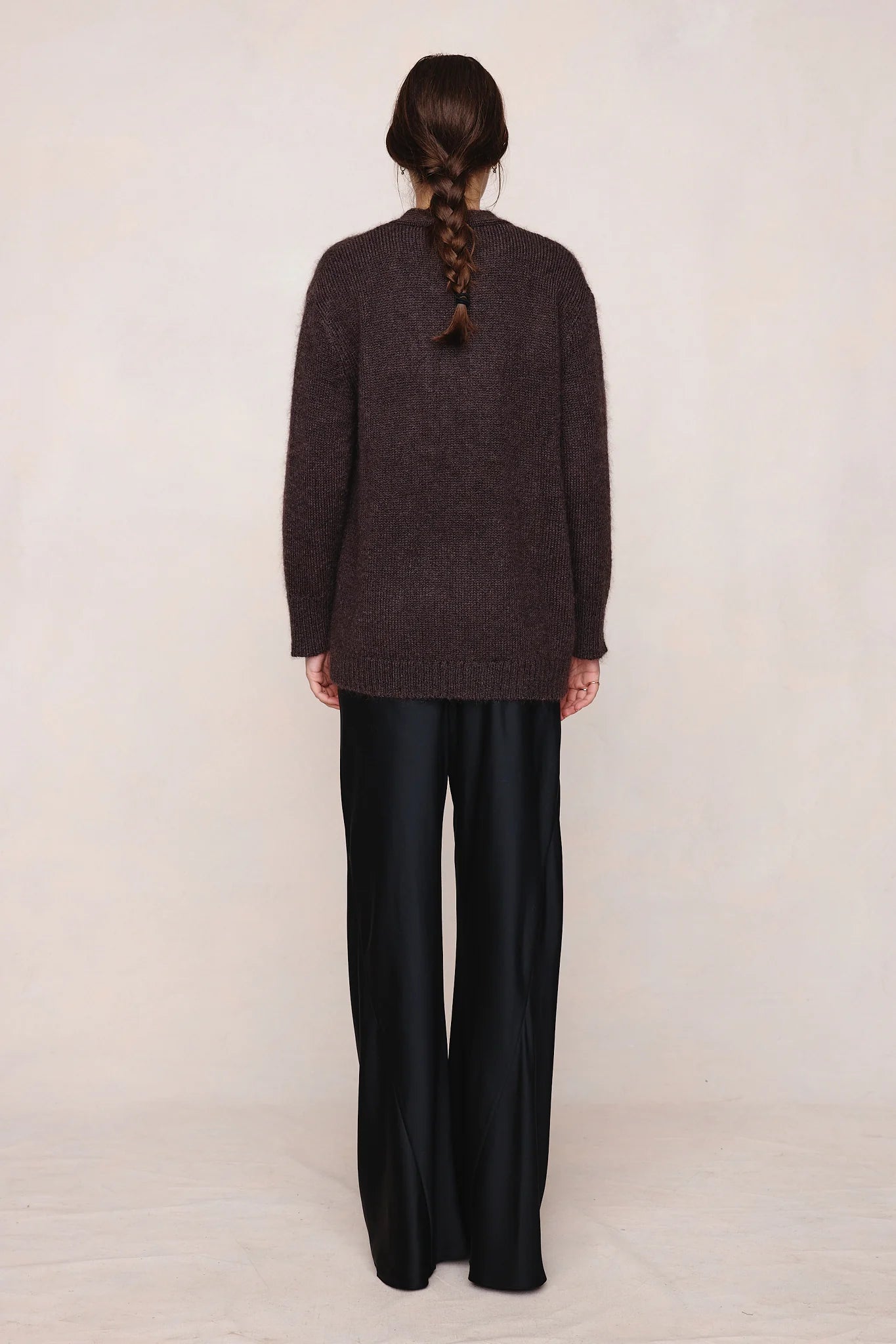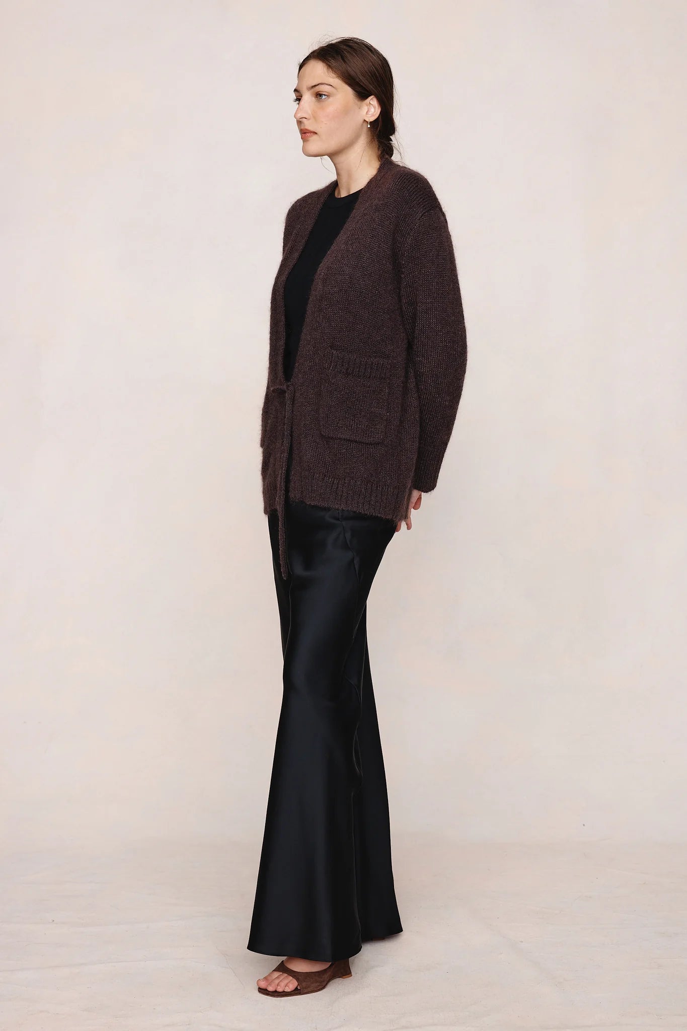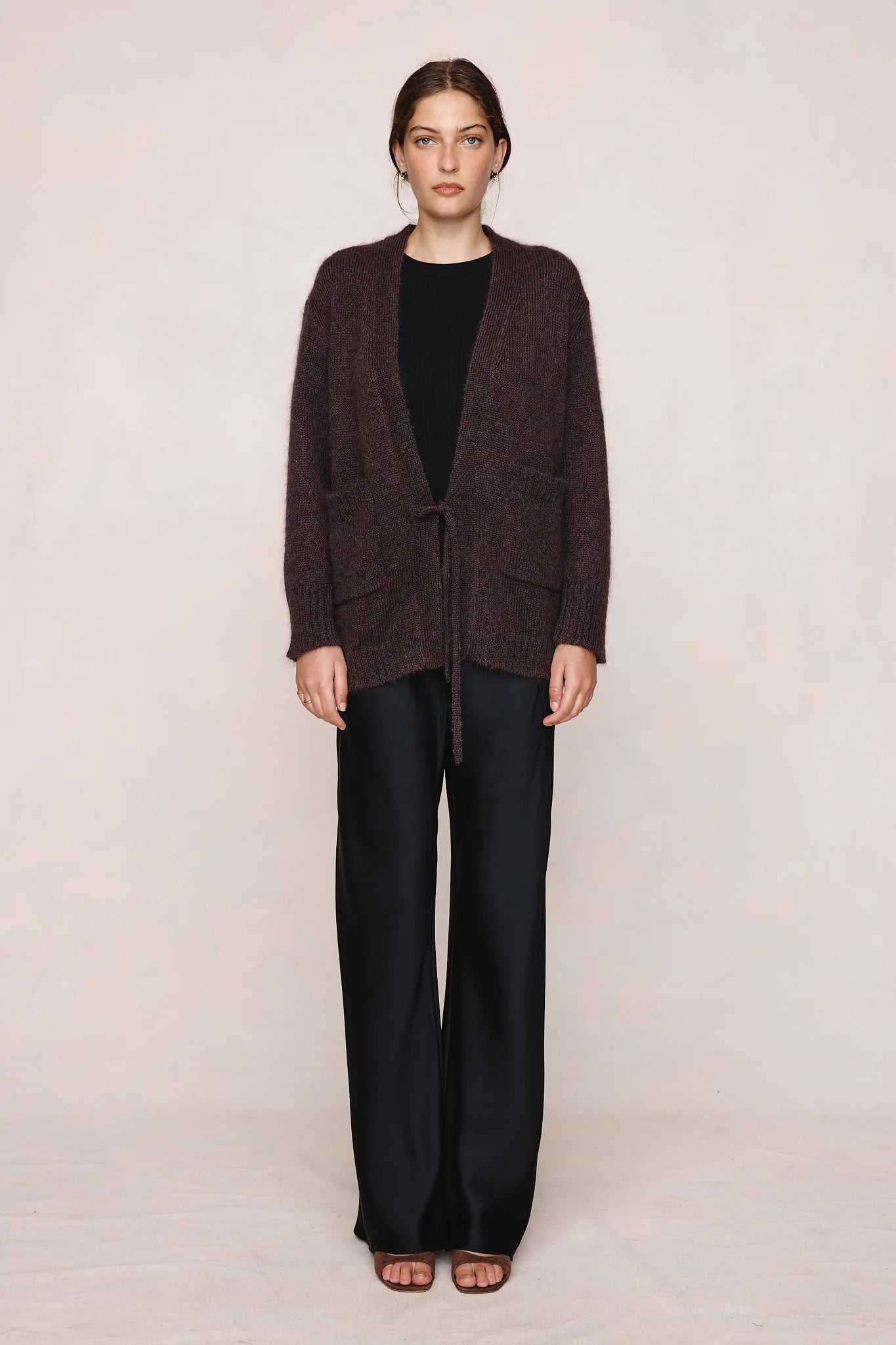 Dita cardigan in mohair–merino with an oversized shape, ribbed cuffs, front patch pockets, and a single adjustable tie fastening.
