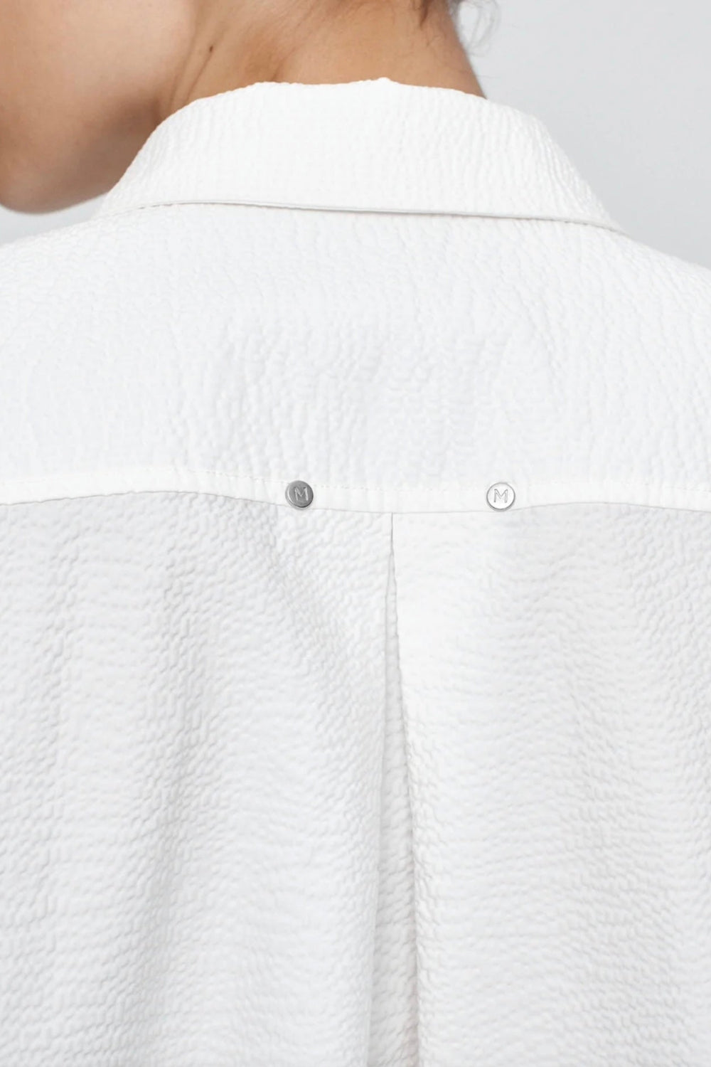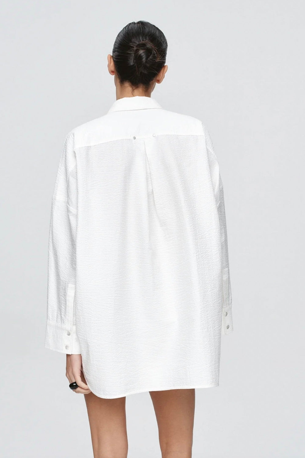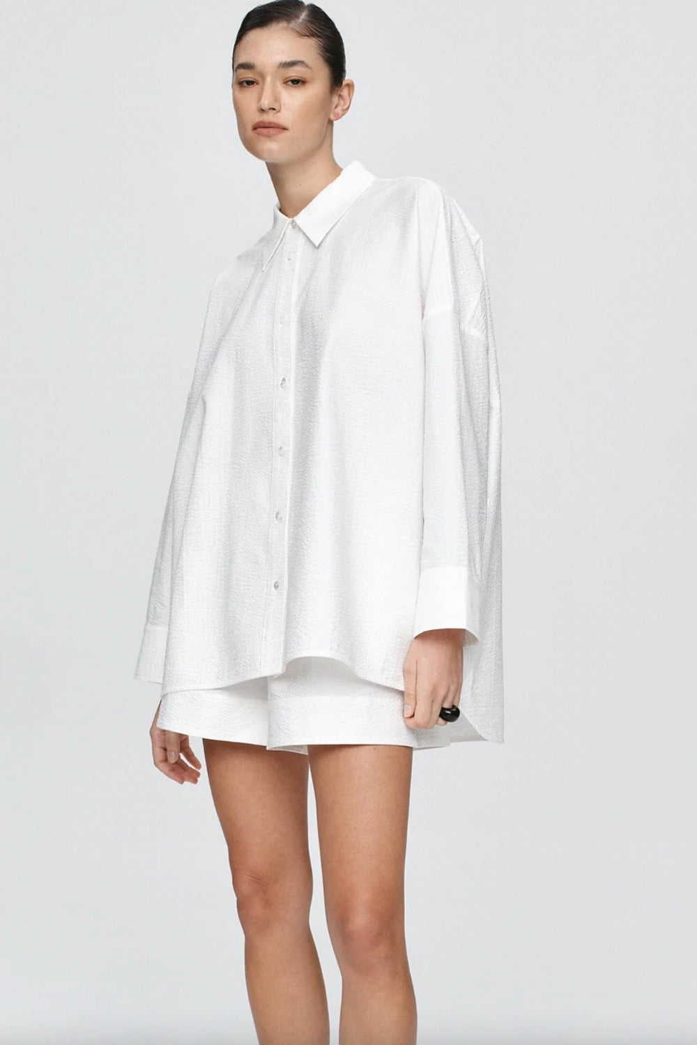 The perfect oversized shirt, this edition of the Edie is crafted from a crisp 100% cotton cloth, offering a soft yet structured hand feel. Designed with a standard collar and a button-down front finished with natural shell buttons, it features an oversized, boxy shape that falls slightly longer at the back. Wide, long sleeves complete the relaxed look, detailed with two shell buttons at each cuff for a refined finish.