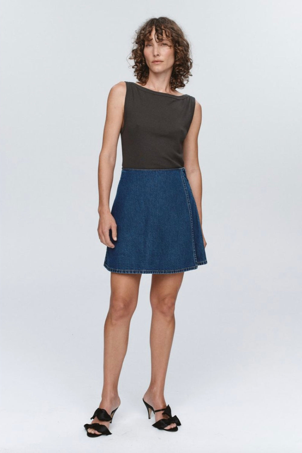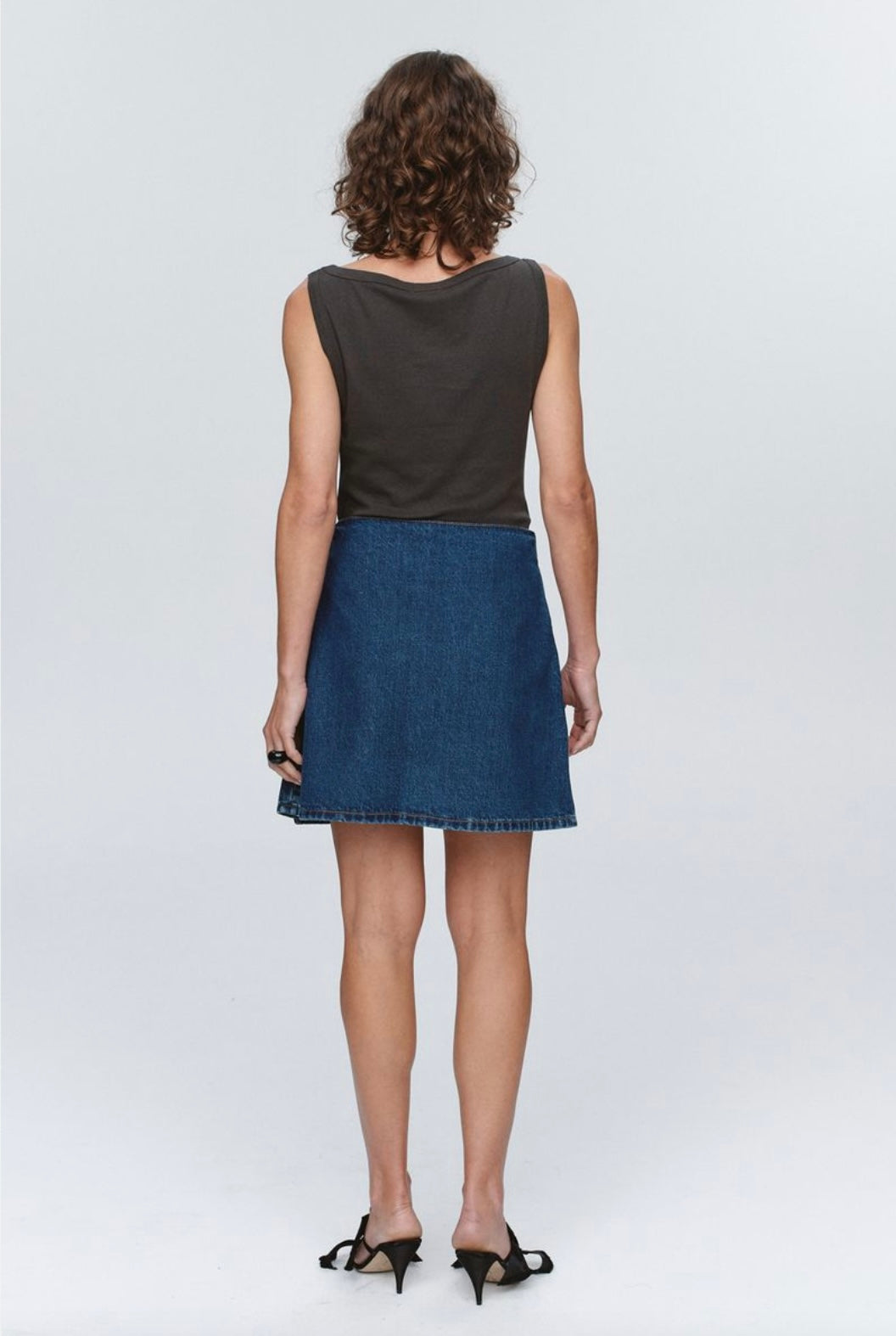 A-line mini skirt constructed from 100% organic cotton in a washed indigo finish. Designed with a clean, minimal waistband and secured with an invisible side zip closure for a streamlined shape. Cut to sit at the waist and skim the hips with a structured yet soft drape.