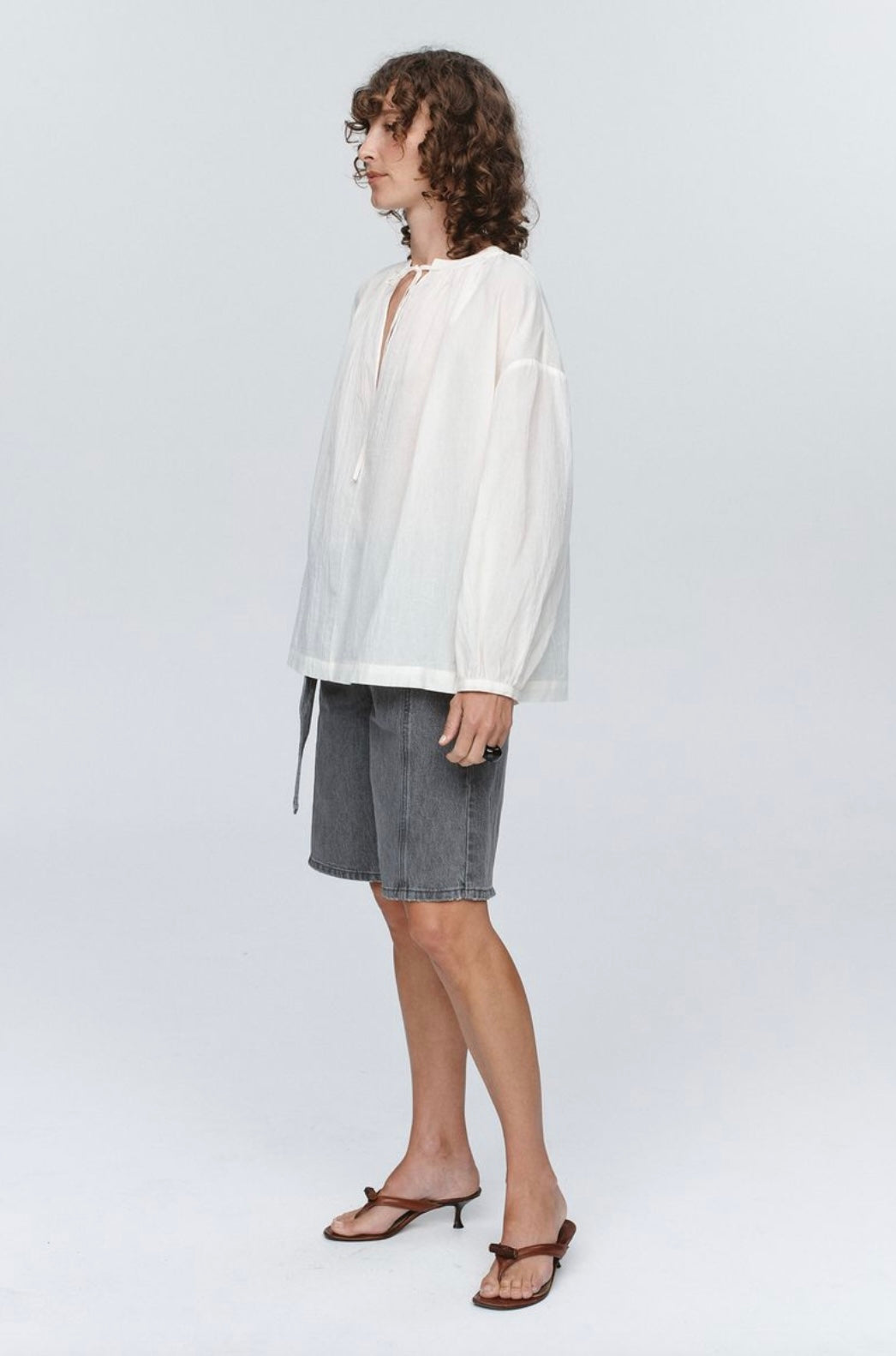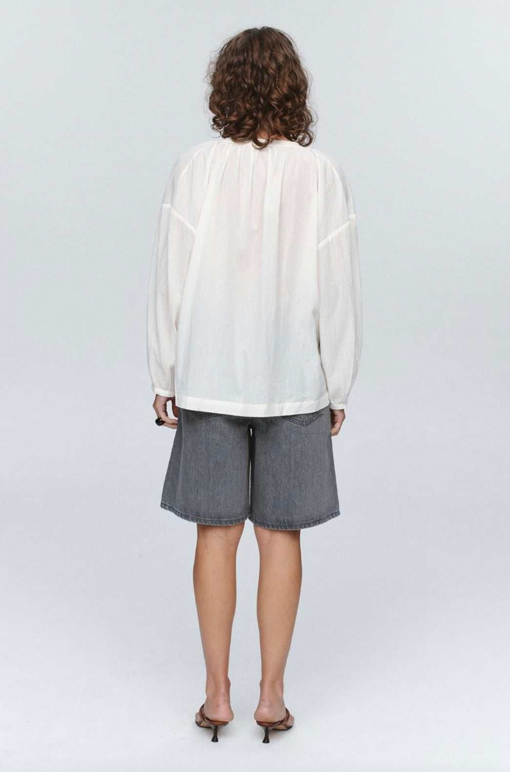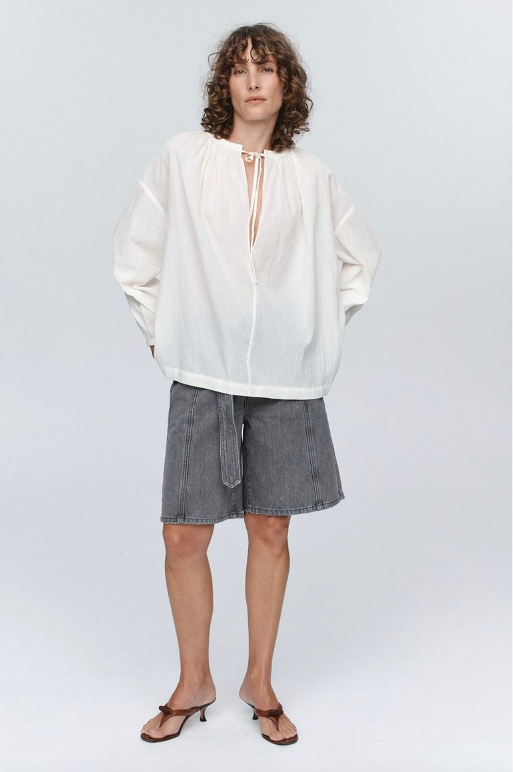 A relaxed-fit top constructed from lightweight 100% cotton. Features a centre front seam with a deep V-neckline and functional tie closure. Gathering around the front and back neckline to create volume. Dropped shoulder seams and full-length sleeves finished with clean hems. The fabric's soft drape and breathable quality make it suitable for warm-weather wear.