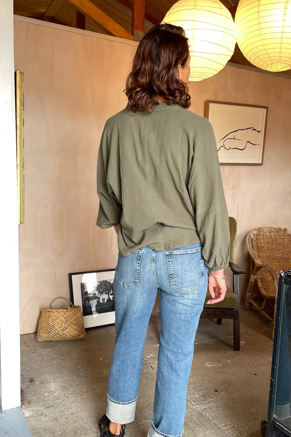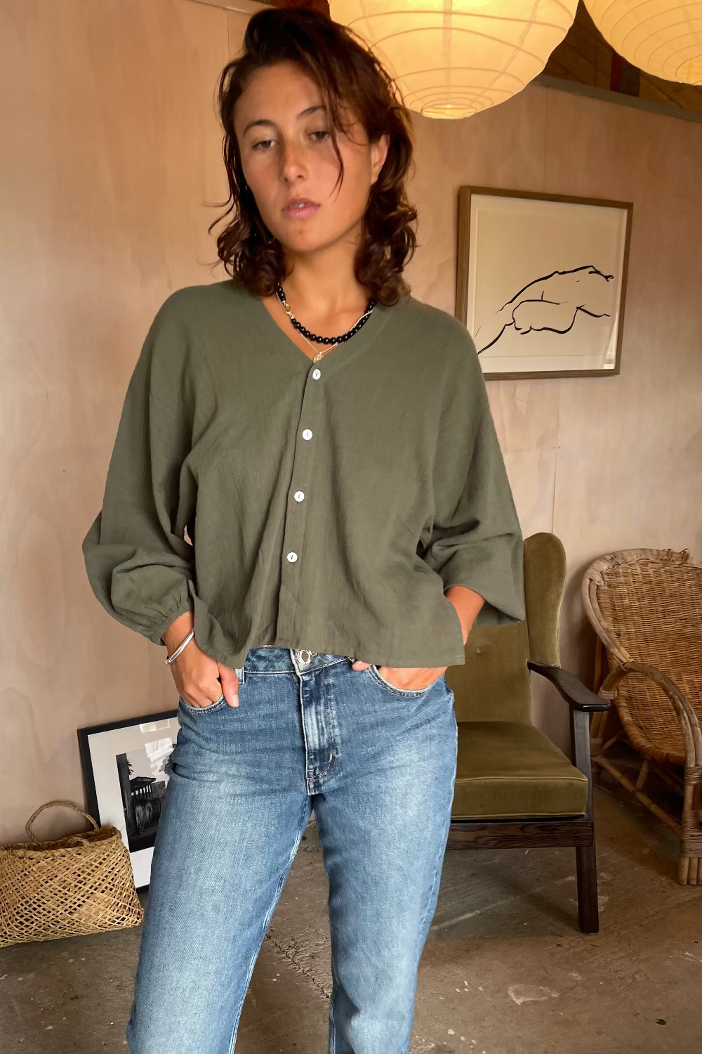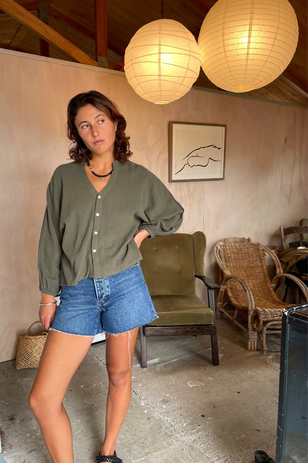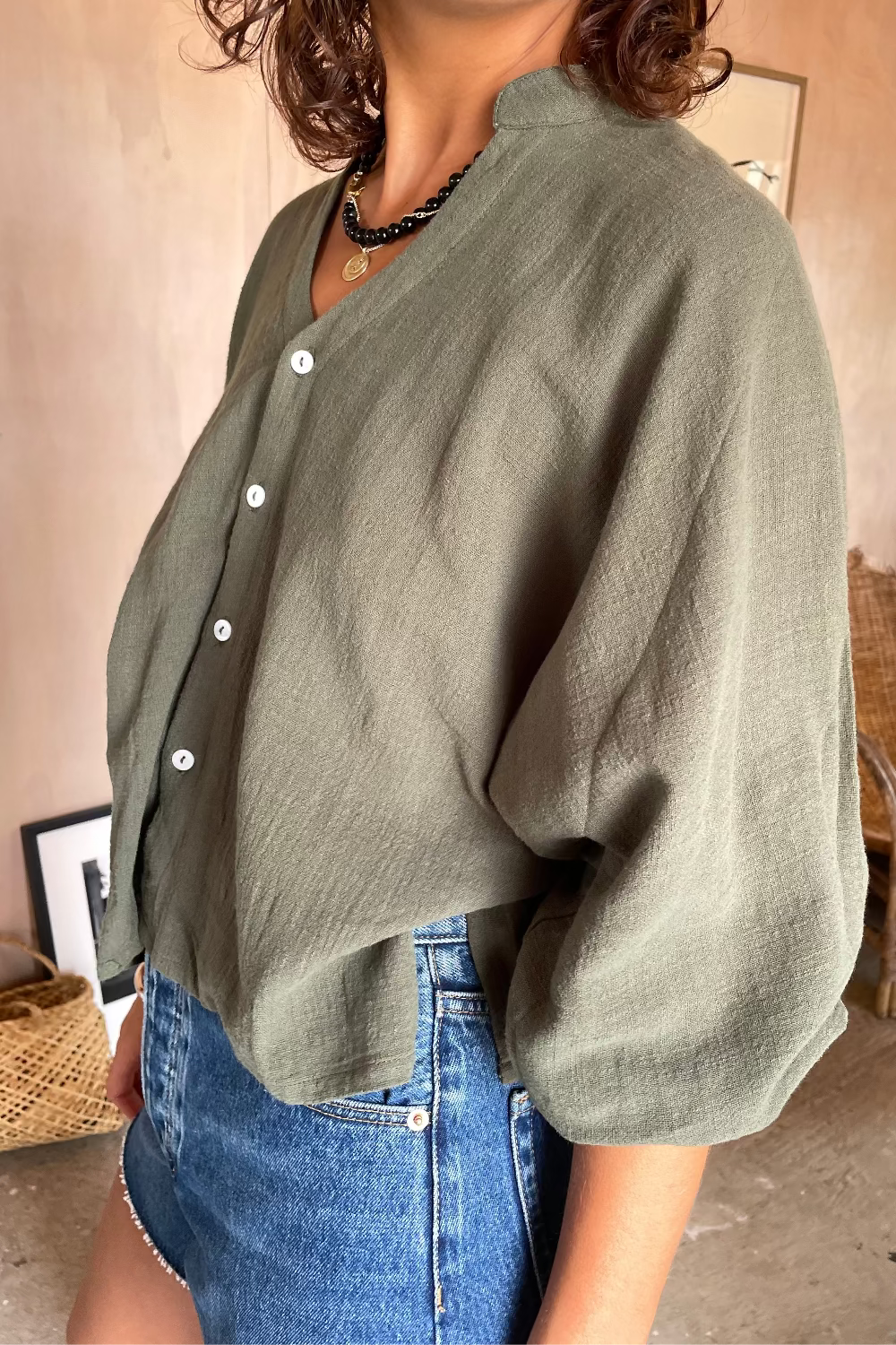 Haze Blouse is a batwing style blouse with a flattering V neckline and elasticated sleeve cuffs for pushing up arm and creating a different look. Shell buttons down front, small shelf collar and shaped hemline with side splits. A much loved timeless, versatile style, looks great worn open as a jacket too.