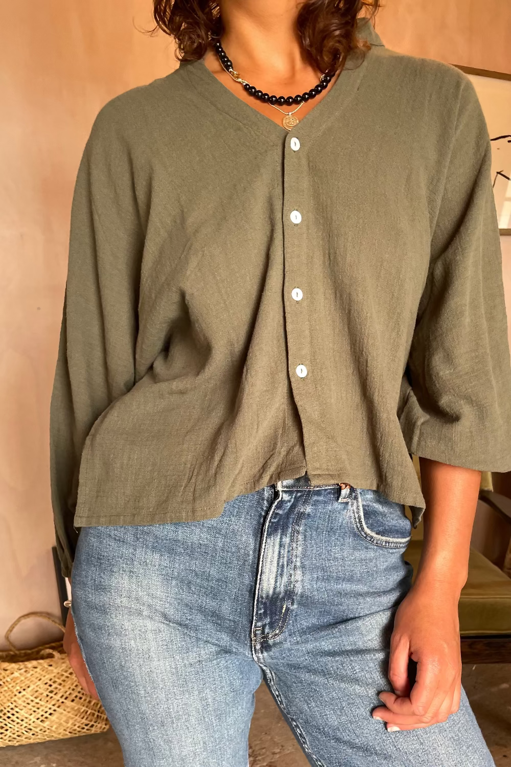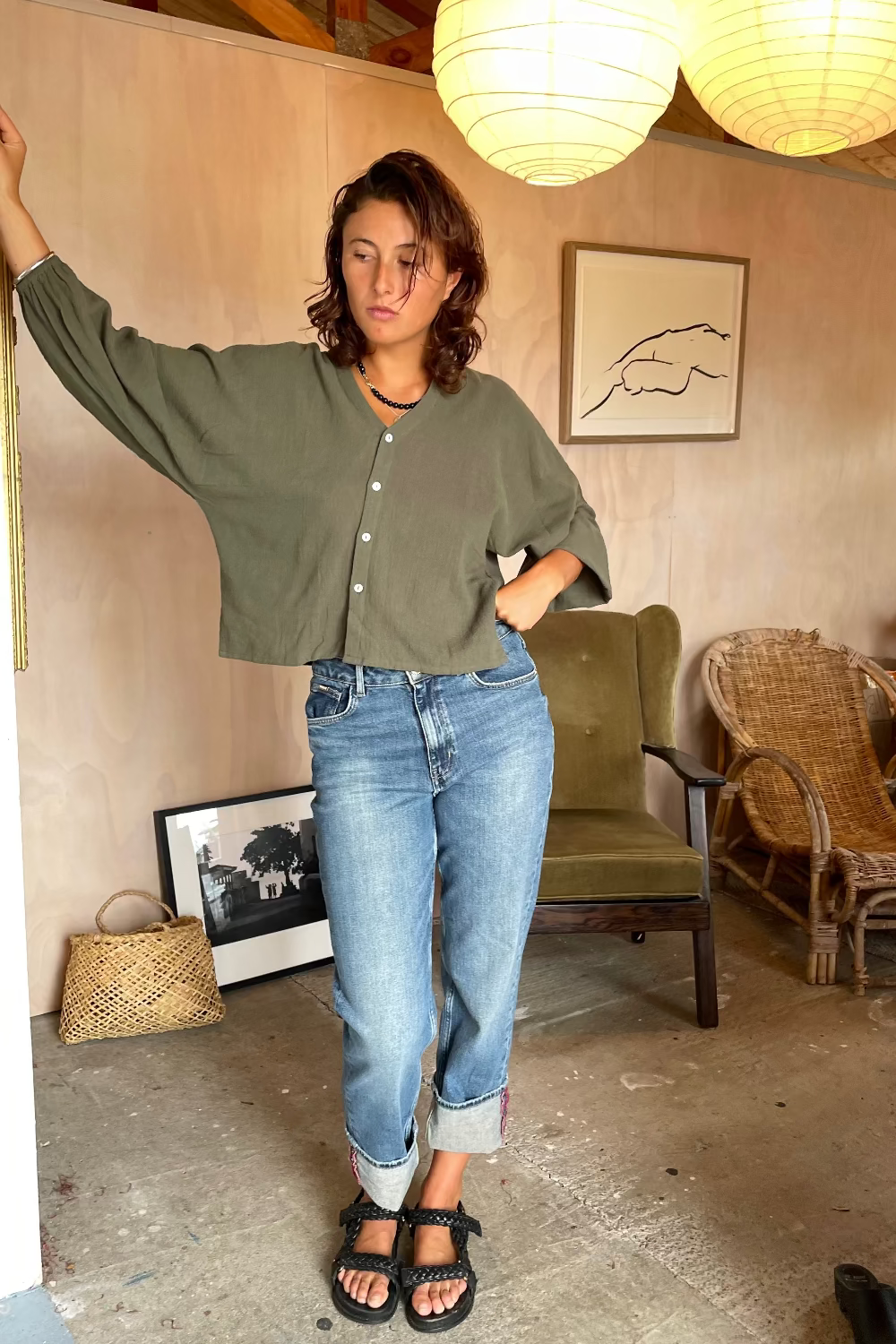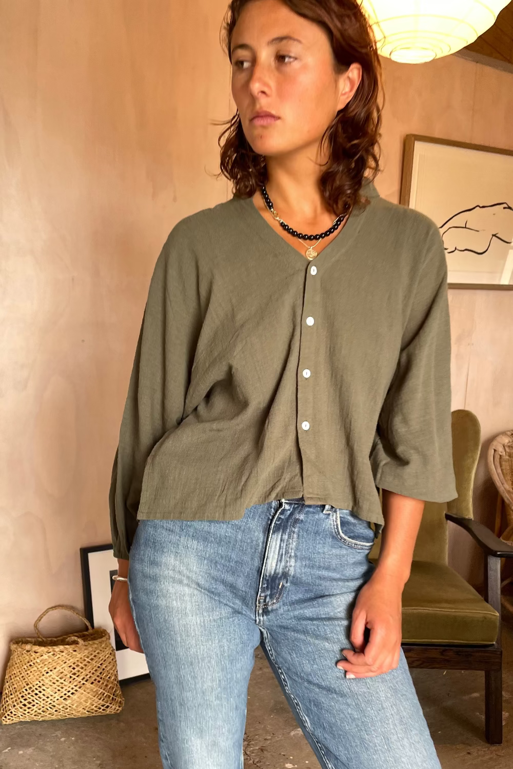Haze Blouse is a batwing style blouse with a flattering V neckline and elasticated sleeve cuffs for pushing up arm and creating a different look. Shell buttons down front, small shelf collar and shaped hemline with side splits. A much loved timeless, versatile style, looks great worn open as a jacket too.