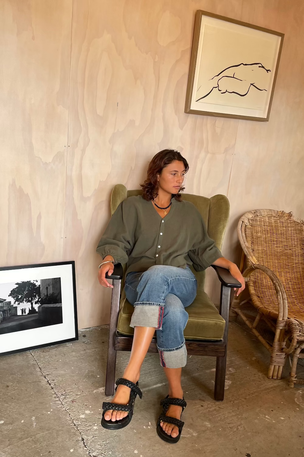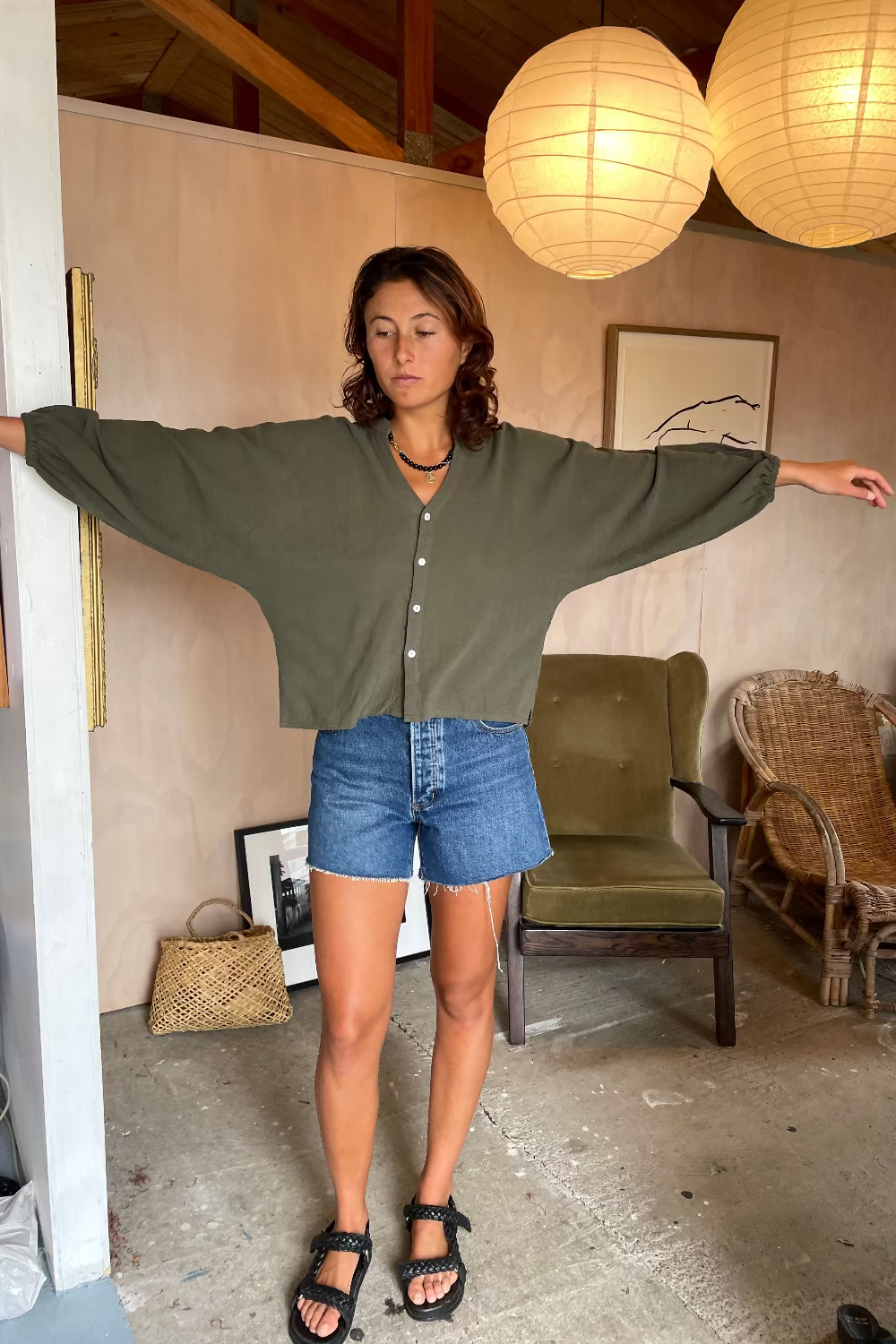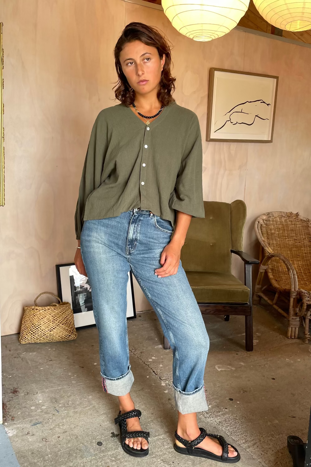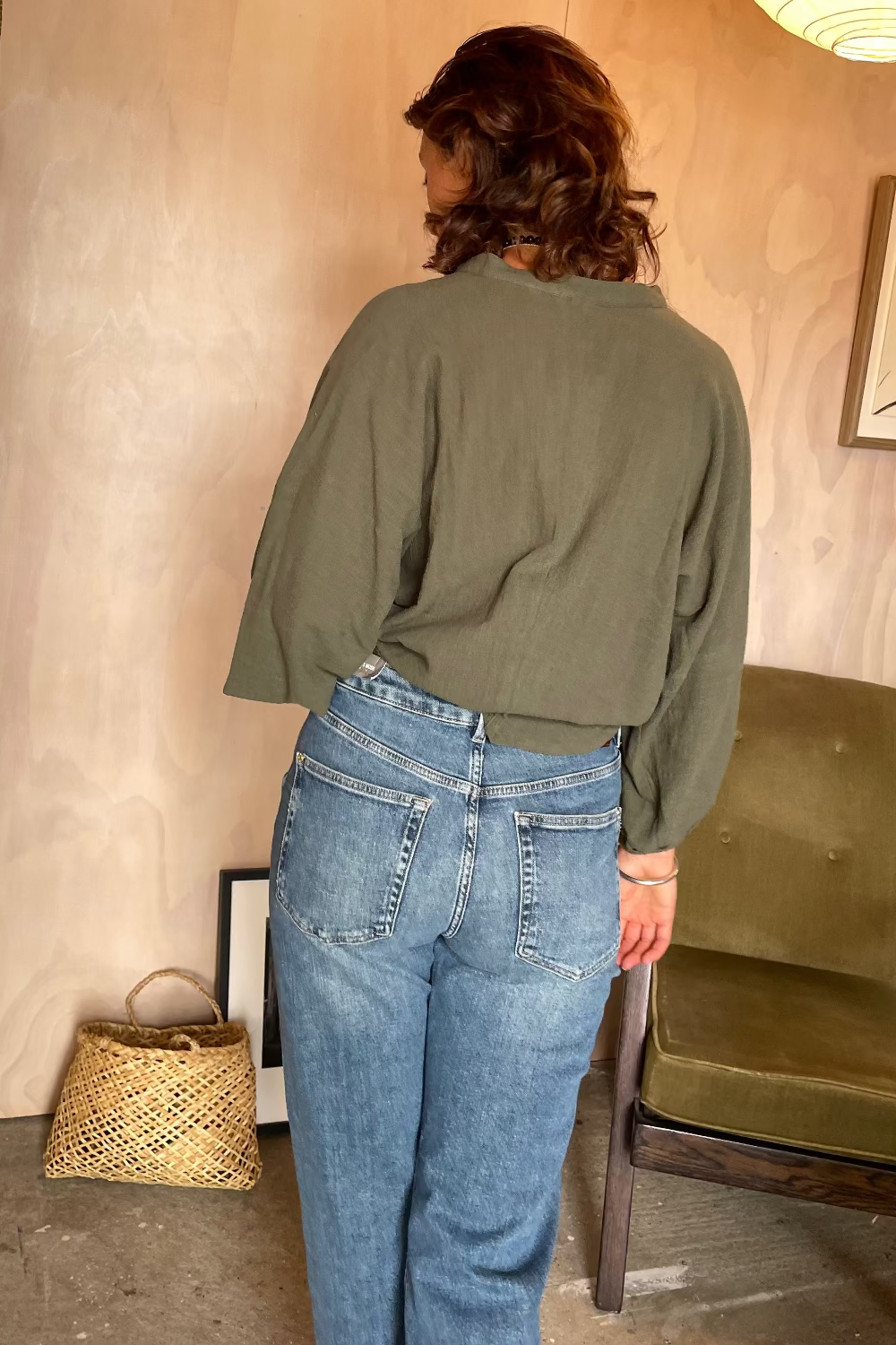 Haze Blouse is a batwing style blouse with a flattering V neckline and elasticated sleeve cuffs for pushing up arm and creating a different look. Shell buttons down front, small shelf collar and shaped hemline with side splits. A much loved timeless, versatile style, looks great worn open as a jacket too.