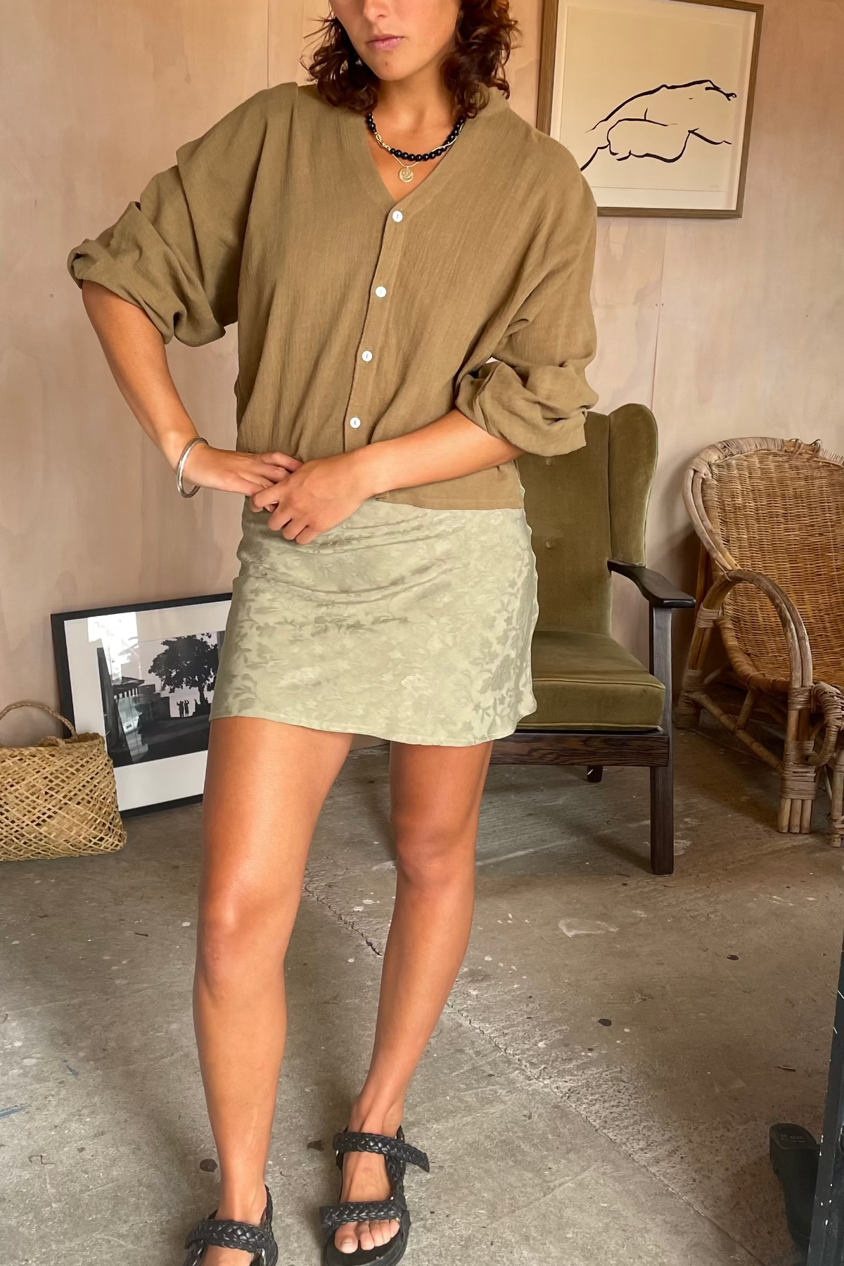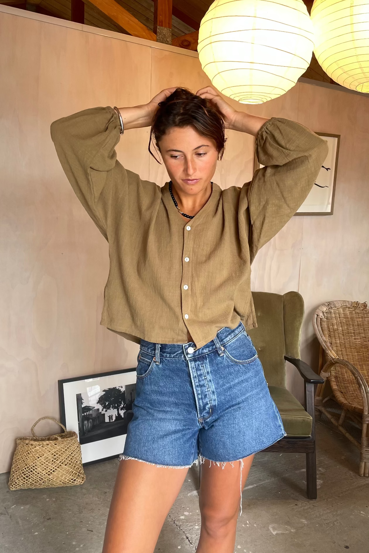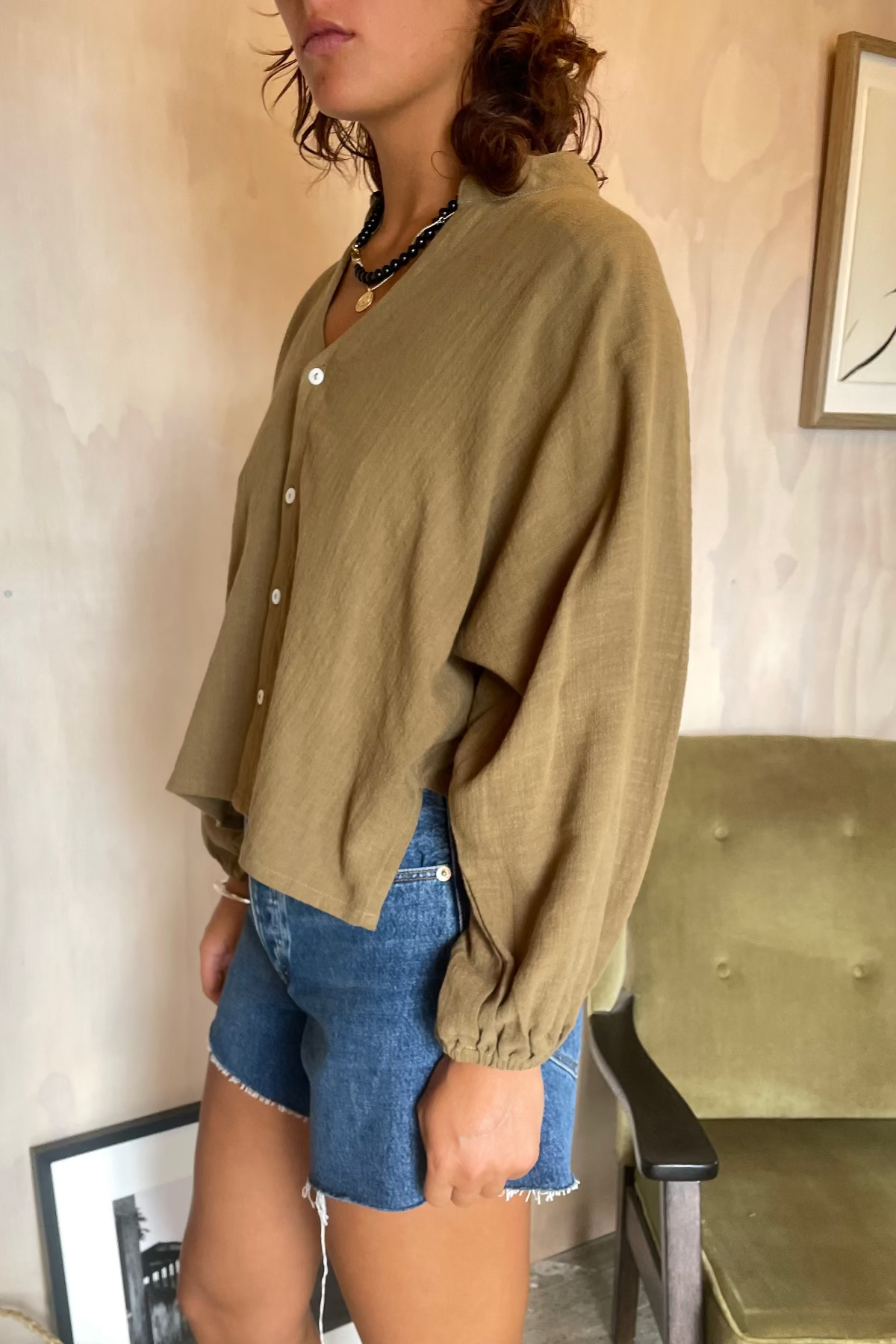 Haze Blouse is a batwing style blouse with a flattering V neckline and elasticated sleeve cuffs for pushing up arm and creating a different look. Shell buttons down front, small shelf collar and shaped hemline with side splits. A much loved timeless, versatile style, looks great worn open as a jacket too. We dye our colours.