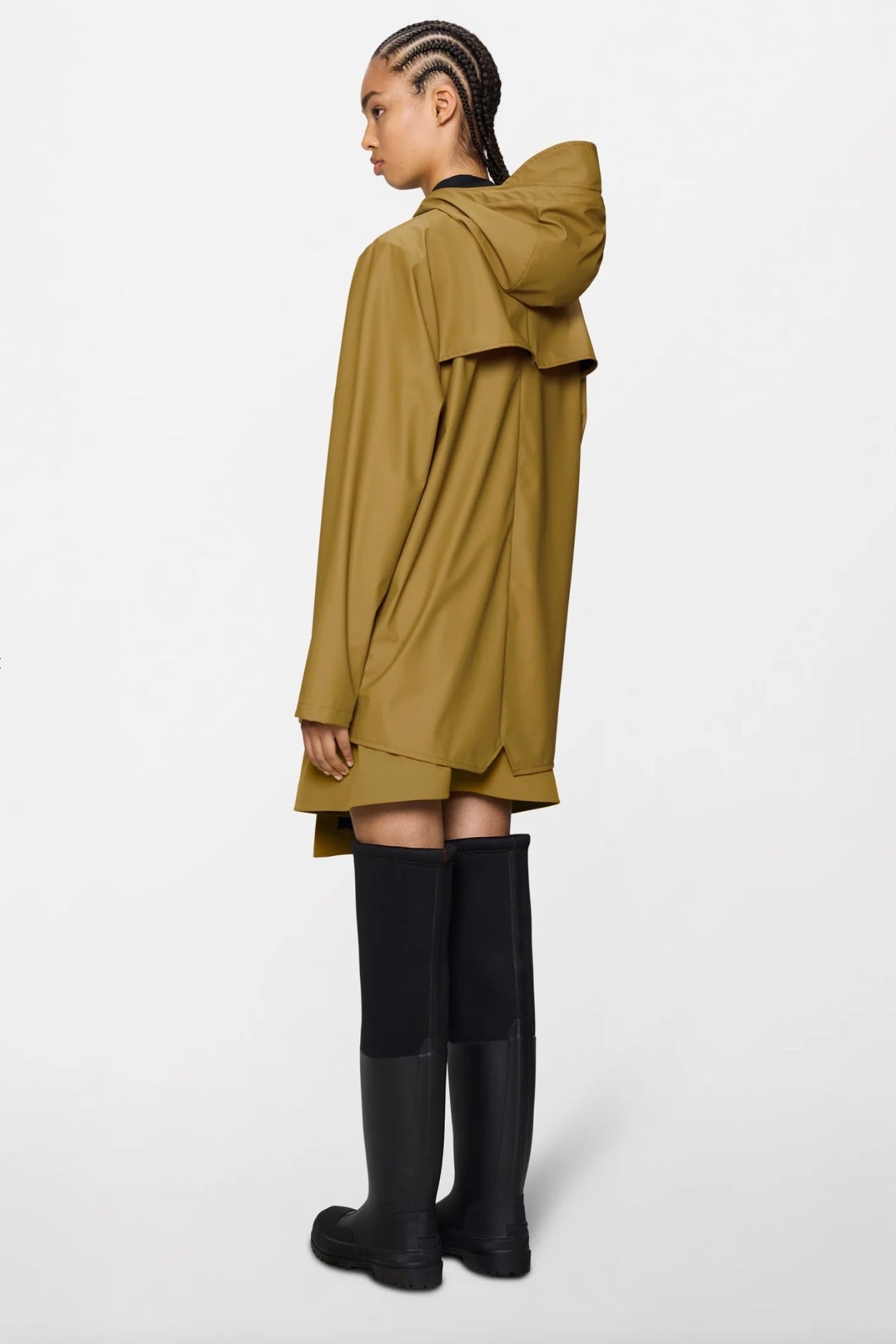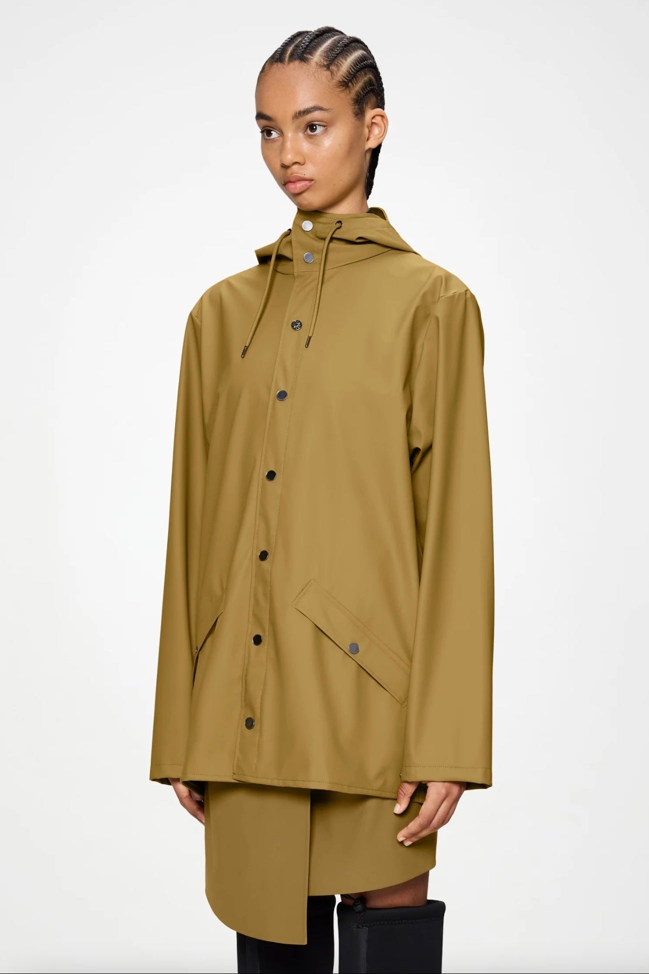 Jacket is cut from Rains' signature PU fabric and features welded seams. The finish is lightweight with a smooth feel.