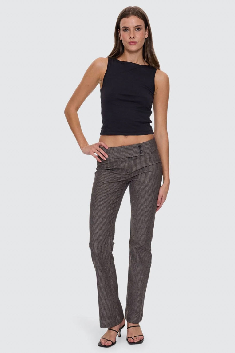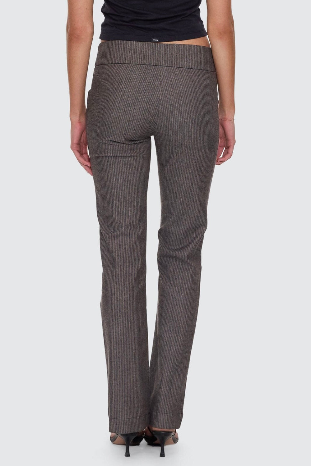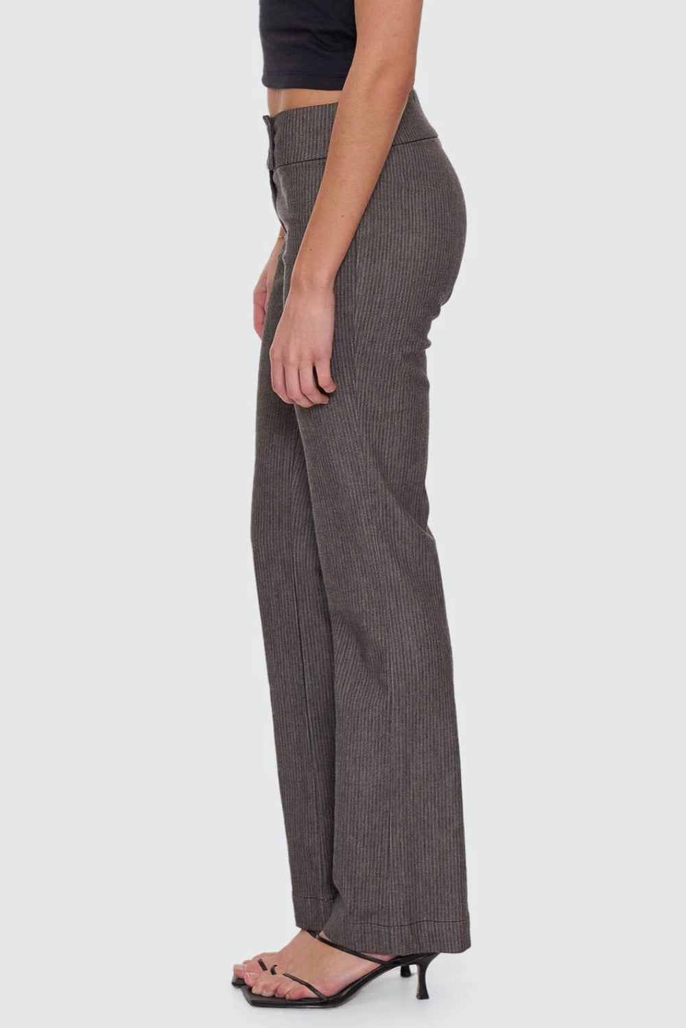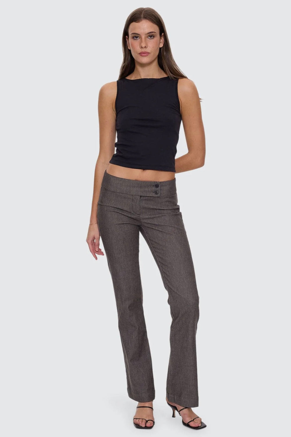 The Ritual Stripe Pant in Carbon is where sharp tailoring meets laid-back ease. These striped women's trousers feature a subtle pinstripe pattern that brings a polished edge to your everyday fits. With a low-rise waist, slim hips, and a gentle flare at the hem, they’re made to flatter without feeling too formal. The carbon colour pants keep the palette grounded, making them easy to style with oversized graphics tees, cropped tanks, or striped button shirts. Crafted from a soft yet structured poly-cotton blend with a touch of stretch, they move with you and hold their shape all day long. Whether you're heading out or dressing down, these are your go-to casual relaxed-fit trousers with just enough attitude and understated appeal. Finished with a clean waistband and tailored seams, the Ritual stripe pant brings that Thrills balance of effortless cool and subtle structure. Your next fave pair of street-style pants—refined, relaxed, and ready for anything.