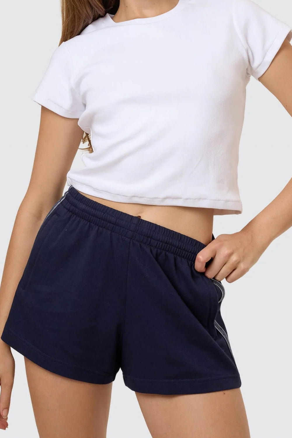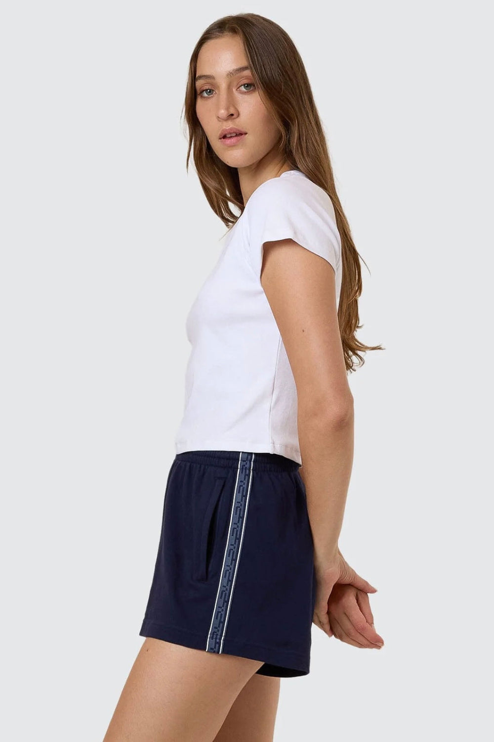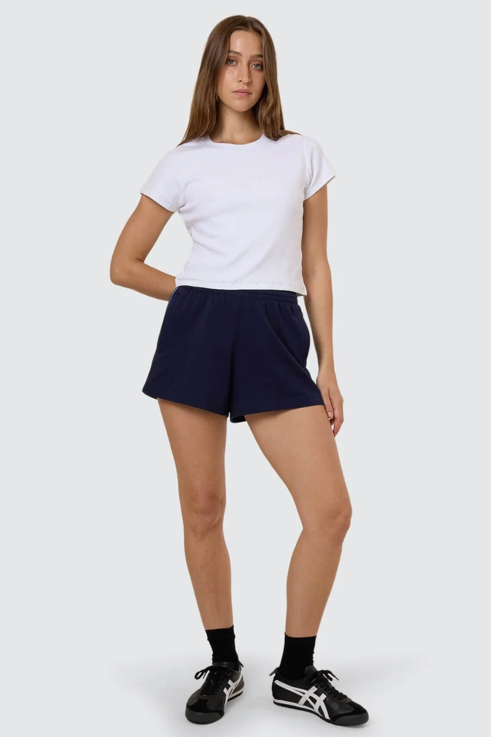 The TC Insignia Track Short in Peacoat offers a track-ready fit with off-duty flair. Made from soft cotton loop-back fabric, it delivers breathable comfort and everyday wear, featuring a relaxed mid-rise waist, elasticated waistband, and curved hem. Part of our spring Thrills shorts women's range, these casual cotton shorts inject throwback athletic energy into your warm-weather rotations. Pair with tanks, crops or womenÕs casual tees with graphics for a sporty, street-ready look perfect for long hot days.