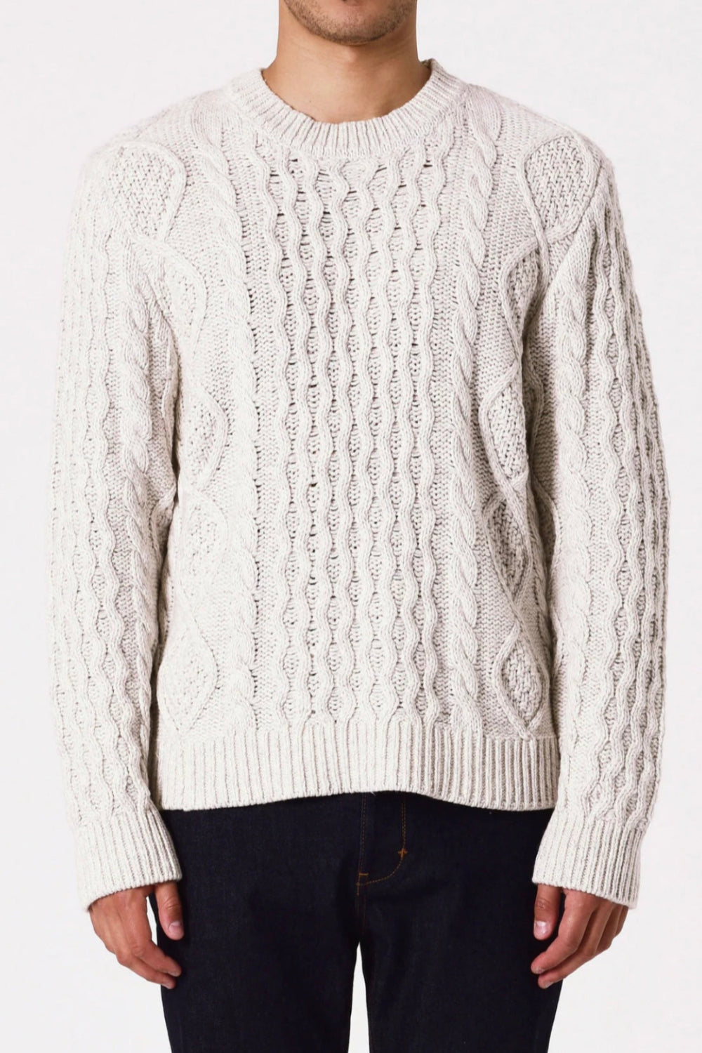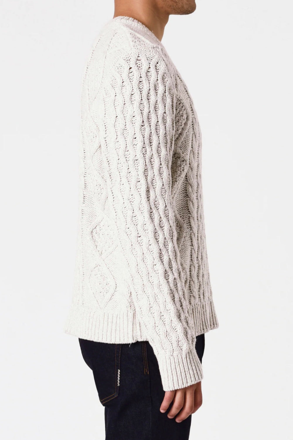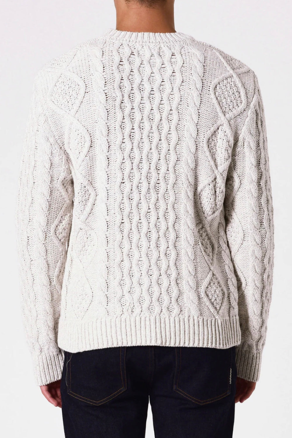 This cable knit draws inspiration from the quality and weight of vintage knitwear, updated with a modern aesthetic.
