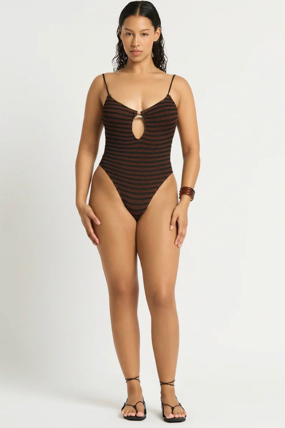 The Ring Arden One Piece is a tie back, keyhole one piece with ring detail. Handmade in Sydney, Australia from The Authentic Crinkle™.