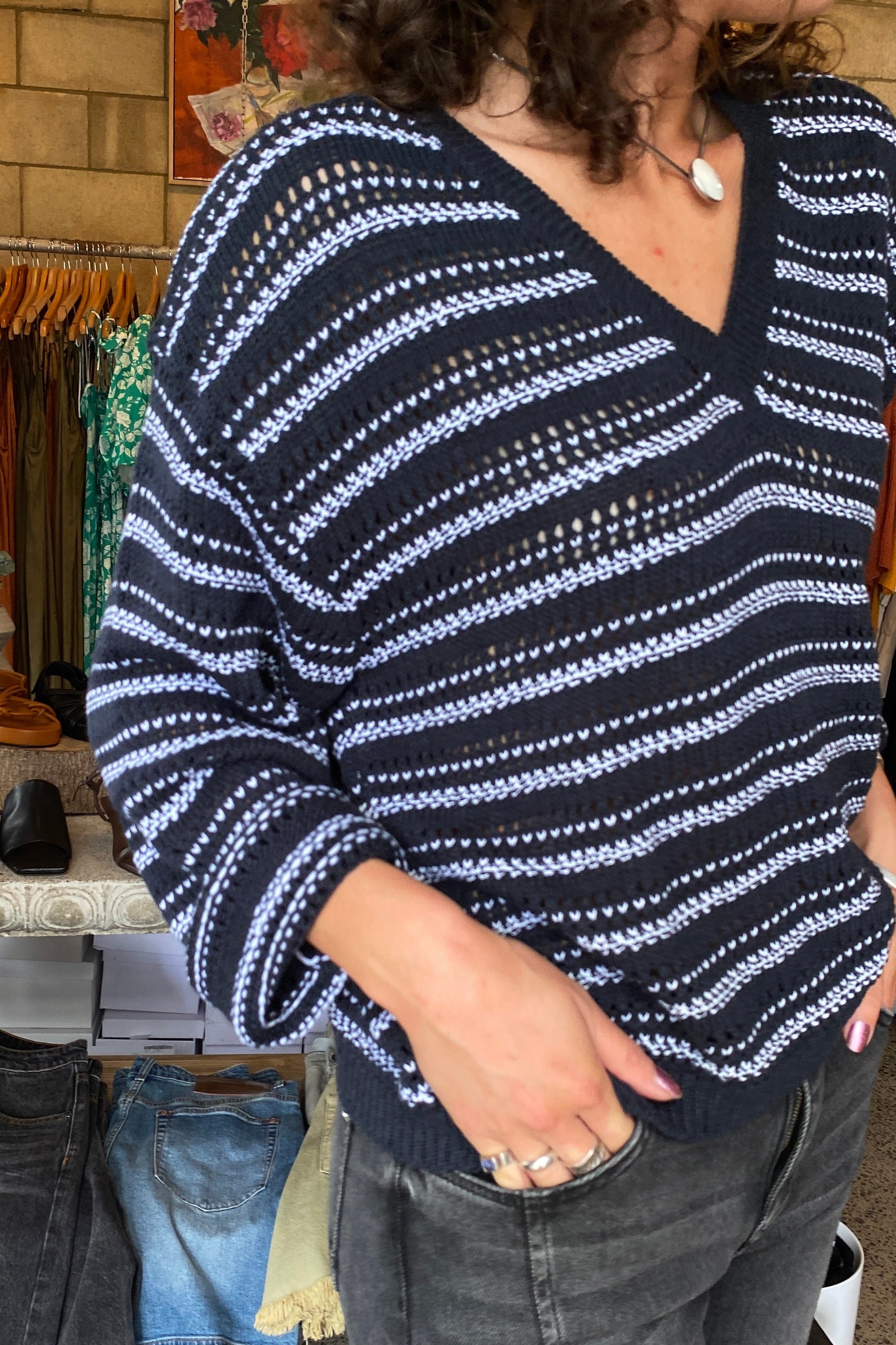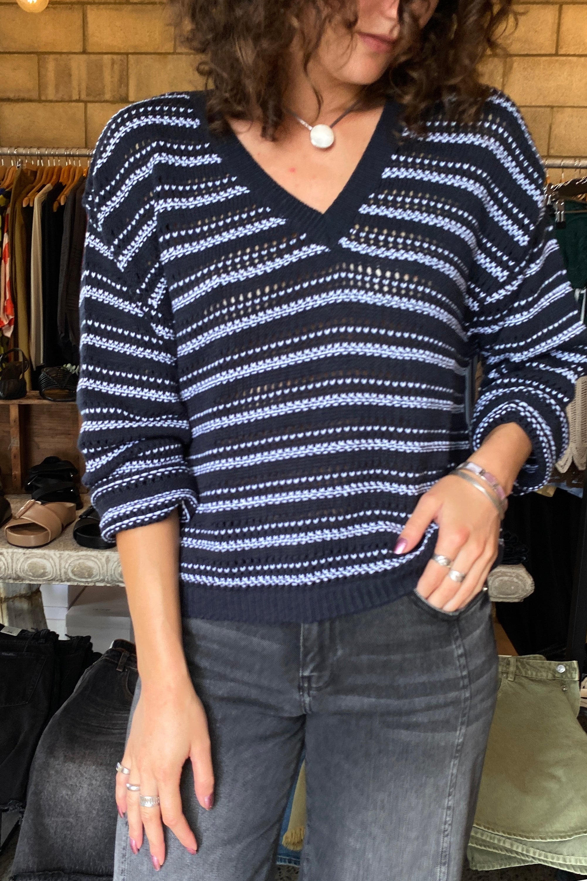 Beautifully made Tatano V-neck sweater, with a flattering V-neck and two colour open weave fabrication, perfect for everyday wear. Taking cues from Missoni style knits for summer.