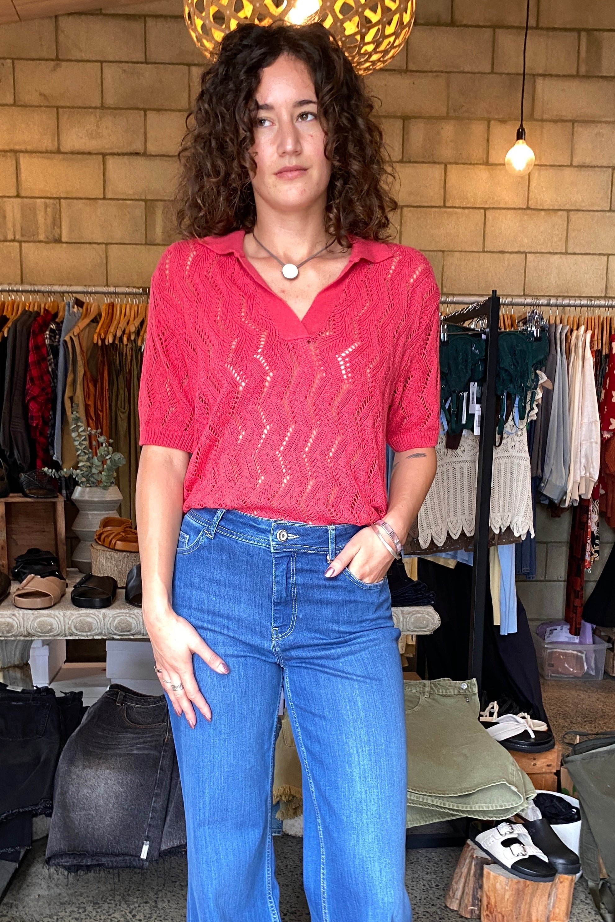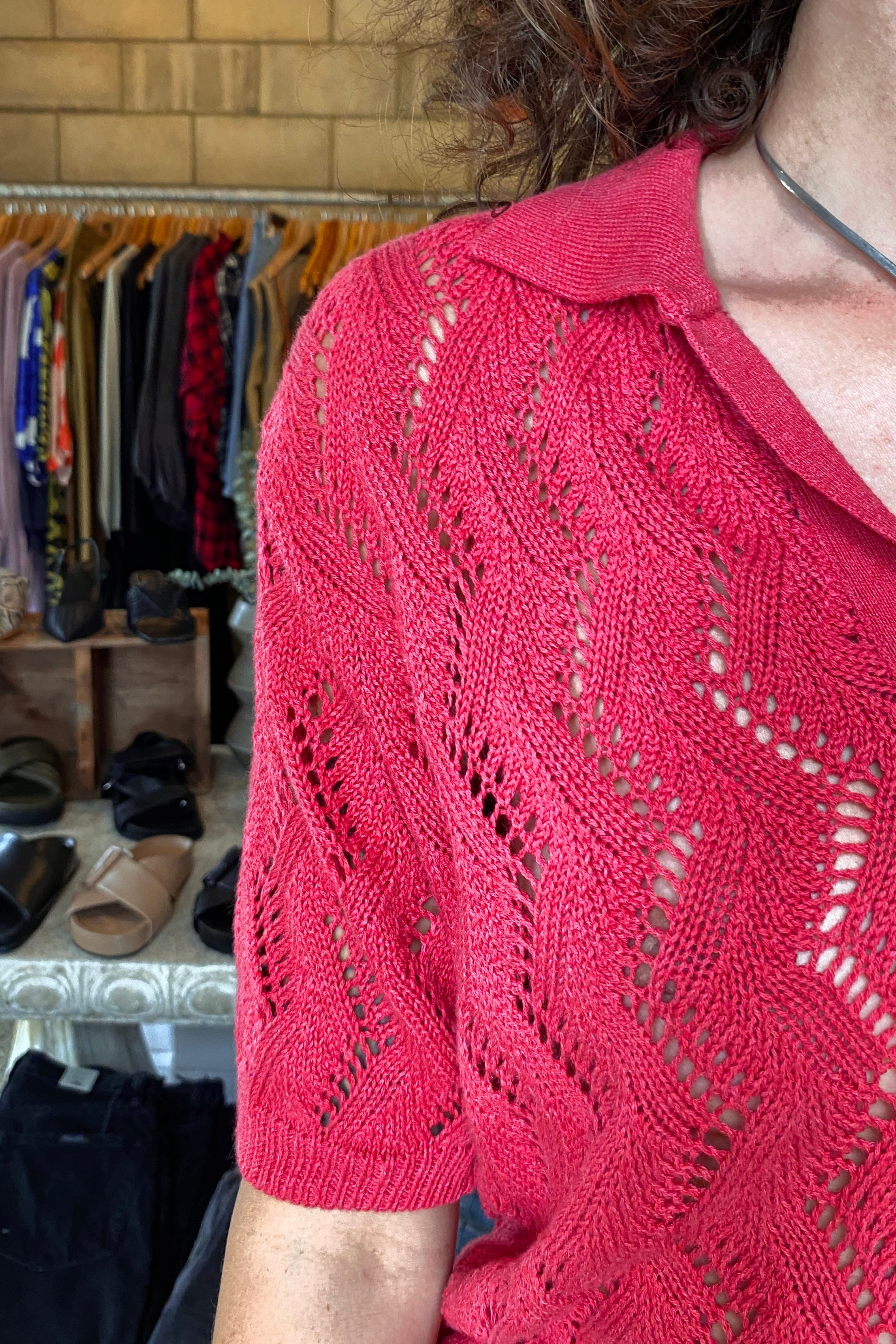 The Tatano Vines Polo features a timeless polo silhouette with a vee neckline, crafted from 100% cotton. Constructed in a lacy pattern knit wit a ribbed collar, cuffs, and hem, all in a lovely rose pink shade.