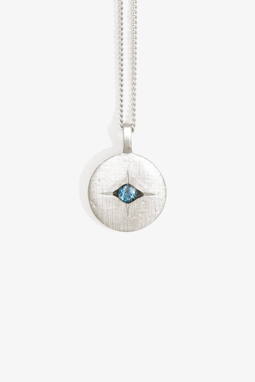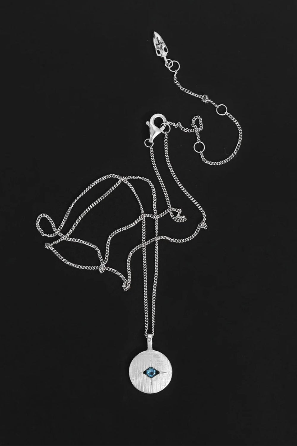 The Mavi Eye Necklace is crafted from recycled sterling silver and features a cross-brushed pendant suspended from a single curb chain. The carved evil eye motif—set with London blue topaz—forms a modern amulet, long associated with protection and warding off harm.