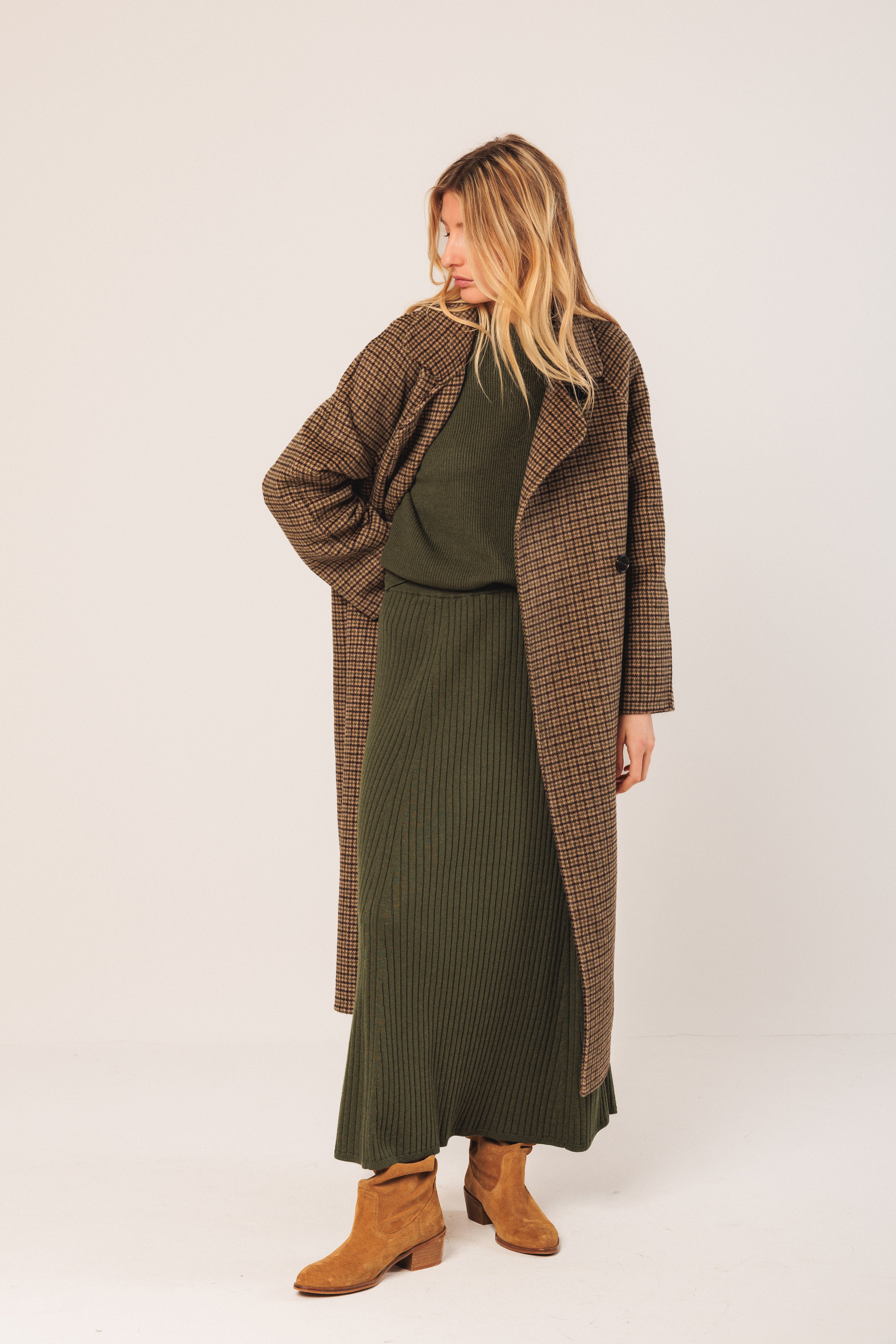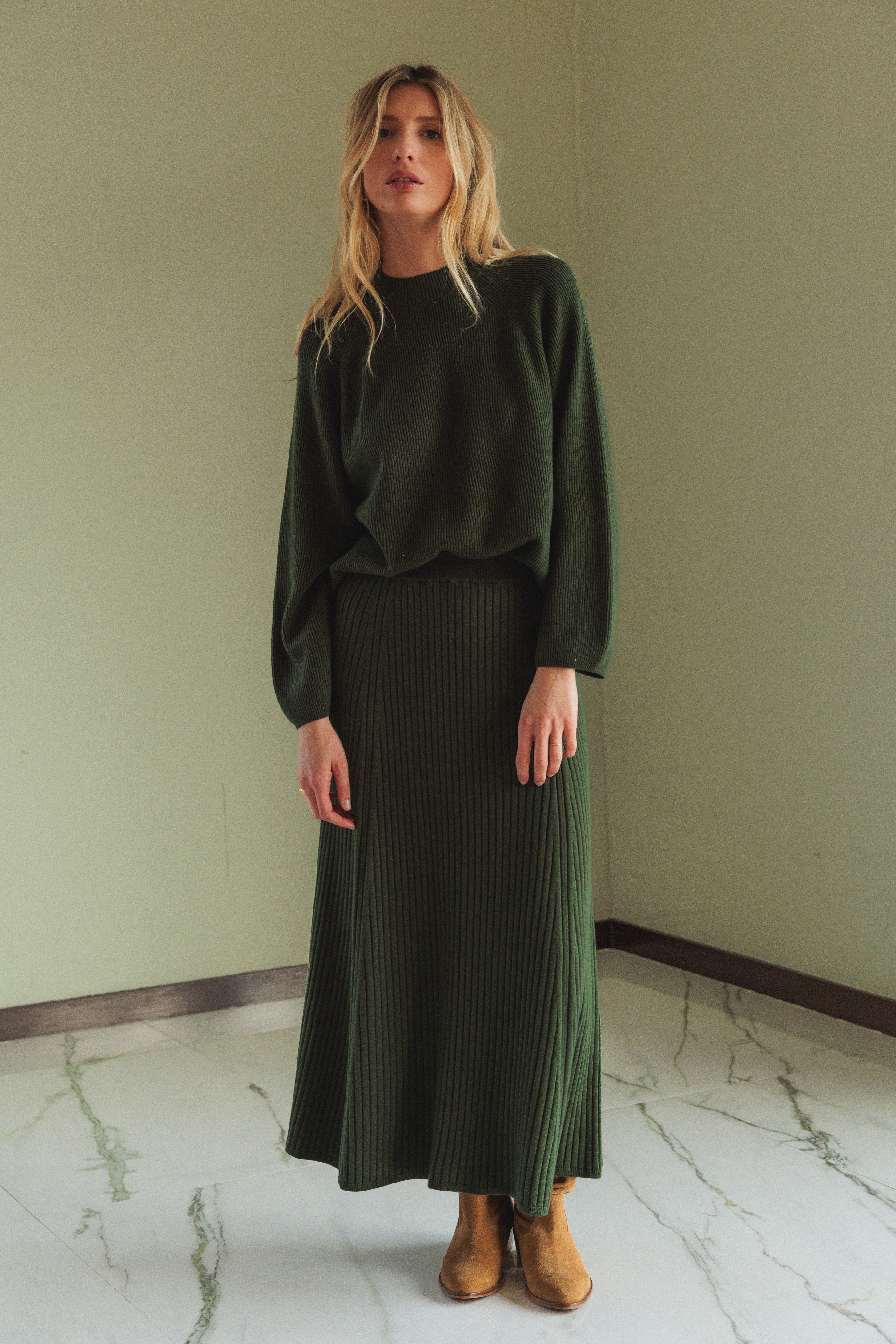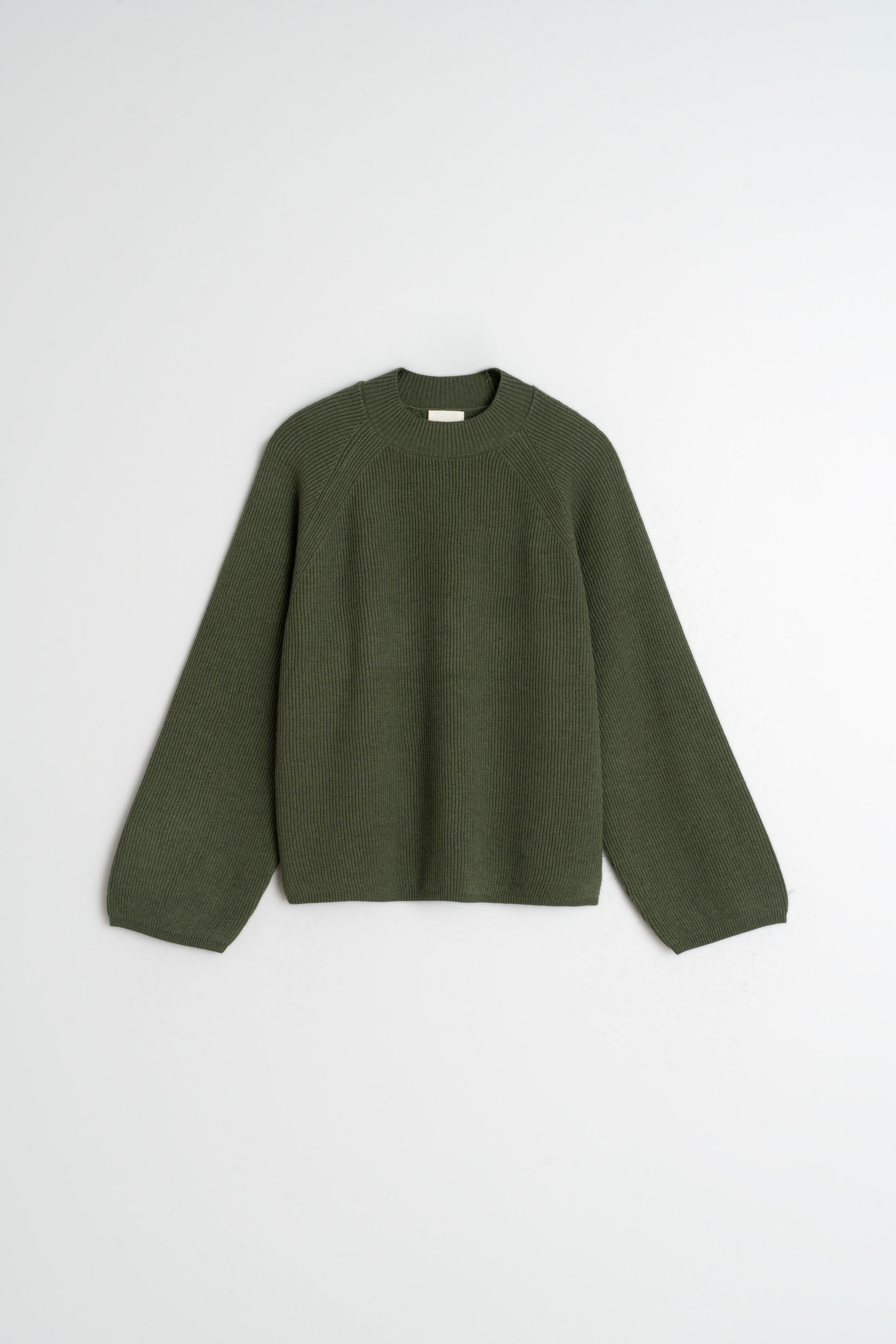 Boxy ribbed sweater with a Perkins collar and side slits. The sleeves are raglan style and slightly wide. Combine it with any garment in your closet or with the matching skirt.