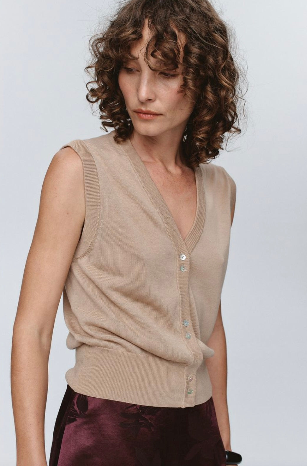 A sleeveless vest constructed from a fine-gauge knit. Features a deep V-neckline and center front placket with contrast shell buttons arranged in a paired configuration. Finished with a wide ribbed hem for structural integrity and subtle textural contrast.
