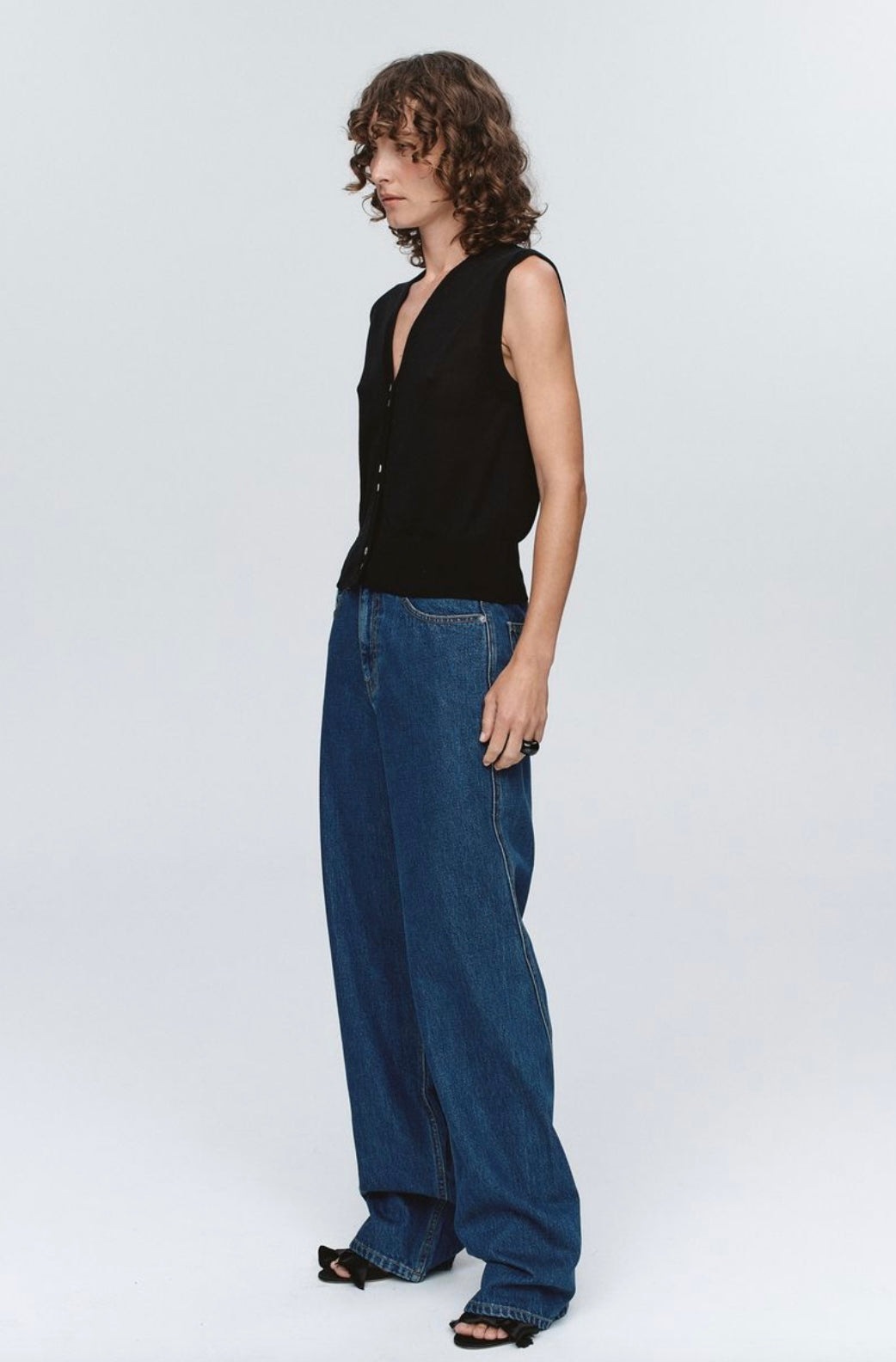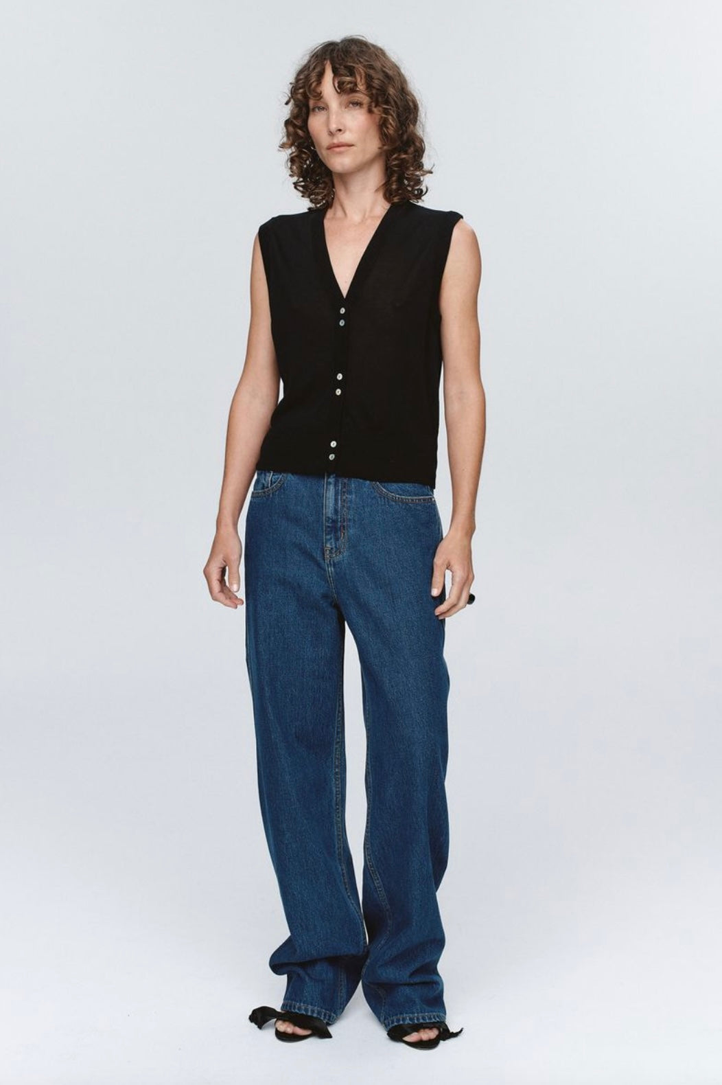 A sleeveless vest constructed from a fine-gauge knit. Features a deep V-neckline and center front placket with contrast shell buttons arranged in a paired configuration. Finished with a wide ribbed hem for structural integrity and subtle textural contrast.
