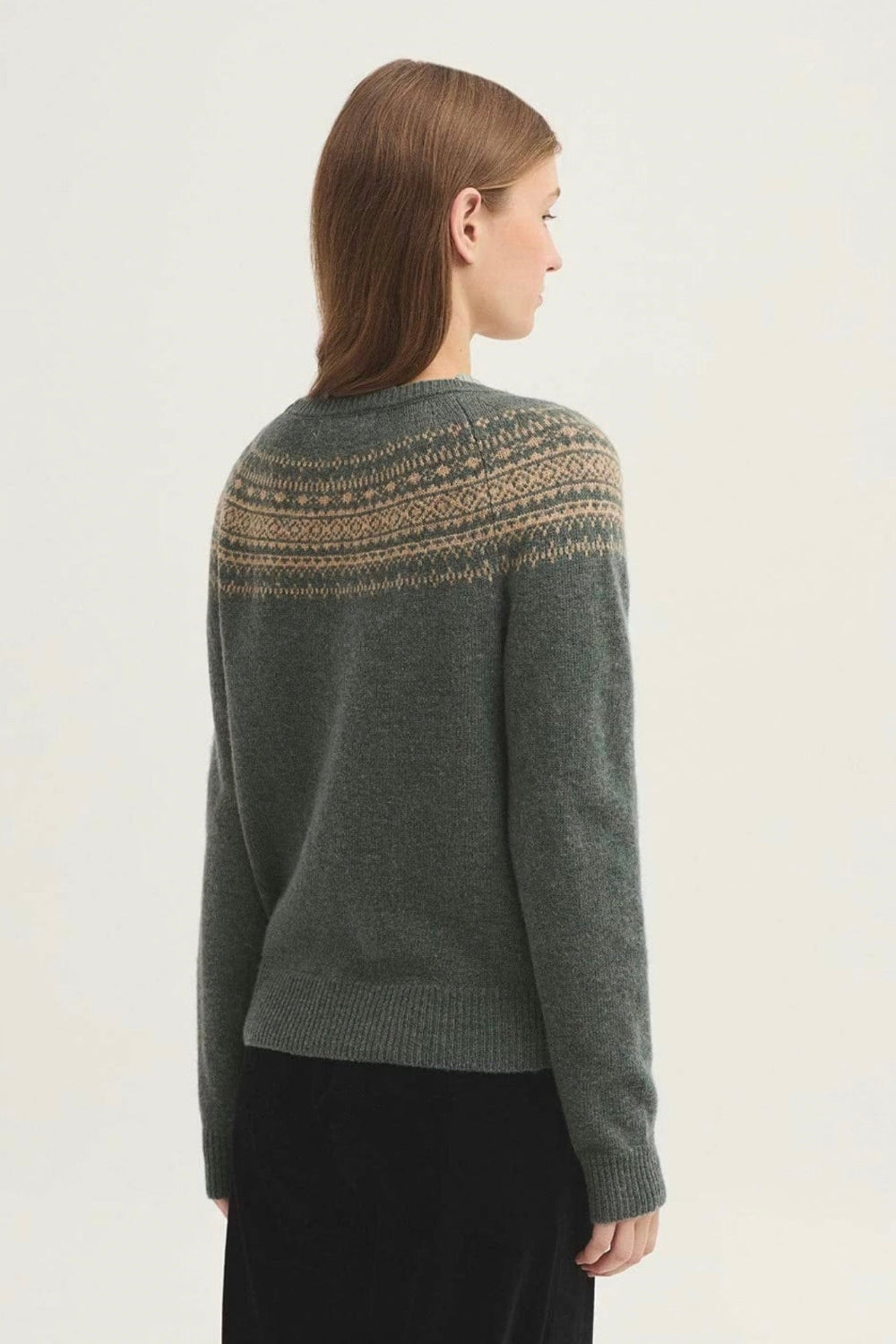 Wrap yourself in warmth with this delightful wool blend sweater, showcasing a cheeky Greek-inspired jacquard pattern against a sophisticated smoke green backdrop. The generous raglan sleeves and fitted ribbed edges deliver a flattering silhouette that's ideal for mixing and matching through any season. With its classic crew neckline, this piece transitions effortlessly from casual denim days to dressed-up occasions—your new go-to for cosy comfort that doesn't compromise on style.