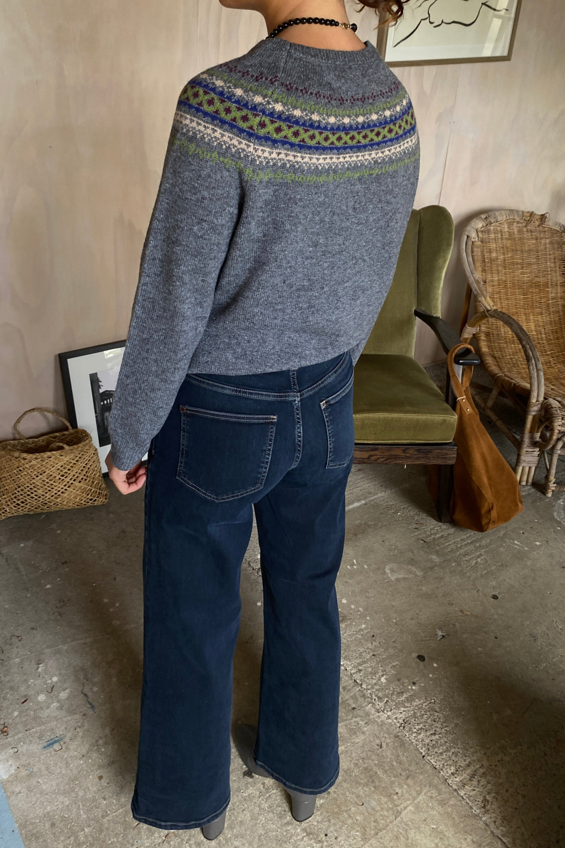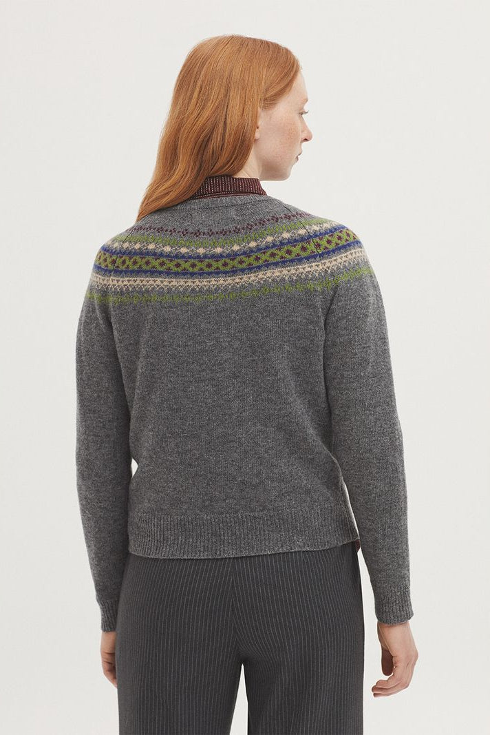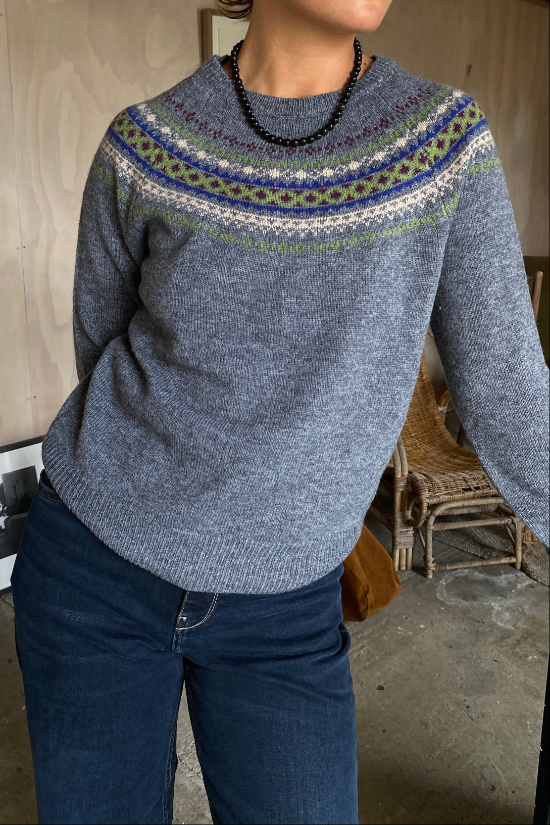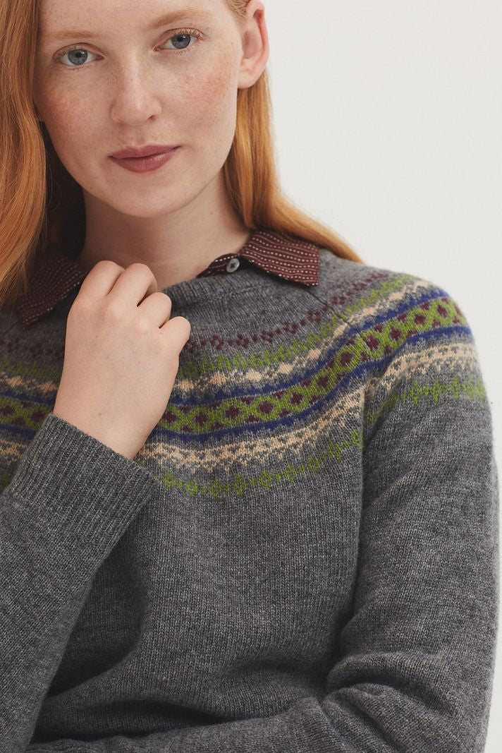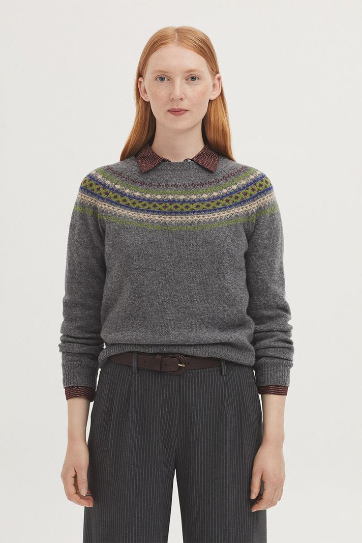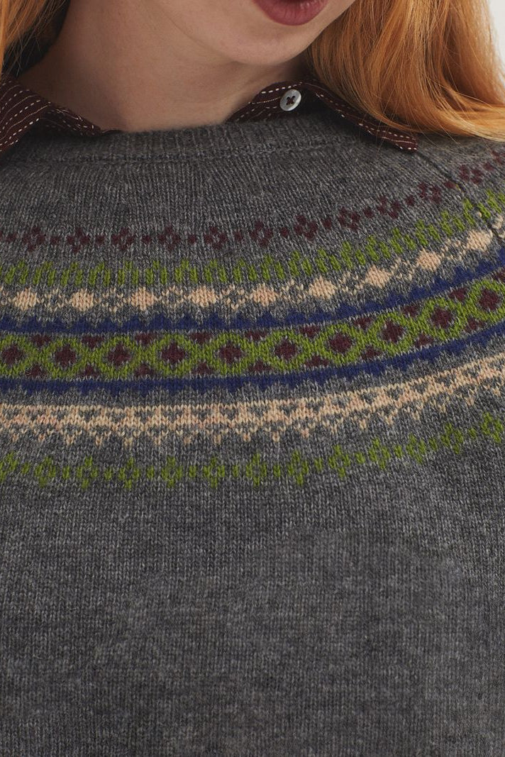 Cosy up in this charming wool blend sweater featuring a playful jacquard 'Greek' fairisle intarsia detail on a neutral grey base. The relaxed raglan sleeves and snug ribbed trim create the perfect fit for layering through the seasons. A timeless round neck design makes it endlessly versatile—pair it with your favourite jeans or dress it up for something special.
