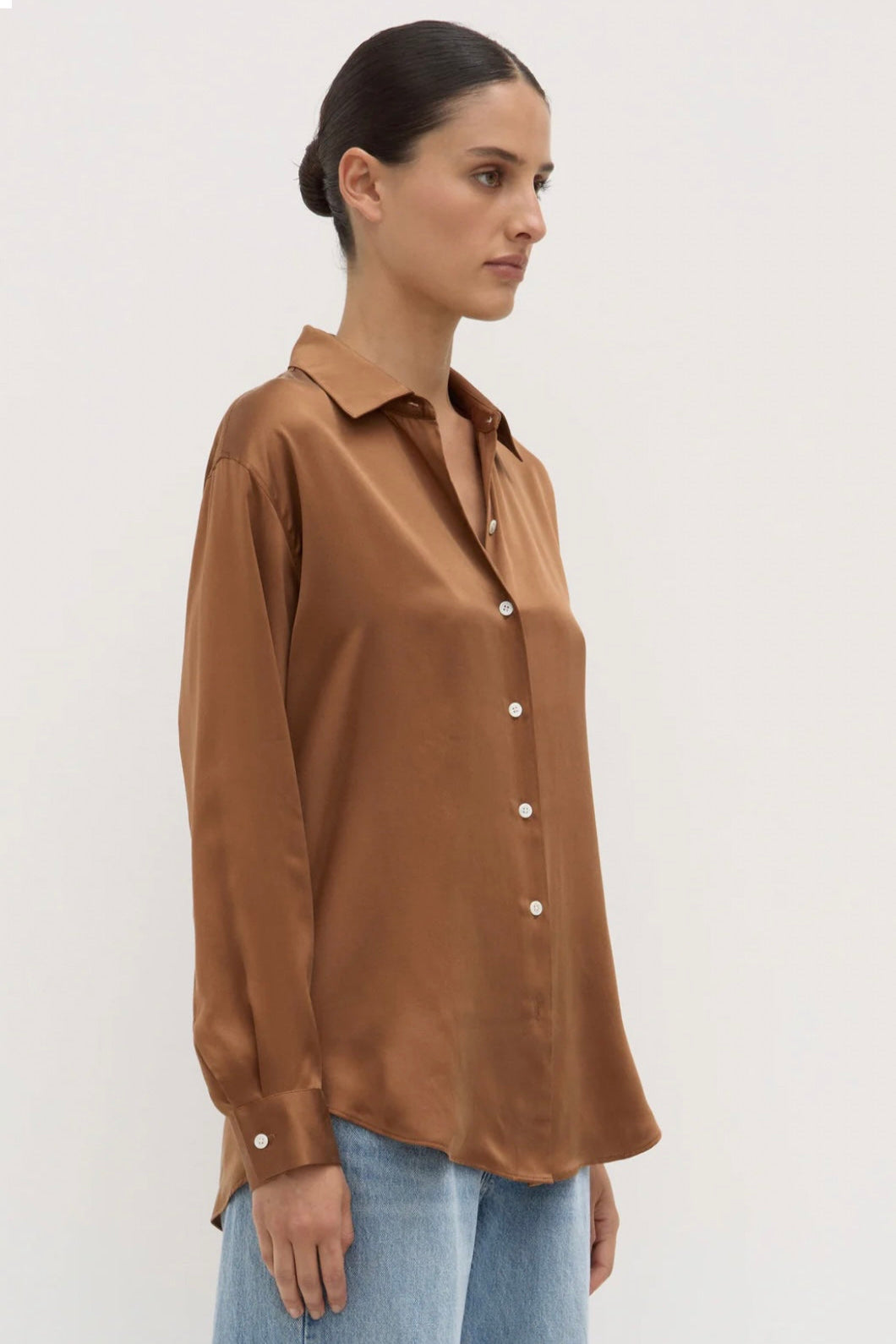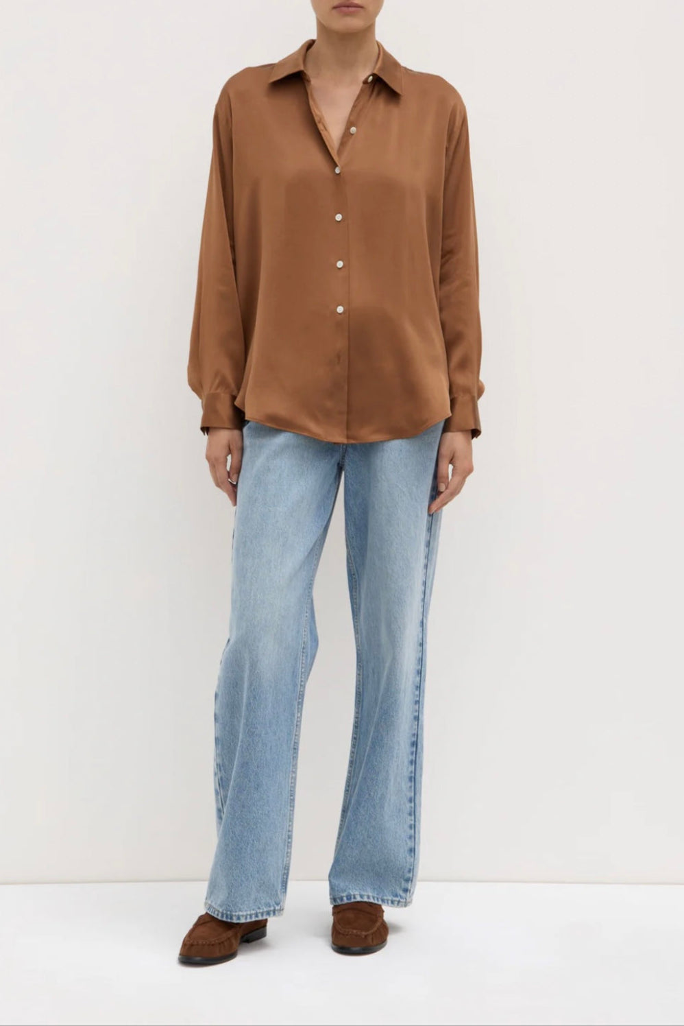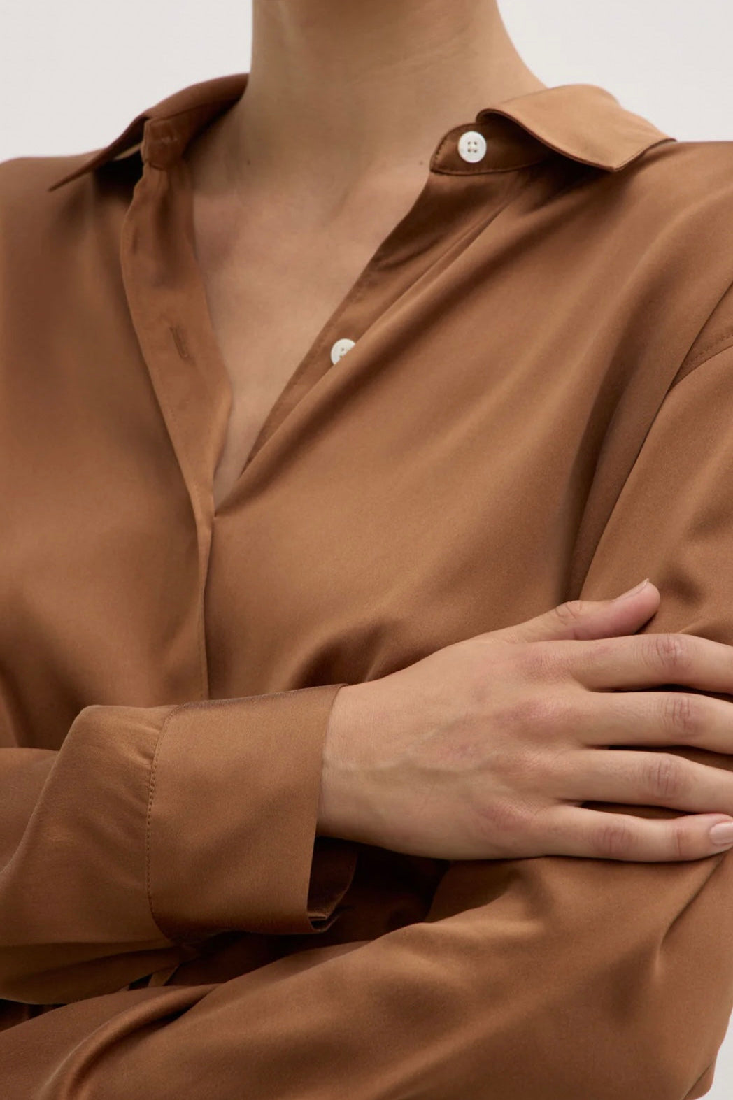 A relaxed, looser fit collared shirt offering ease of movement; crafted from 100% silk. Features mother of pearl buttons, a centre-back seam and sleeve placket detailing.