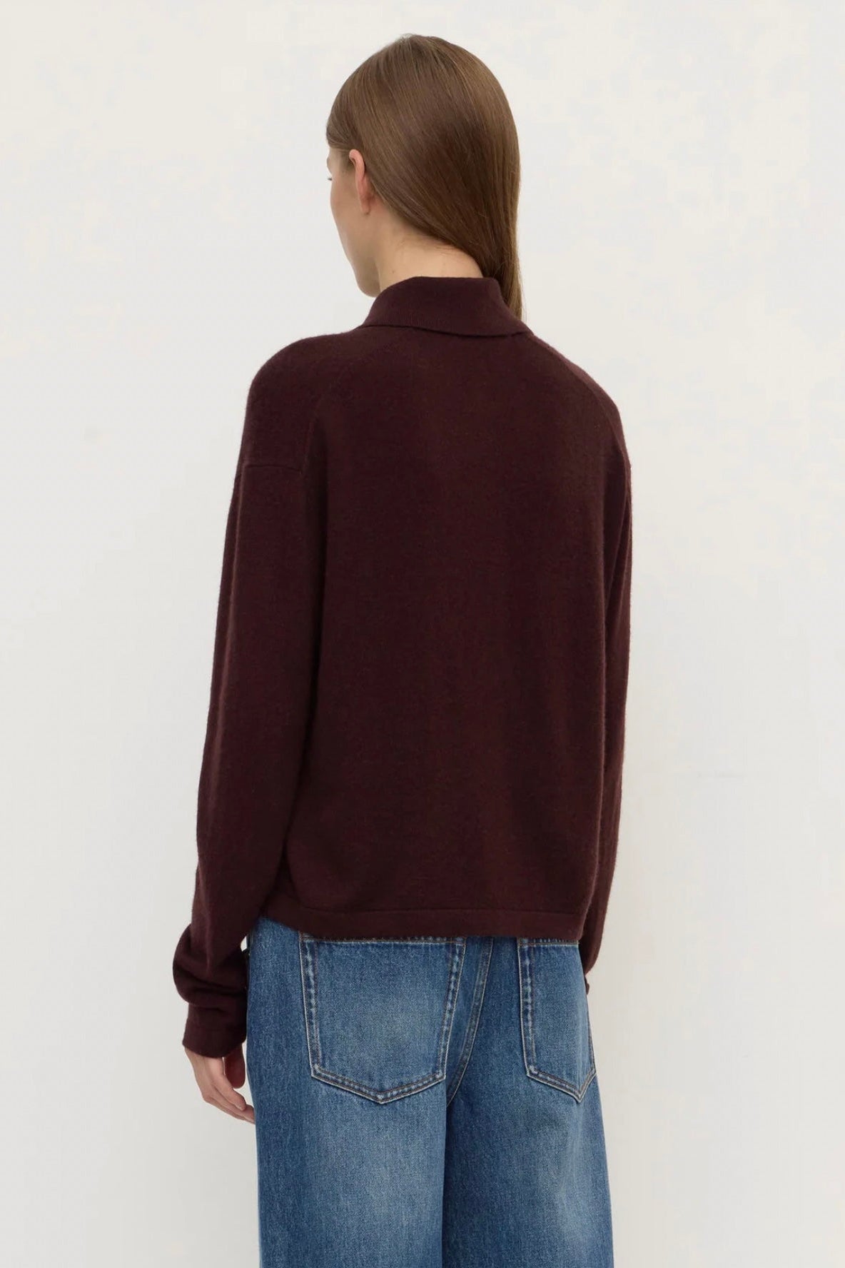 The Wool Cashmere Knit Cardigan in dark merlot is a button up knit made from a soft wool cashmere blend, featuring a relaxed collar and dropped shoulder.