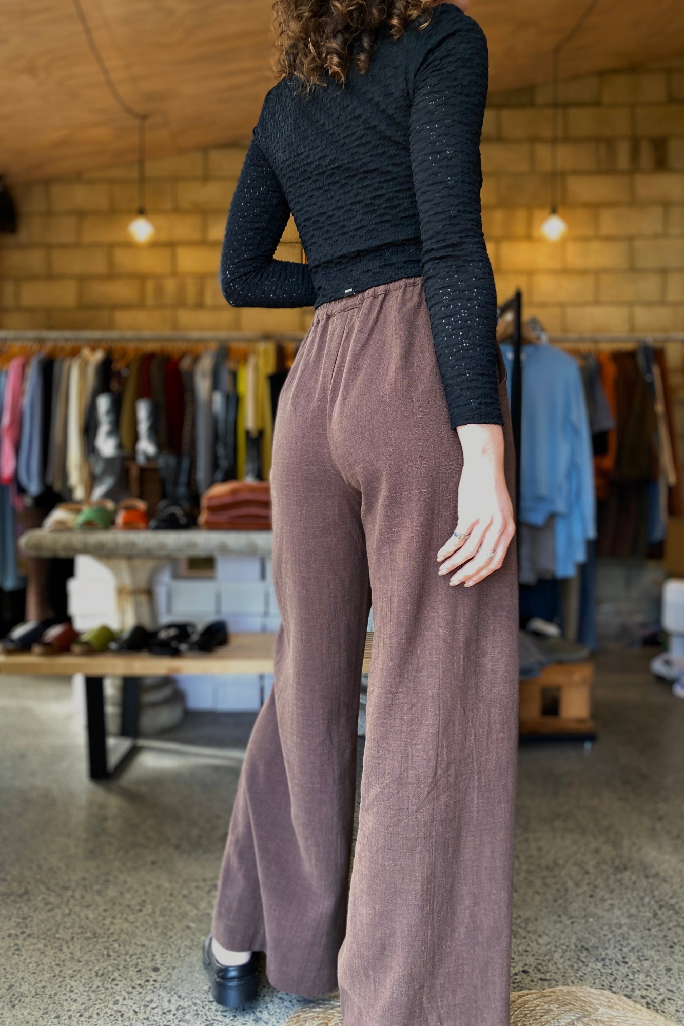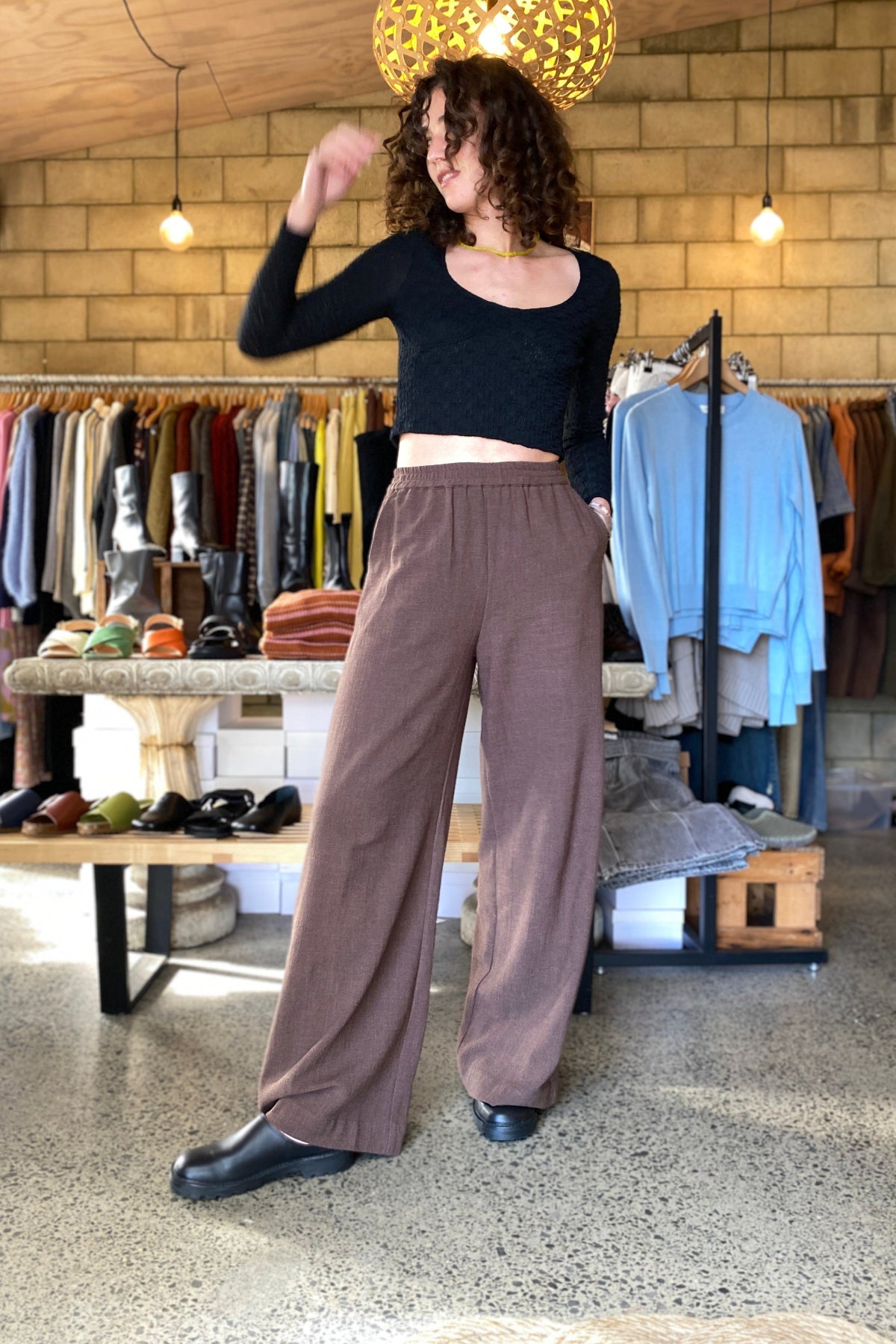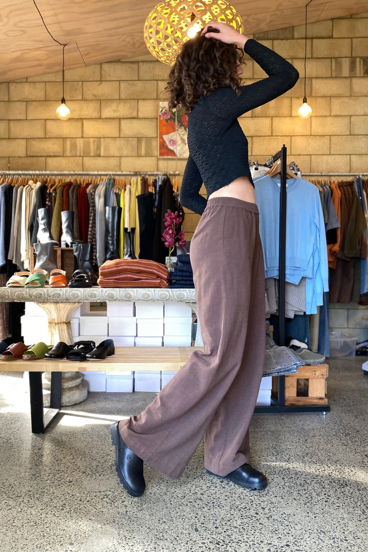 Mira Wilder Pant is wider leg pant, side pockets with elasticated waist that can sit high / mid waist. Flattering style on pretty much everyone.