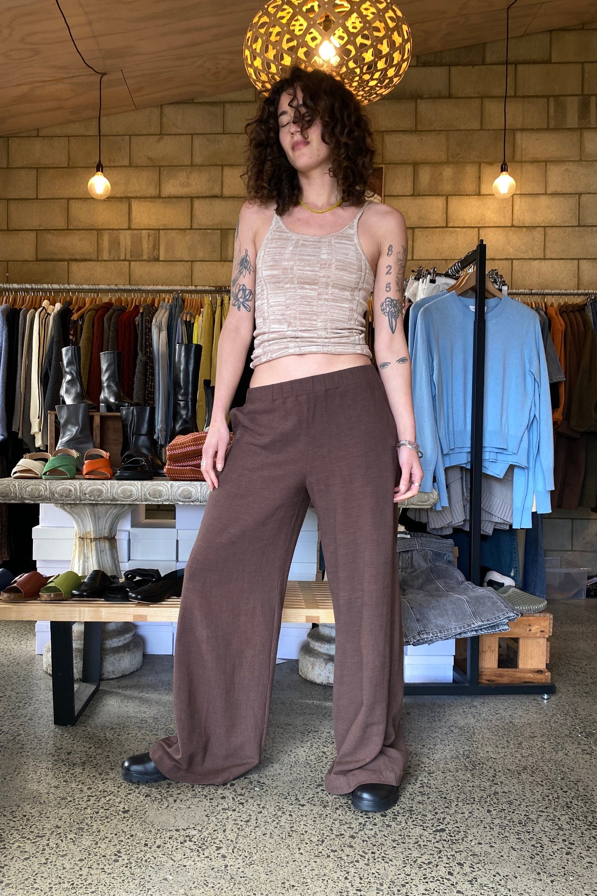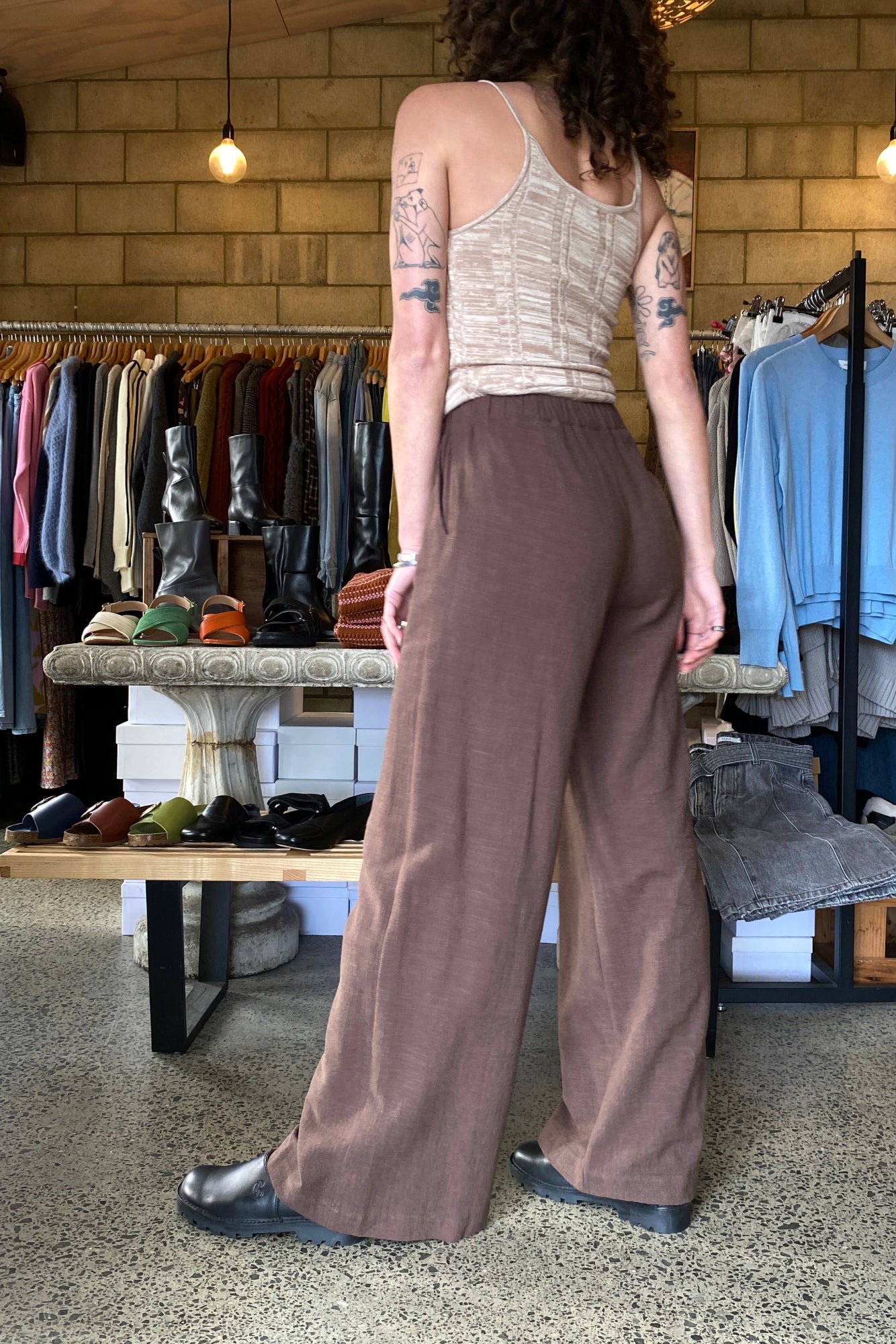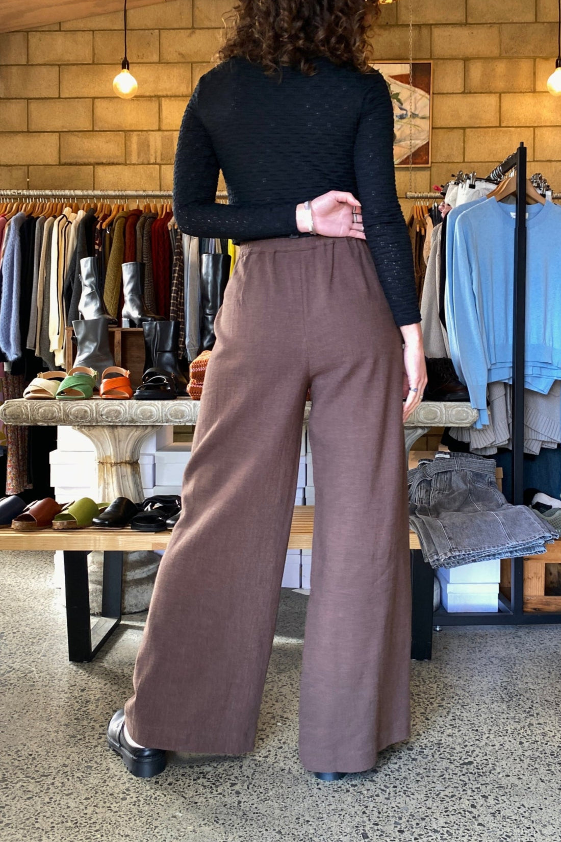 Mira Wilder Pant is wider leg pant, side pockets with elasticated waist that can sit high / mid waist. Flattering style on pretty much everyone.