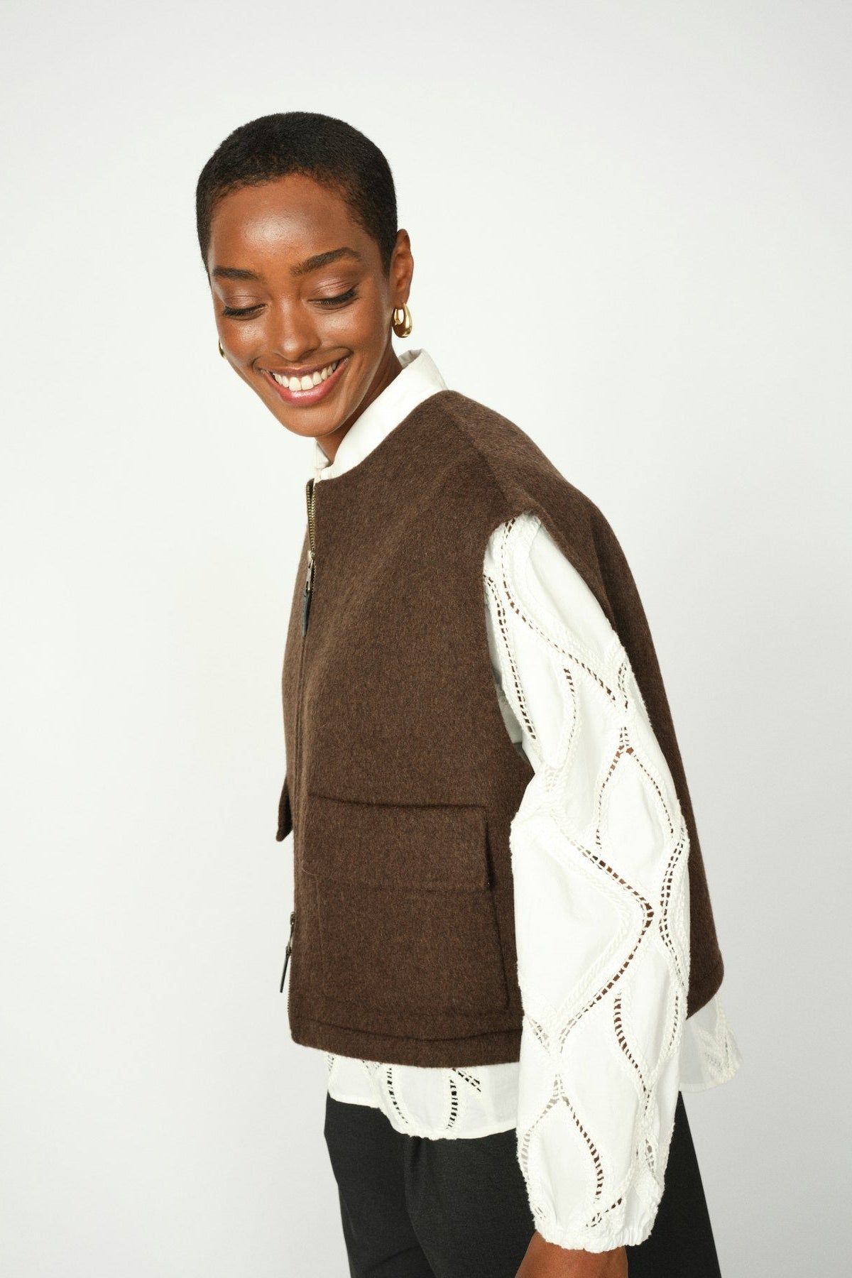 Stay stylish and warm with this chic mélange wool vest, designed for effortless layering. The zipper closure and adjustable drawstrings at the hem ensure a perfect fit while adding a modern touch. Featuring practical flap pockets, this vest is a versatile addition to any wardrobe, seamlessly blending function with contemporary style.