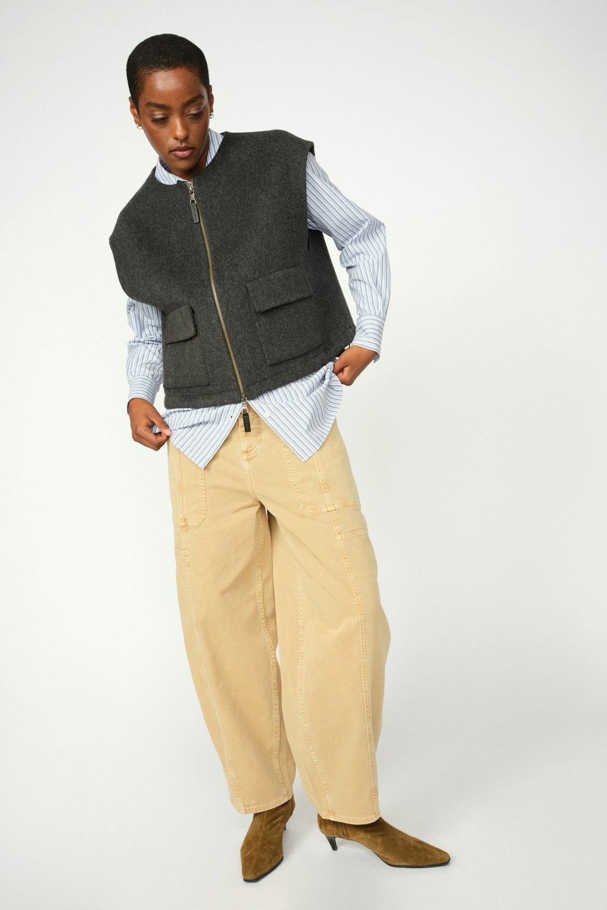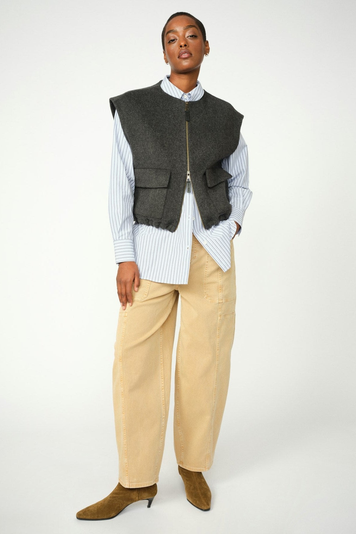 Stay stylish and warm with this chic mélange wool vest, designed for effortless layering. The zipper closure and adjustable drawstrings at the hem ensure a perfect fit while adding a modern touch. Featuring practical flap pockets, this vest is a versatile addition to any wardrobe, seamlessly blending function with contemporary style.